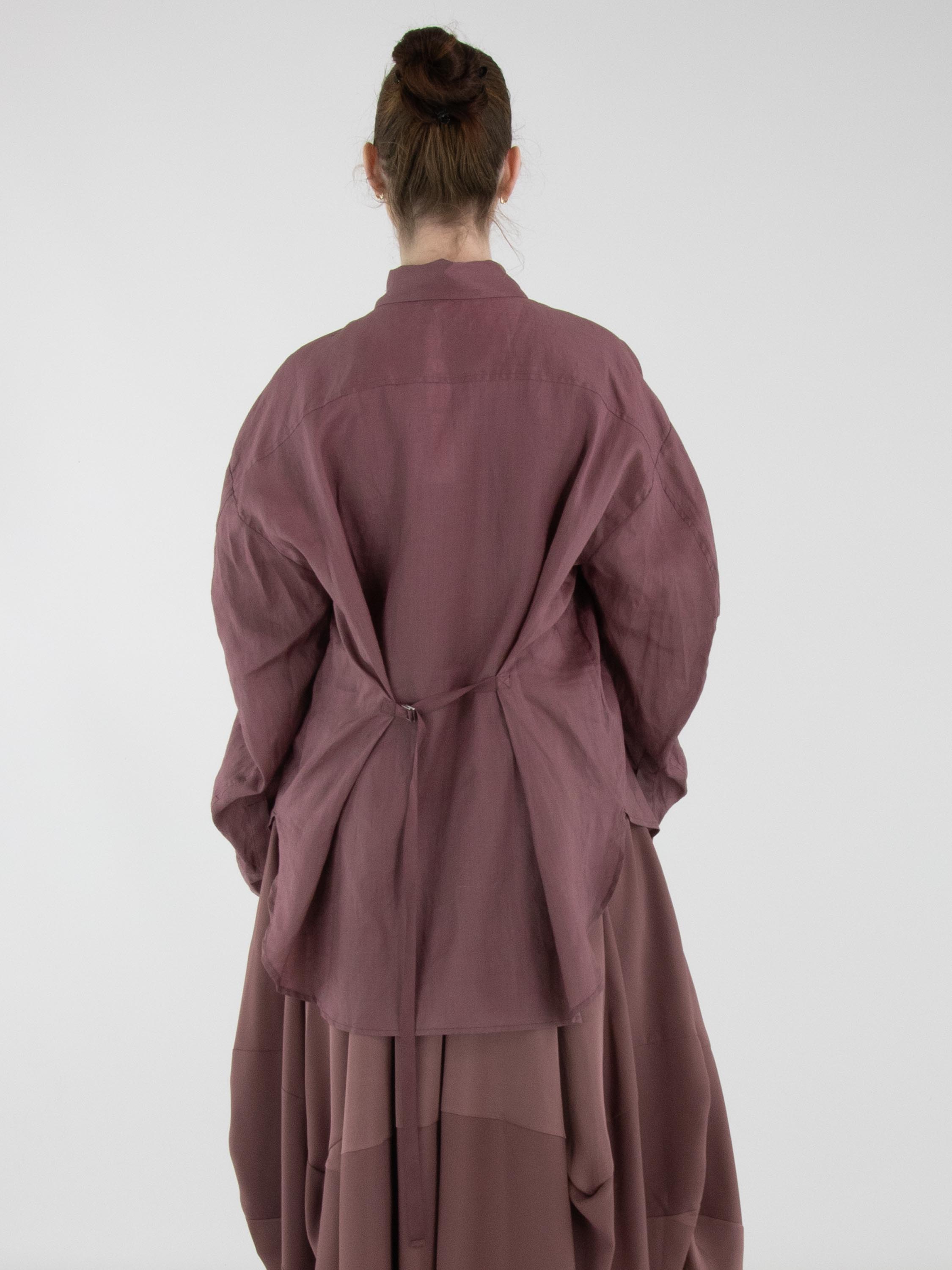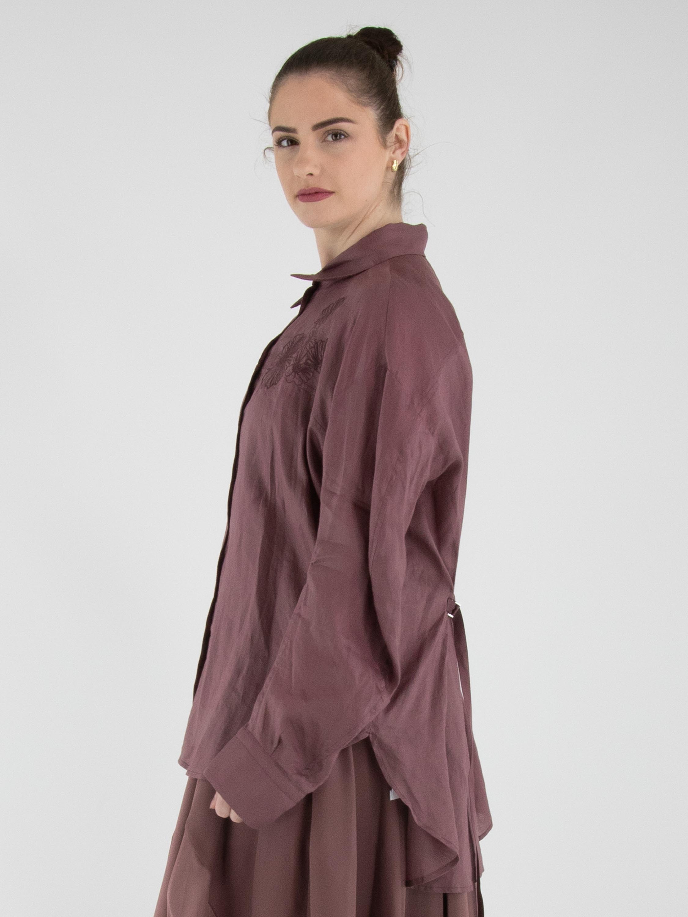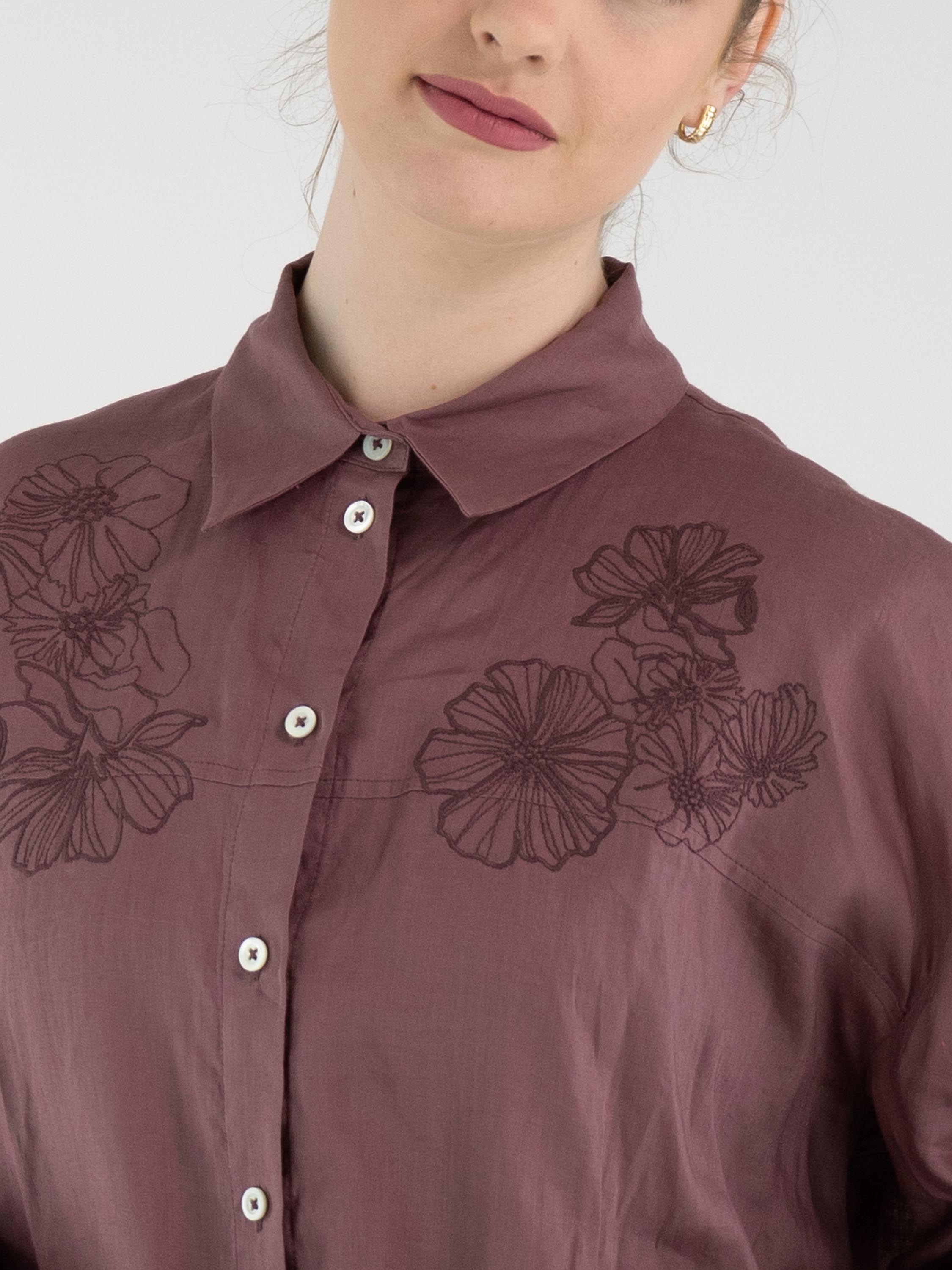 Eine weit geschnittene Bluse von High in Mauve. Oberhalb der Brust, knapp unter den Schultern, ist eine florale Stickerei eingearbeitet. Auf Taillenhöhe befindet sich ein schmaler Gürtel aus demselben Stoff wie die Bluse, der hinten fest angebracht ist und auf der Rückseite eine taillierte Silhouette ermöglicht. Diese Bluse kann von Hand gewaschen werden.