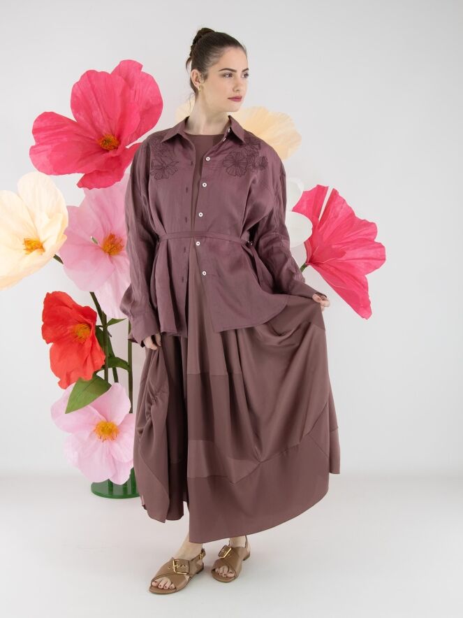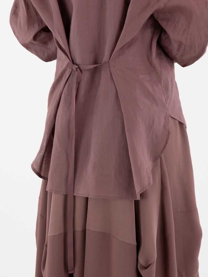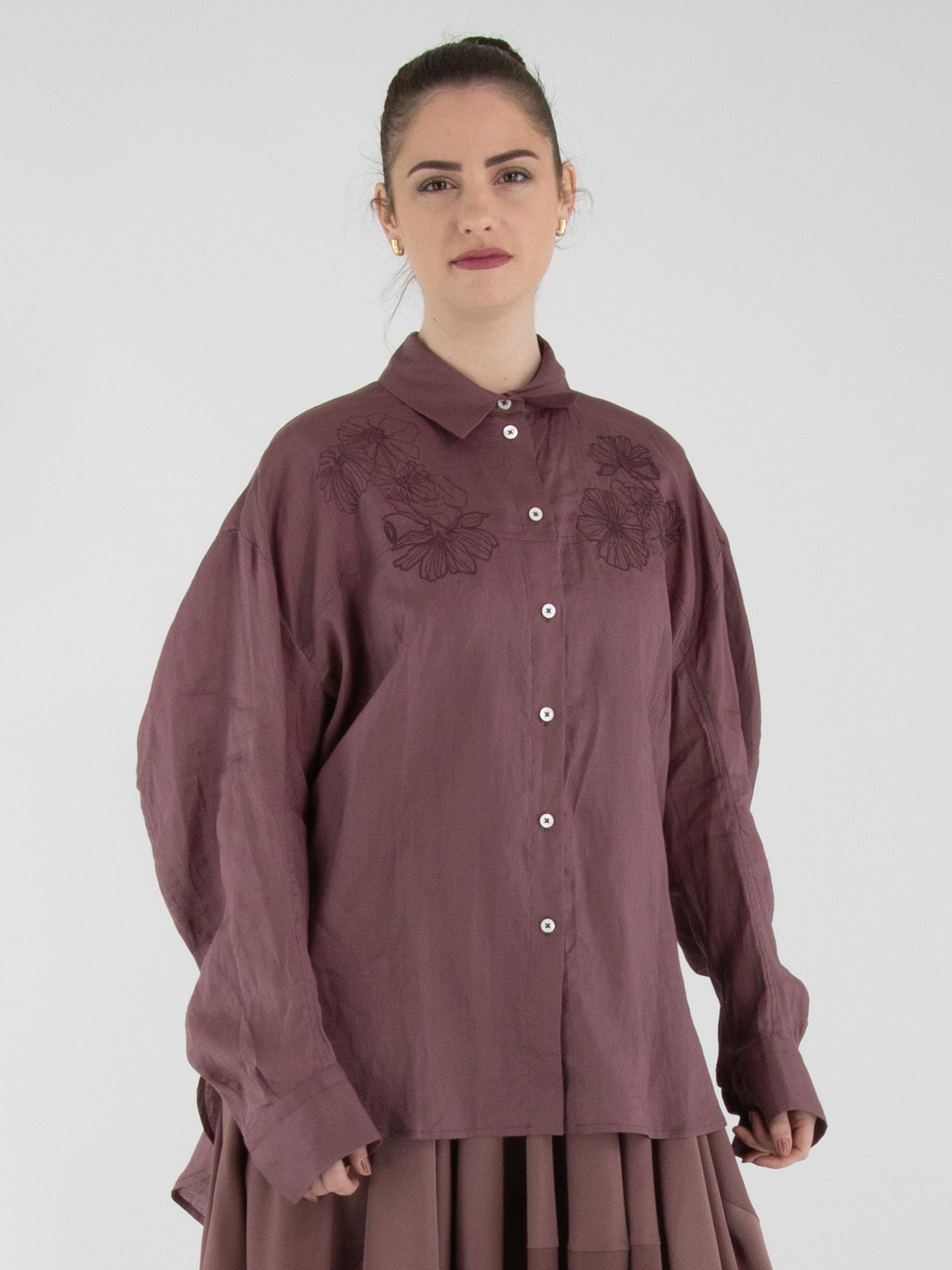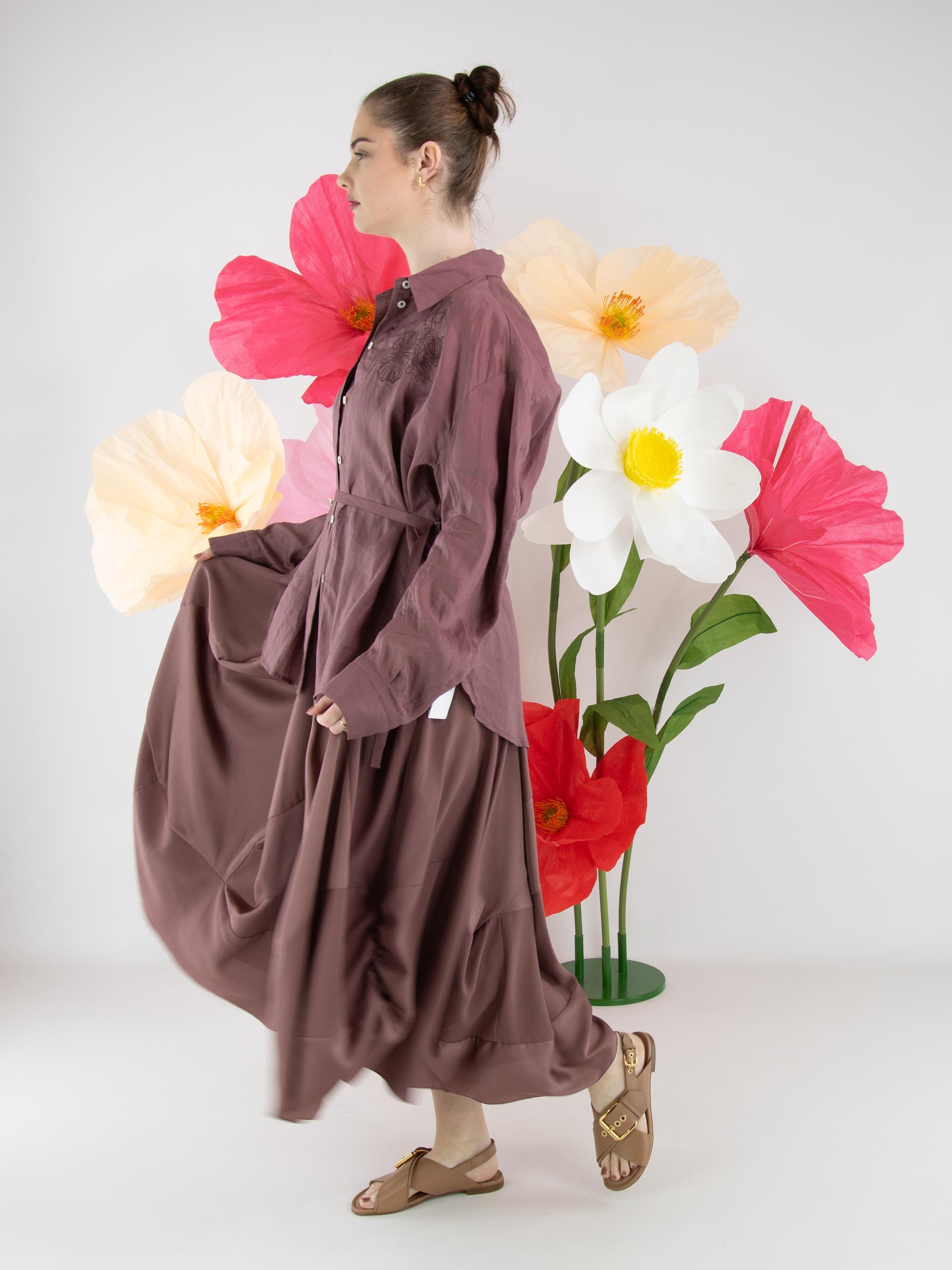Eine weit geschnittene Bluse von High in Mauve. Oberhalb der Brust, knapp unter den Schultern, ist eine florale Stickerei eingearbeitet. Auf Taillenhöhe befindet sich ein schmaler Gürtel aus demselben Stoff wie die Bluse, der hinten fest angebracht ist und auf der Rückseite eine taillierte Silhouette ermöglicht. Diese Bluse kann von Hand gewaschen werden.