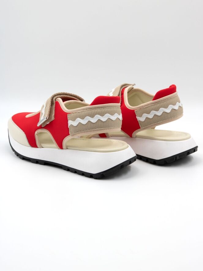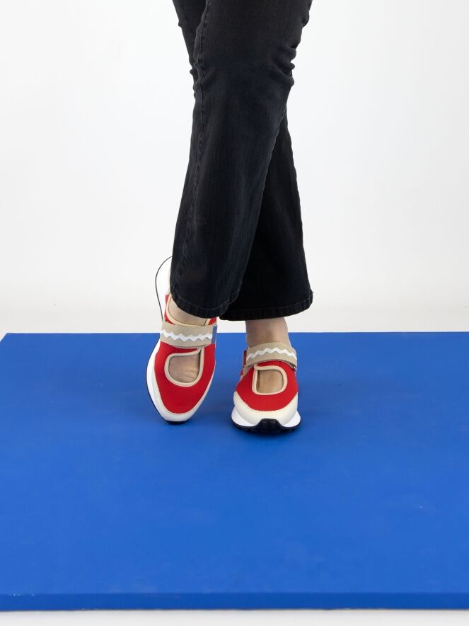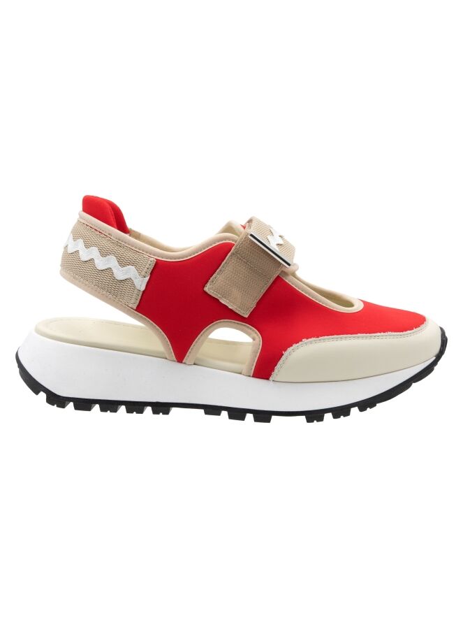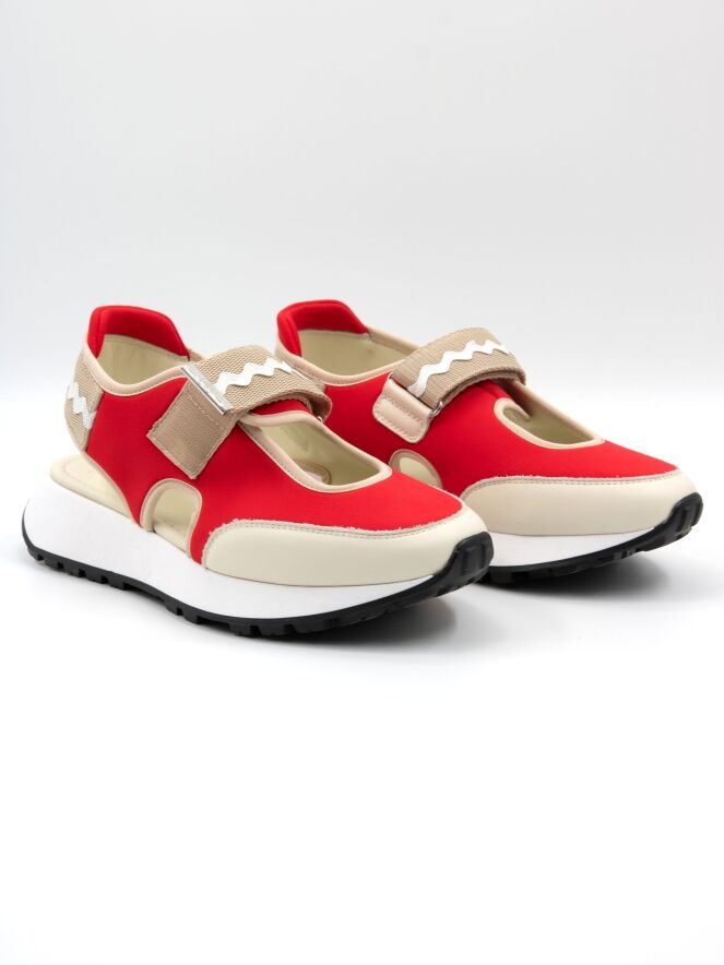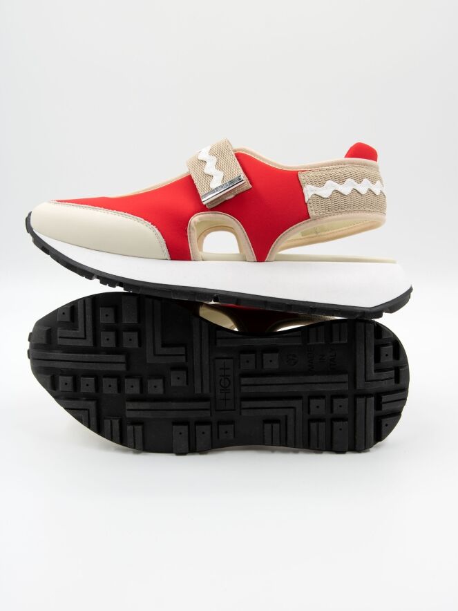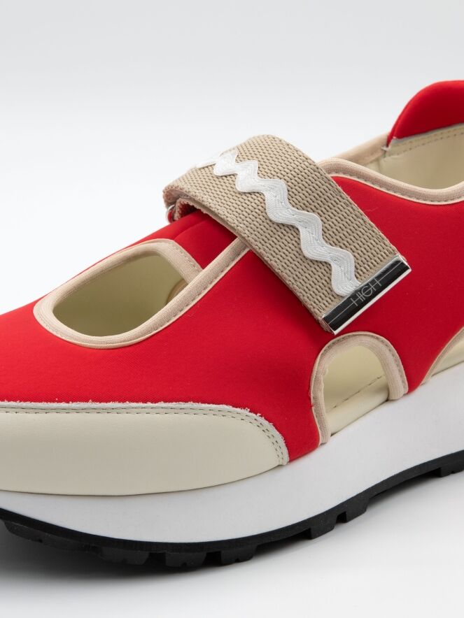 Ein Sneaker mit offener Ferse von High in Rot und Sandfarben. In der Mitte des Vorfußes befindet sich eine Öffnung. Entlang der Kanten verläuft eine sandfarbene Lederbiese. Über den Vorfuß verläuft ein Klettverschluss. Die Sohle ist in einem klaren Weiß gehalten.