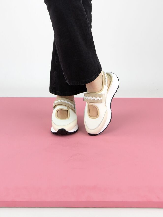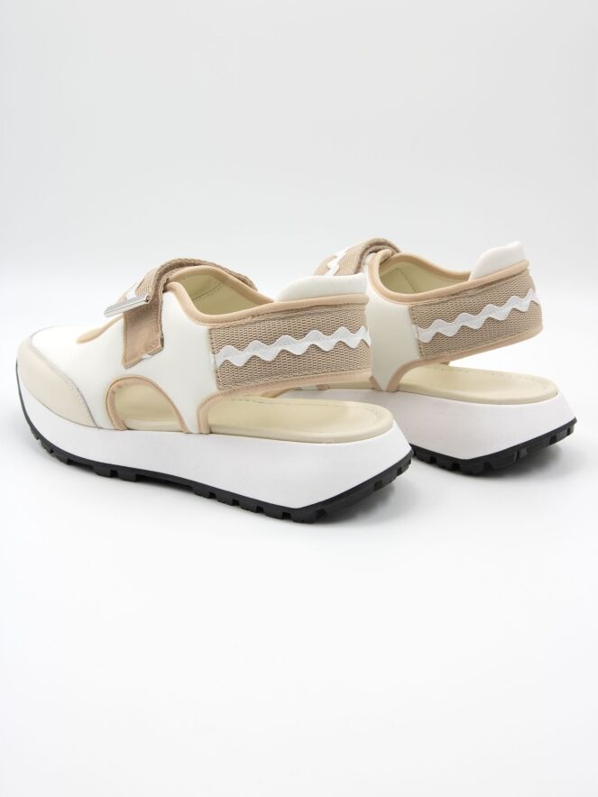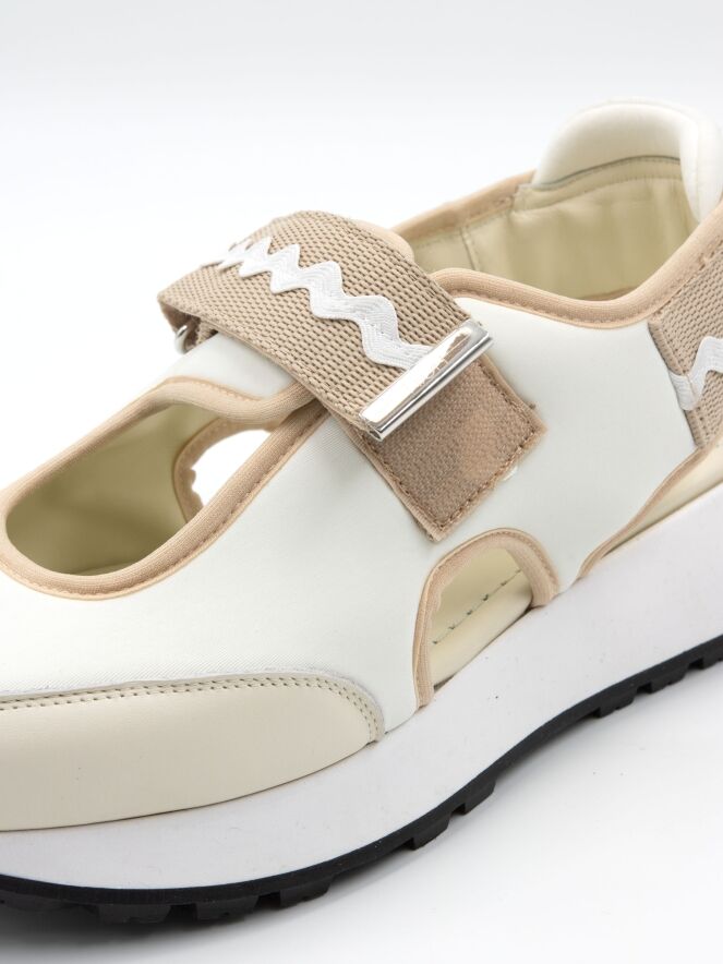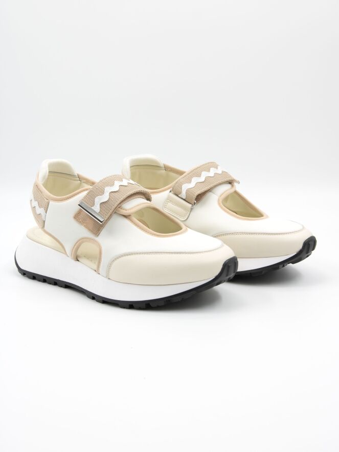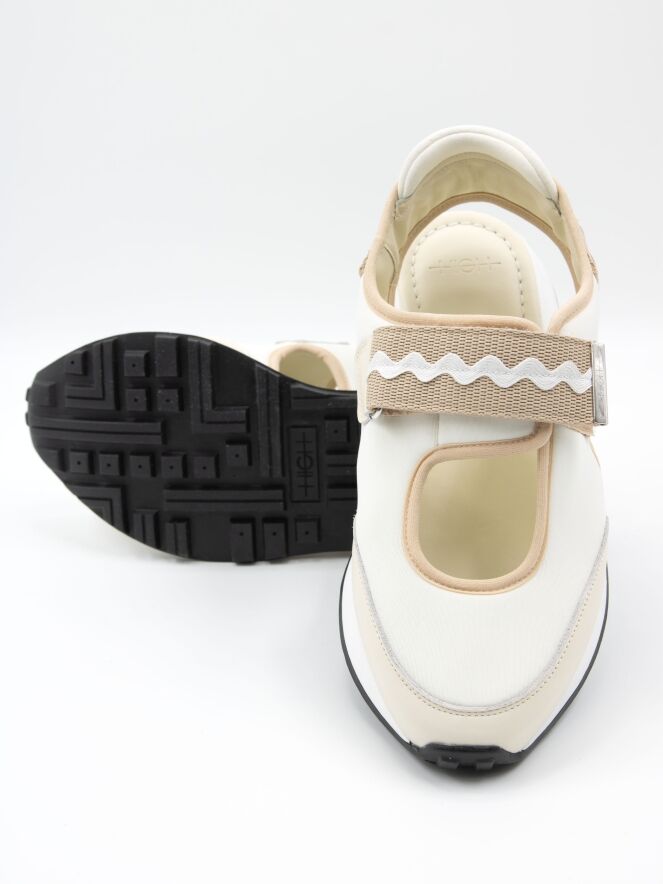 Ein Sneaker mit offener Ferse von High in Cremeweiß und Beige. In der Mitte des Vorfußes befindet sich eine Öffnung. Die Kanten sind mit einer sandfarbenen Lederbiese versehen. Über den Vorfuß verläuft ein Klettverschluss. Die Sohle ist in einem klaren Weiß gehalten.