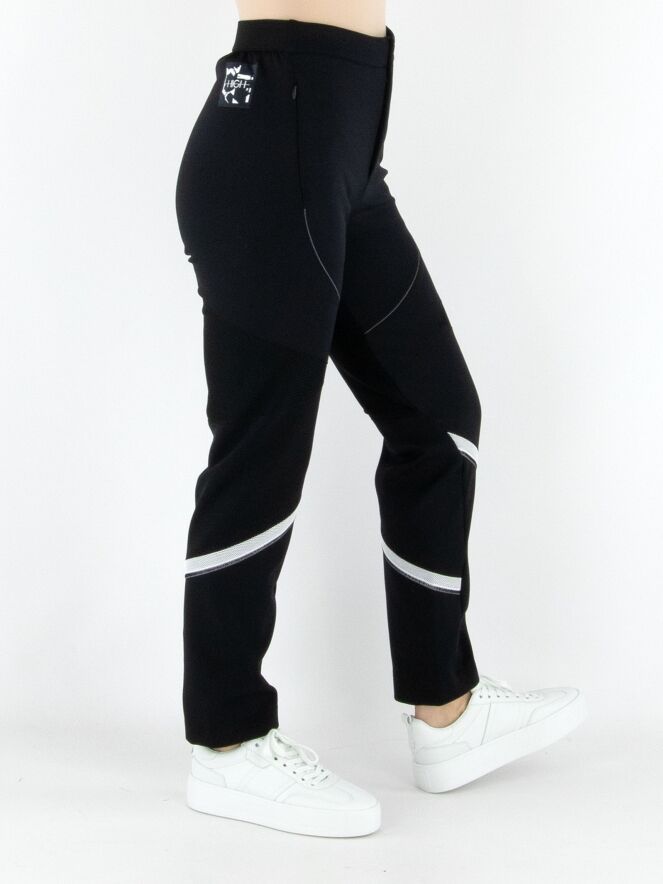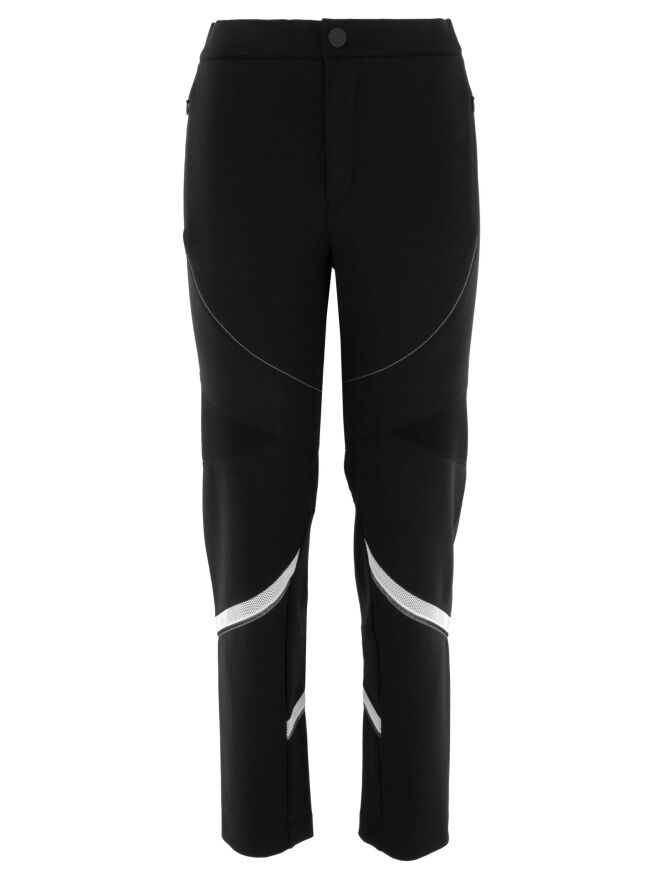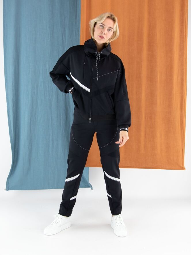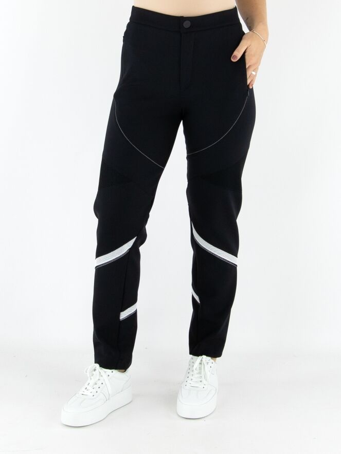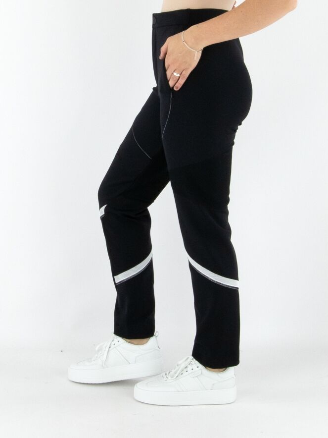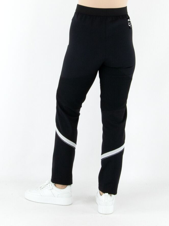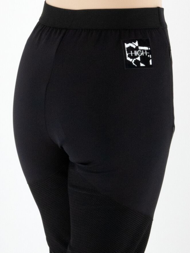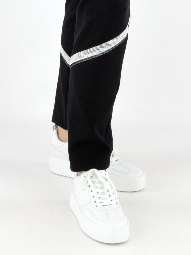 Hose von High in klassischem Schwarz. Der elastische Bund sorgt für angenehmen Tragekomfort, während die Eingrifftaschen mit praktischen Reißverschlüssen versehen sind. Auf Kniehöhe und entlang des Unterschenkels ist ein Netzgewebe in Schwarz-Weiß verarbeitet, das der Hose eine moderne, sportliche Note verleiht. Eine rund verlaufende weiße Naht ab den Taschen unterstreicht das zeitgemäße Design. Diese exklusive Designerhose sollte per Hand gewaschen werden.