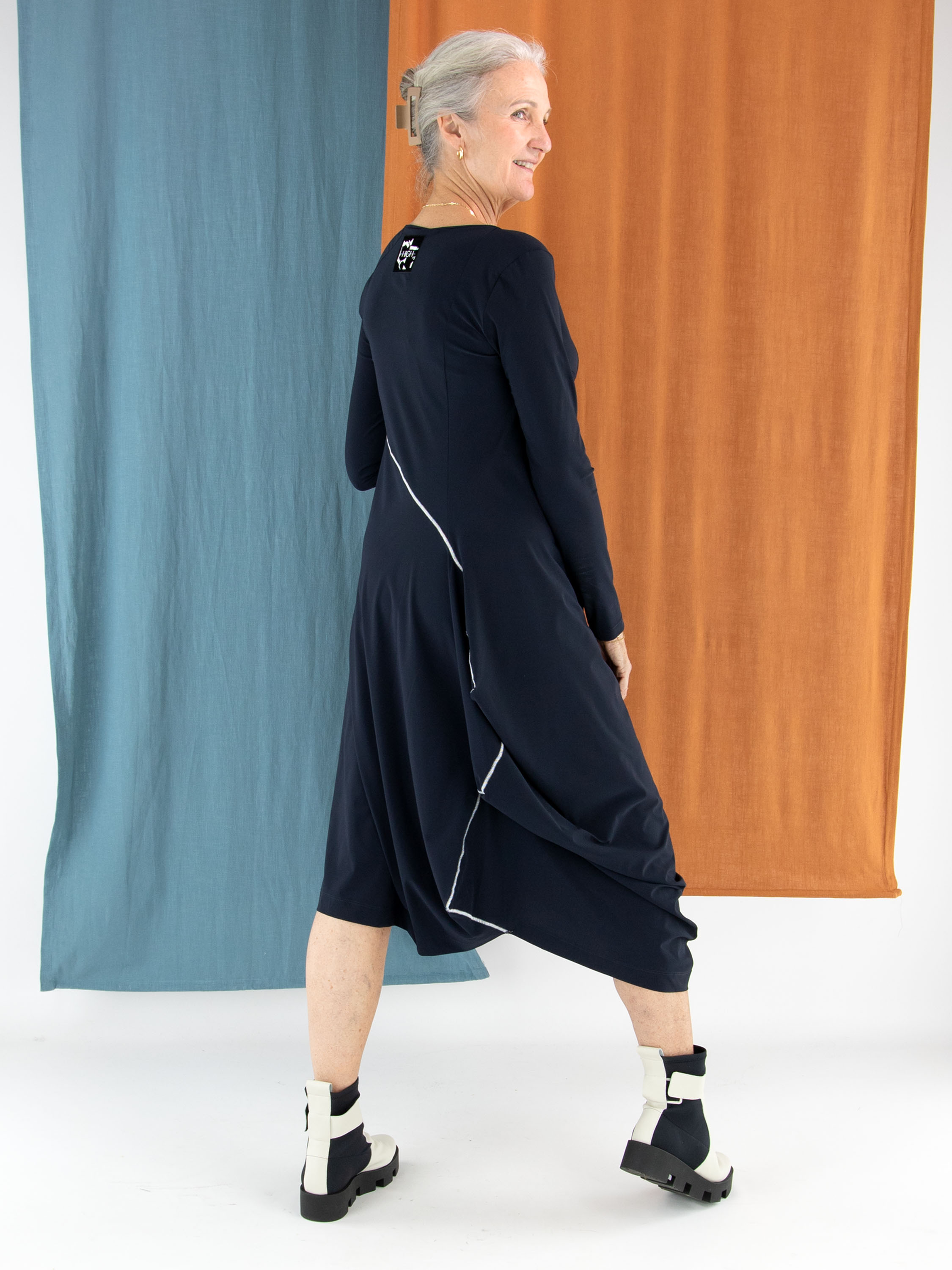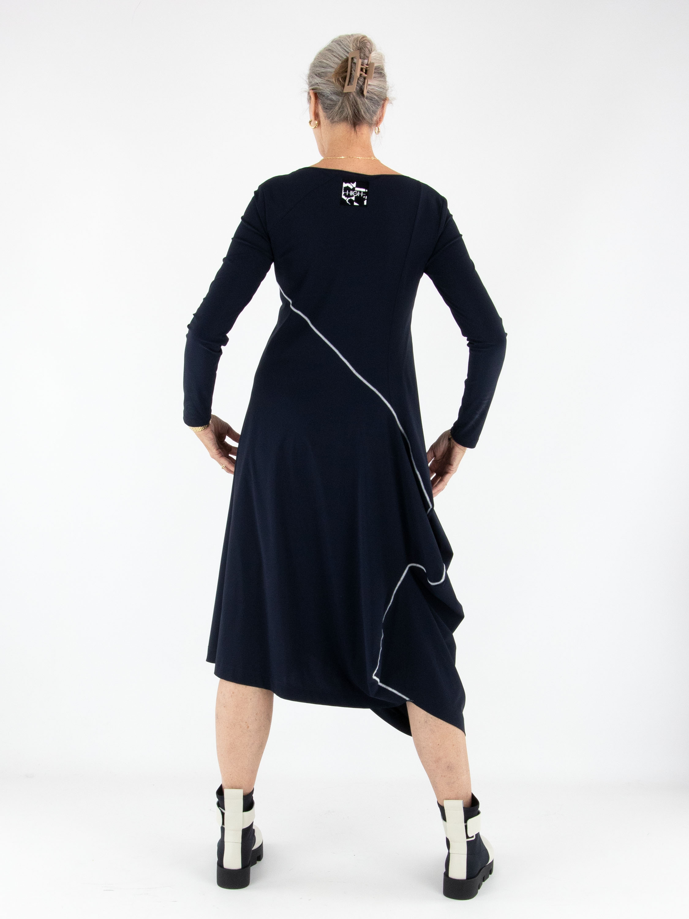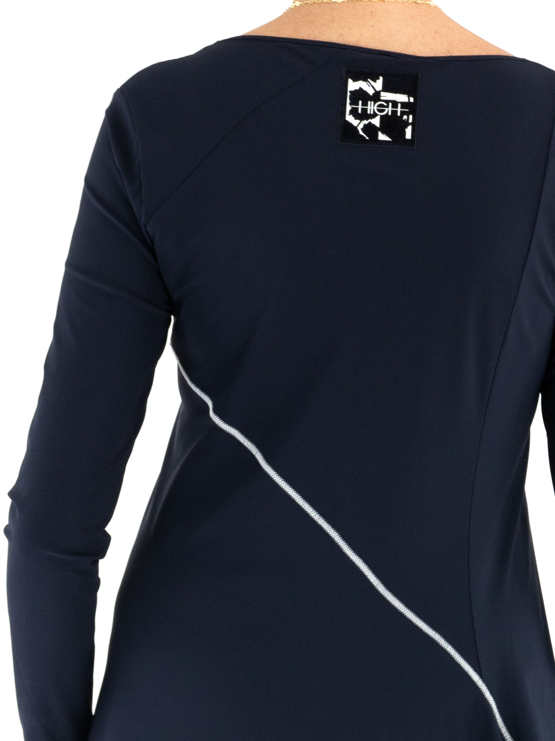 Kleid von High in Marineblau. Eine dekorative Naht verläuft diagonal von der linken Schulter nach unten und verleiht dem Modell ein modernes, raffiniertes Detail. Auf Taillenhöhe befindet sich auf der rechten Seite eine praktische Eingrifftasche. Mit Rundhalsausschnitt und langen Ärmeln lässt sich dieses exklusive Designerkleid bei 30 Grad waschen.