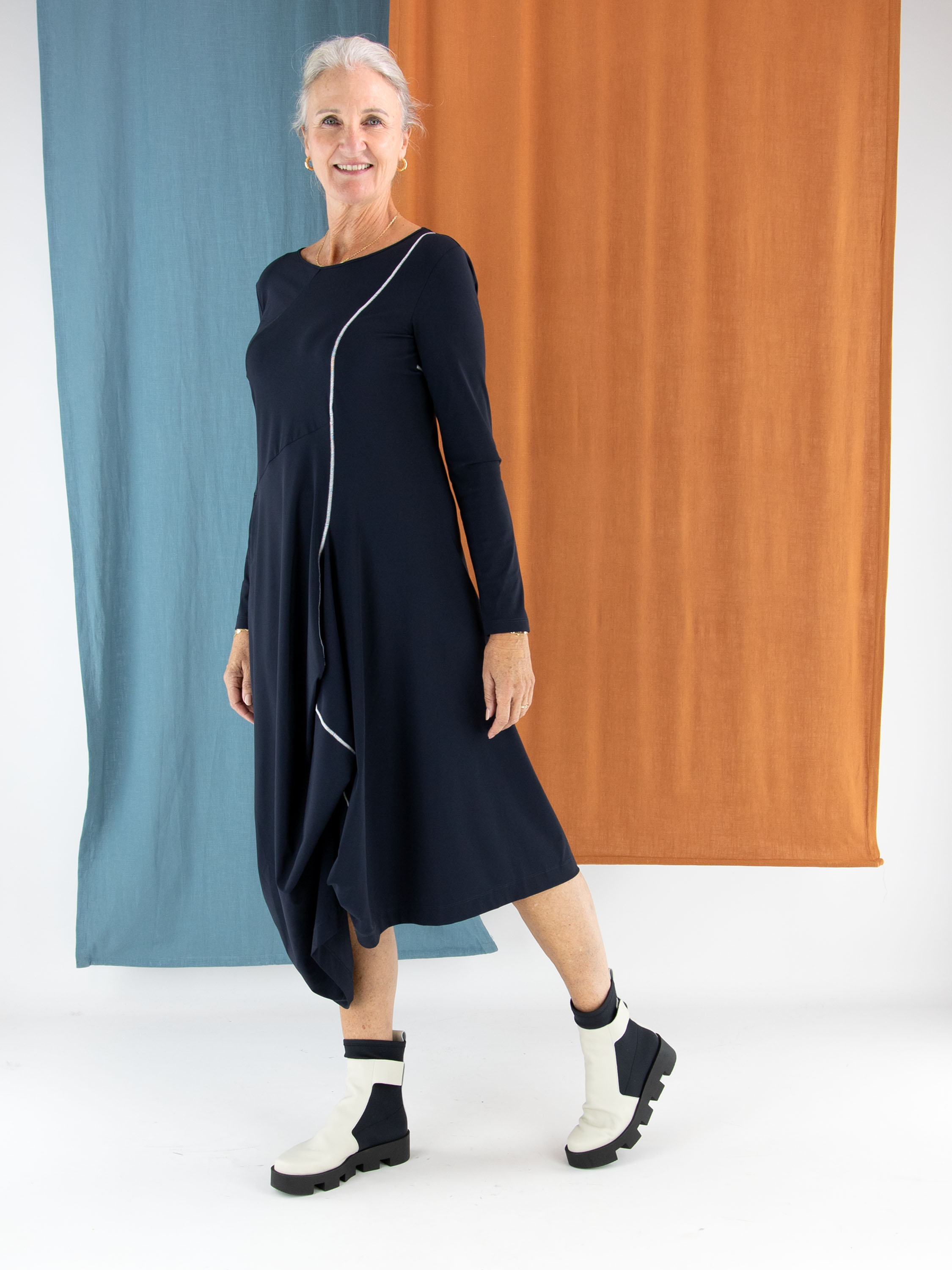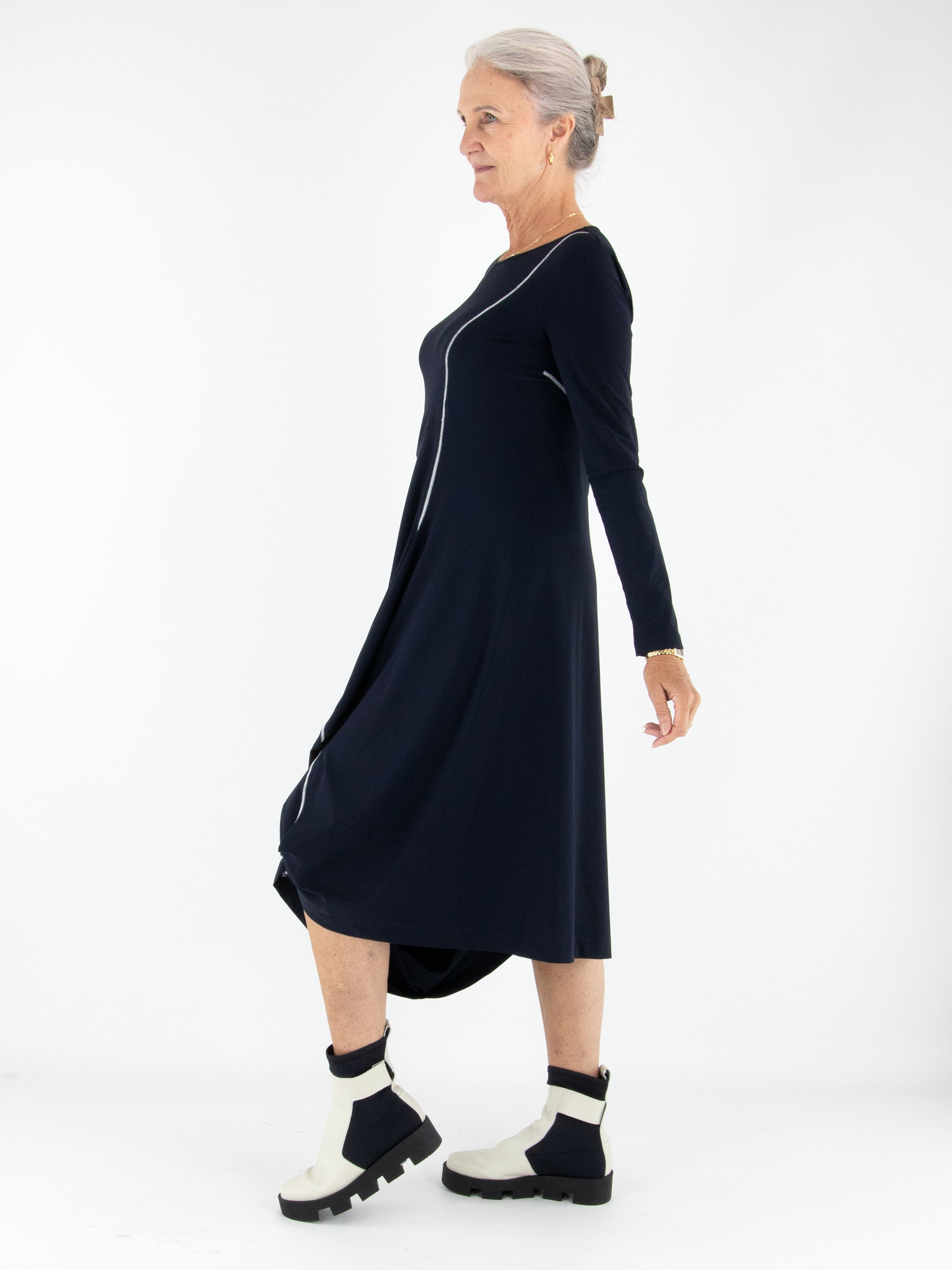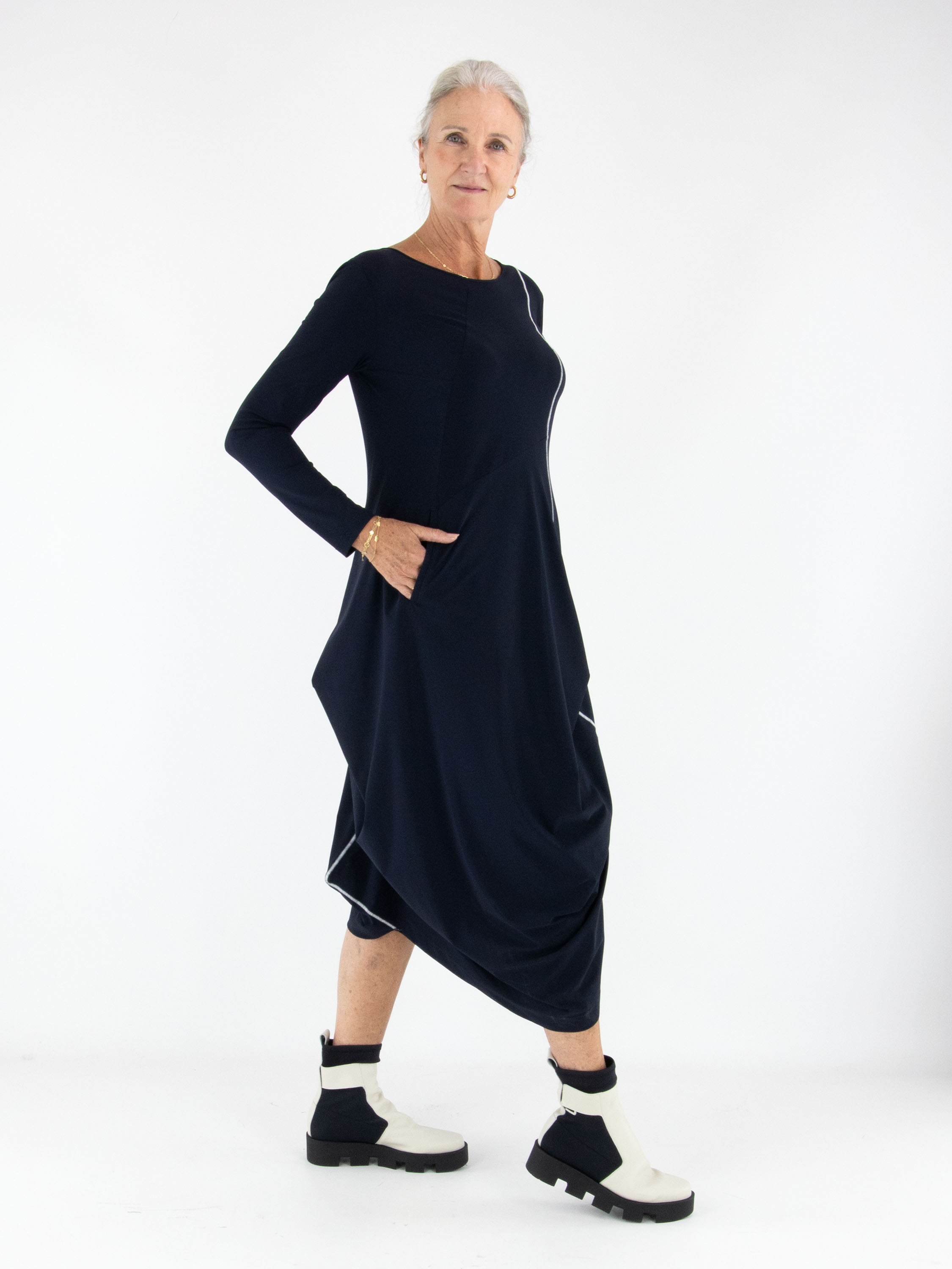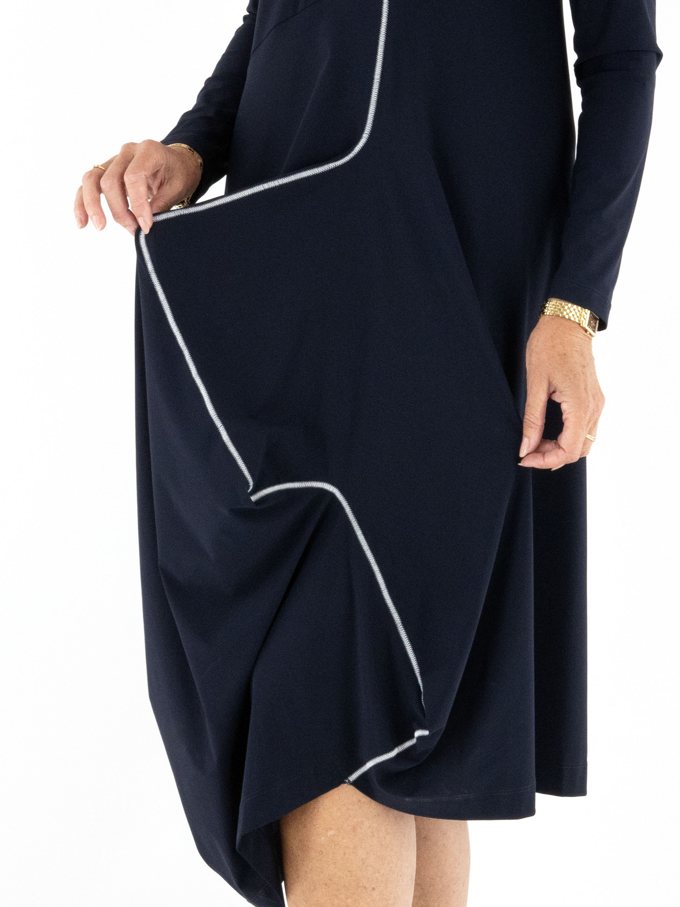 Kleid von High in Marineblau. Eine dekorative Naht verläuft diagonal von der linken Schulter nach unten und verleiht dem Modell ein modernes, raffiniertes Detail. Auf Taillenhöhe befindet sich auf der rechten Seite eine praktische Eingrifftasche. Mit Rundhalsausschnitt und langen Ärmeln lässt sich dieses exklusive Designerkleid bei 30 Grad waschen.