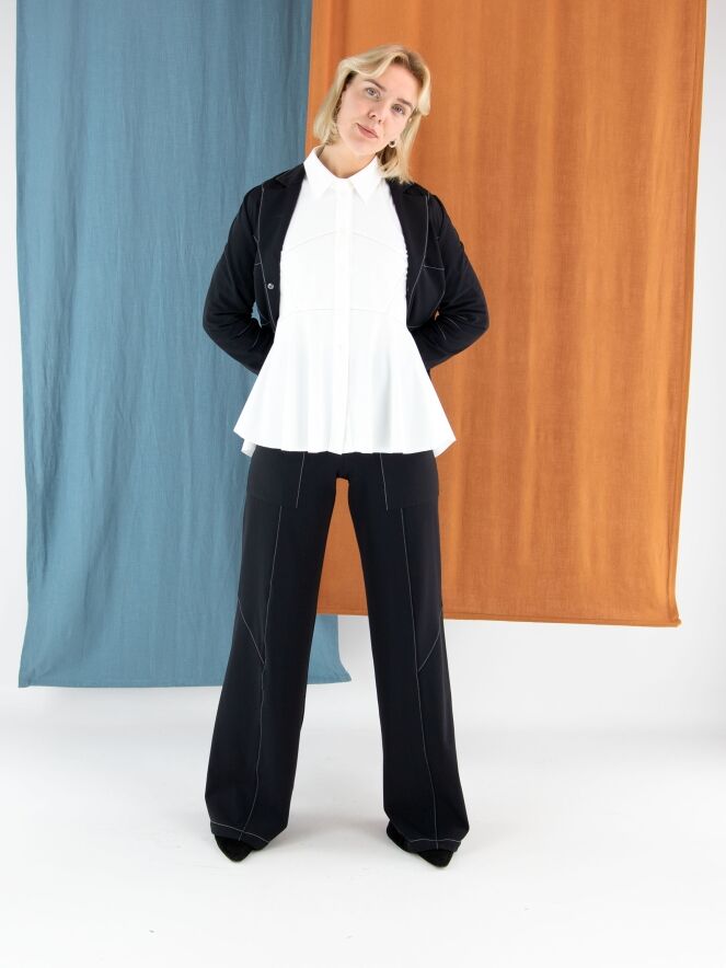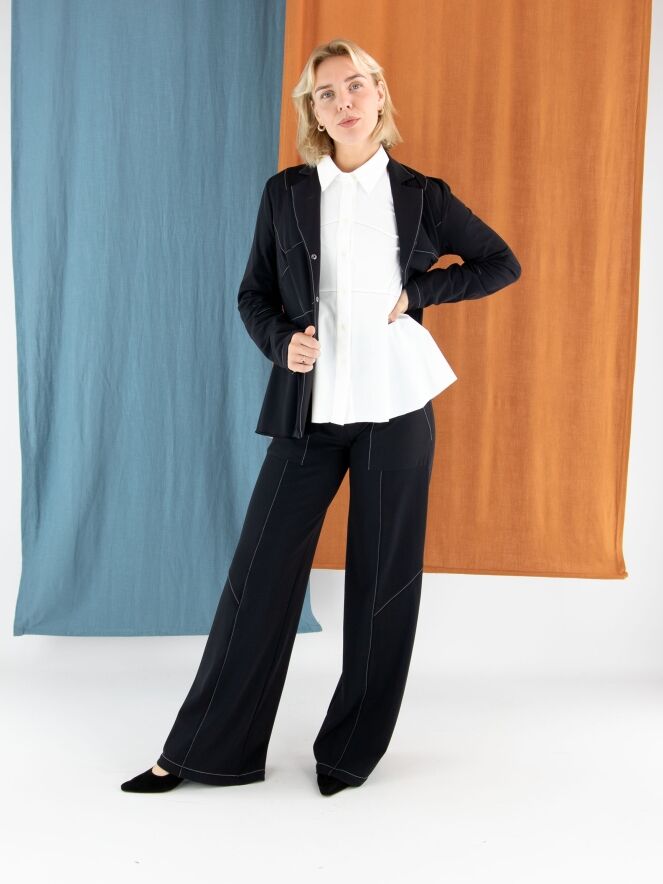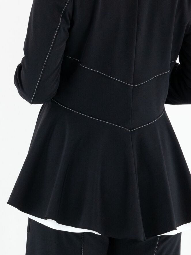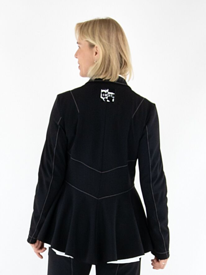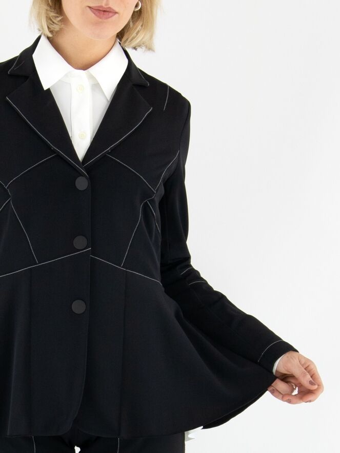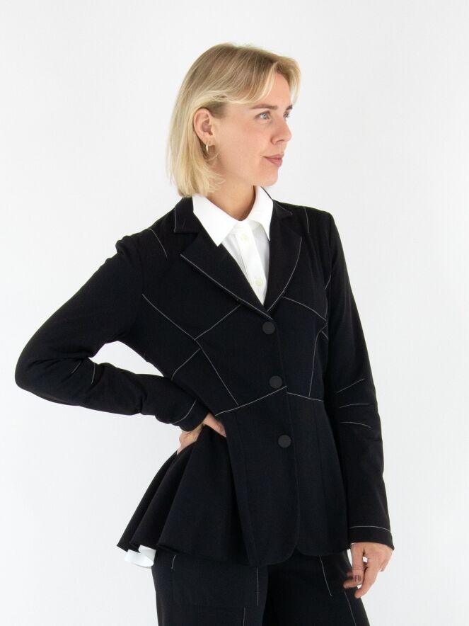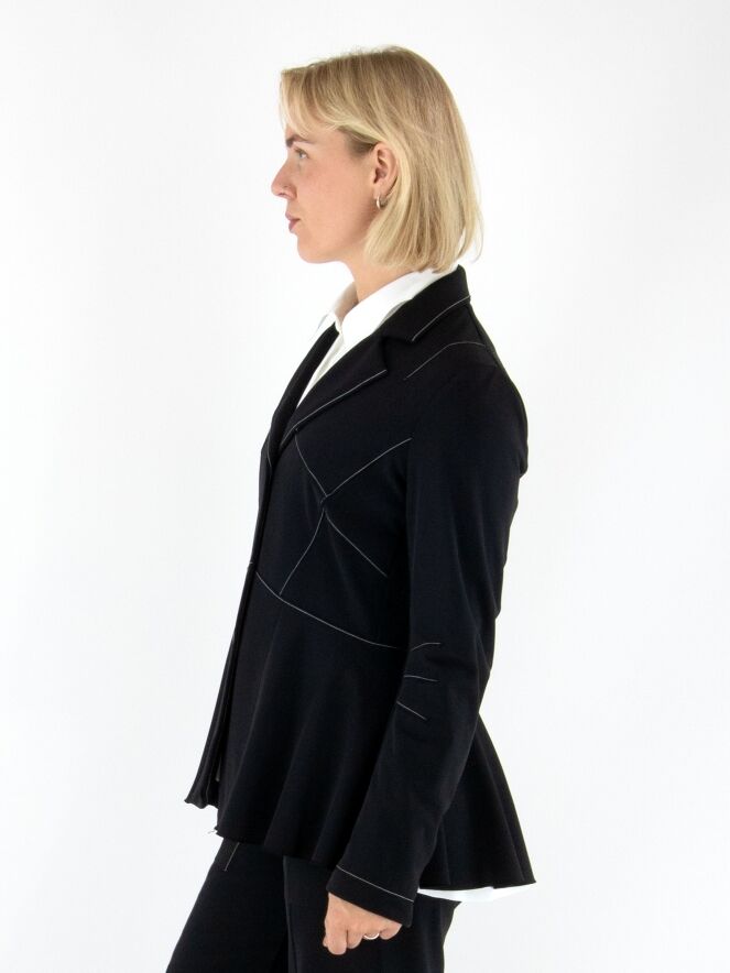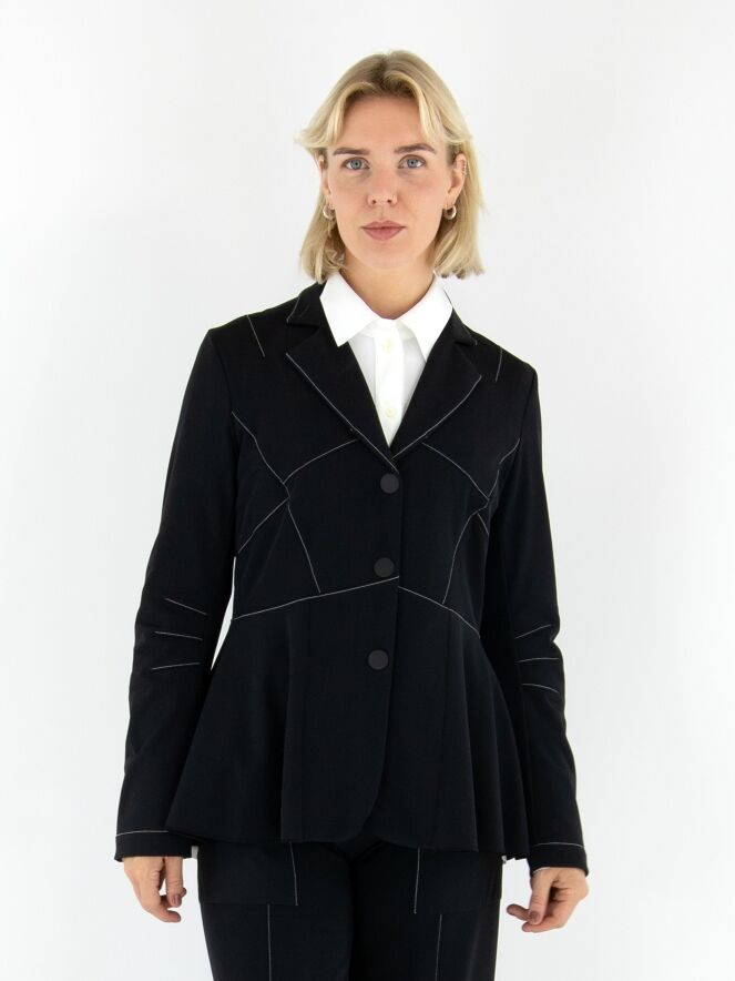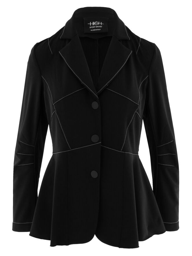 Leicht taillierter Blazer von High in Schwarz. Mit drei Druckknöpfen und ungefütterter Verarbeitung überzeugt er durch eine fließende, moderne Ausstrahlung. Dekorative weiße Nähte oberhalb der Taille und an den Ärmeln setzen elegante, zeitgemäße Kontraste. Dieser exklusive Designerblazer kann bei 30 Grad gewaschen werden.