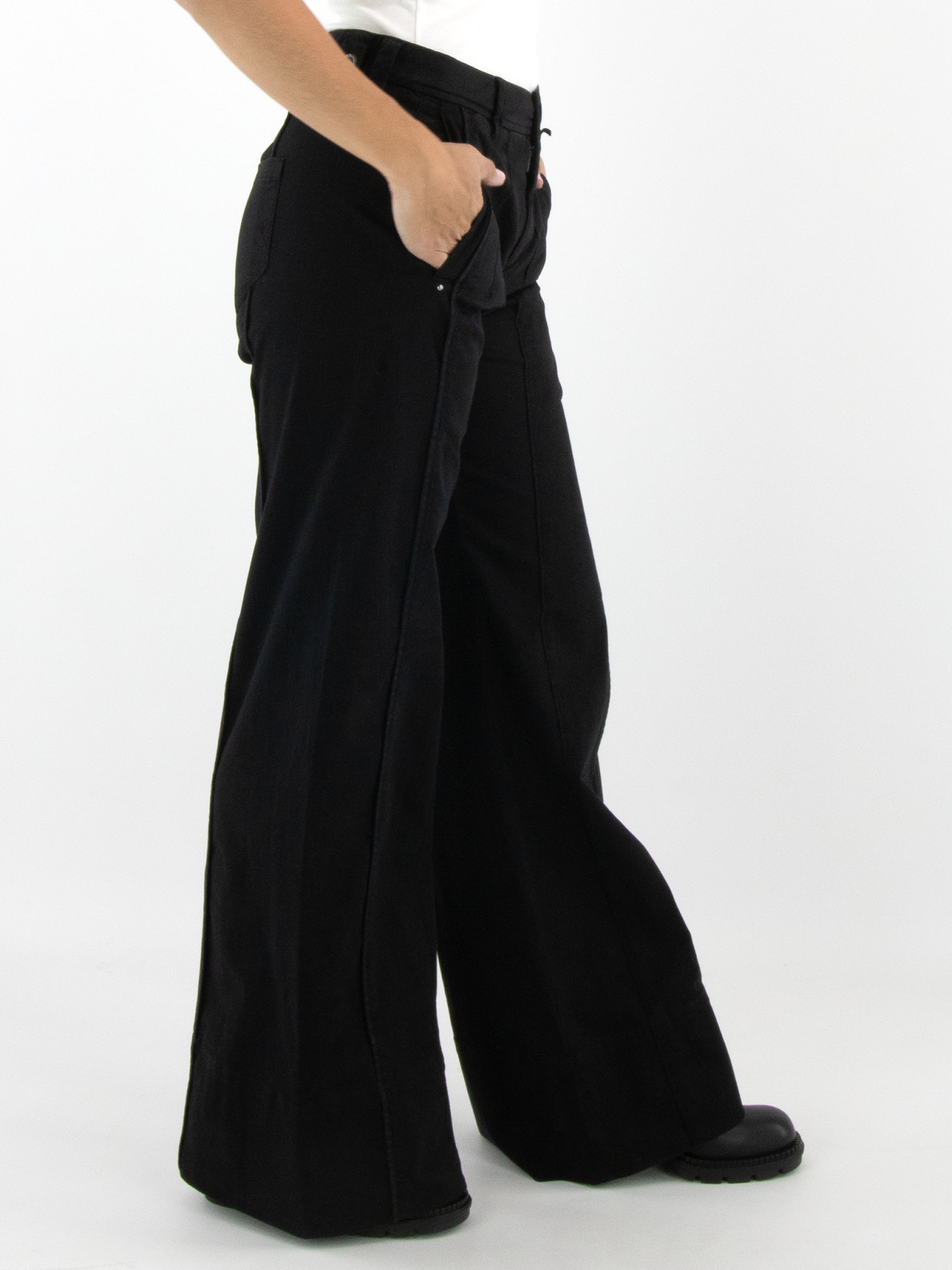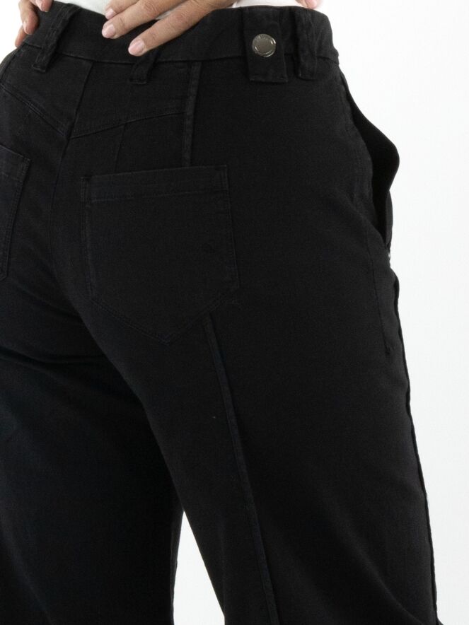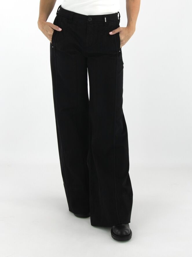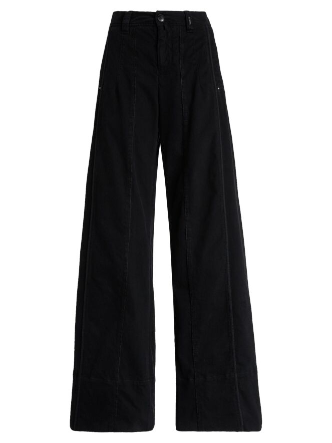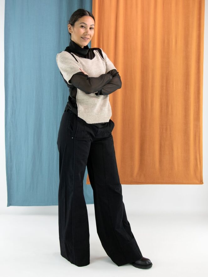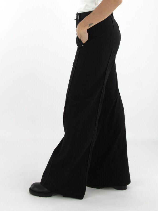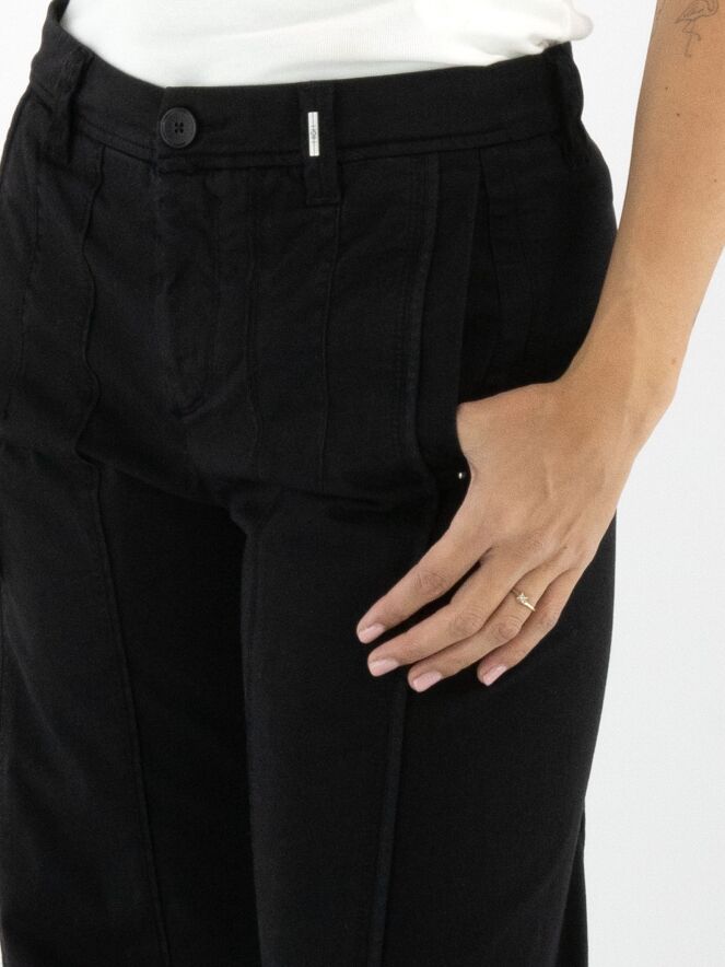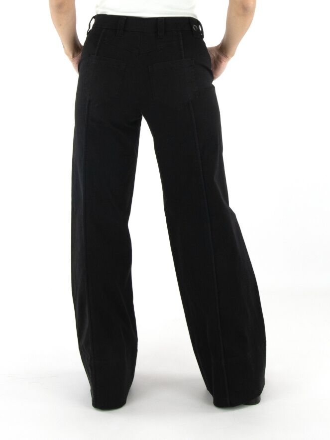 Eine weite Hose von High in Schwarz. Ab der Taille verlaufen mehrere Nähte, von denen zwei umgekehrt gearbeitet sind und bis zum Saum reichen. Dies verleiht der Hose eine moderne, leicht architektonische Ausstrahlung. Die Hose ist mit Eingrifftaschen versehen und kann bei 30 Grad gewaschen werden.