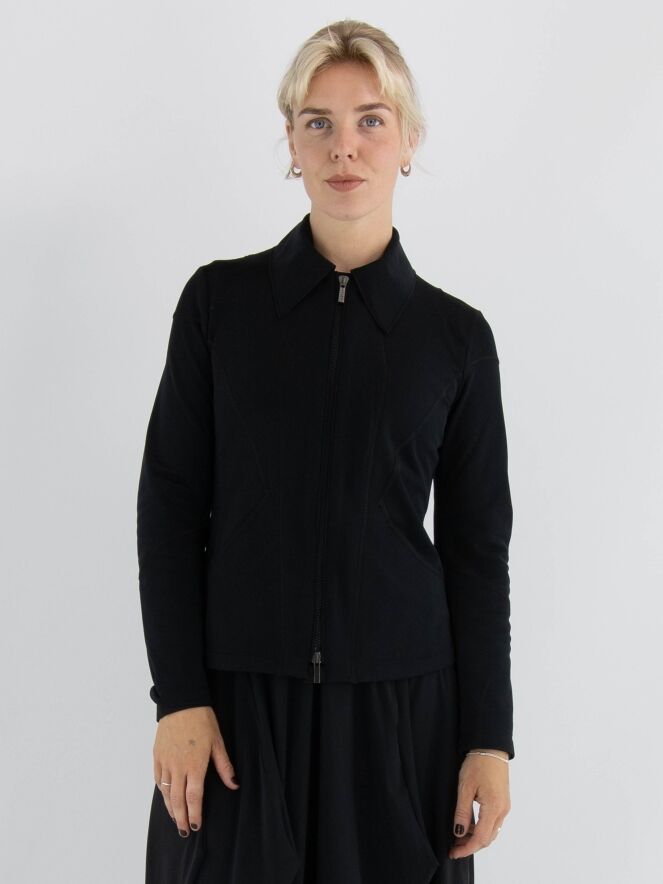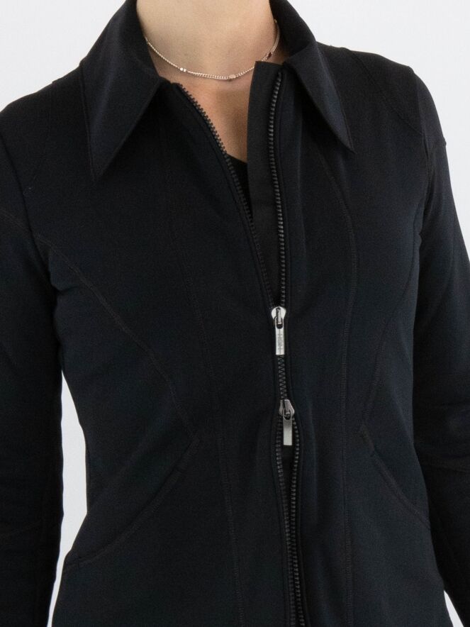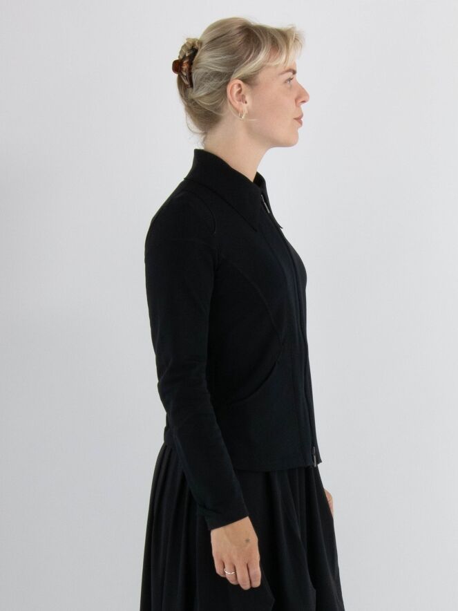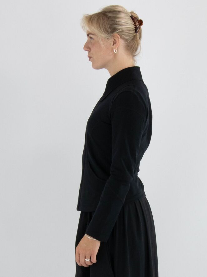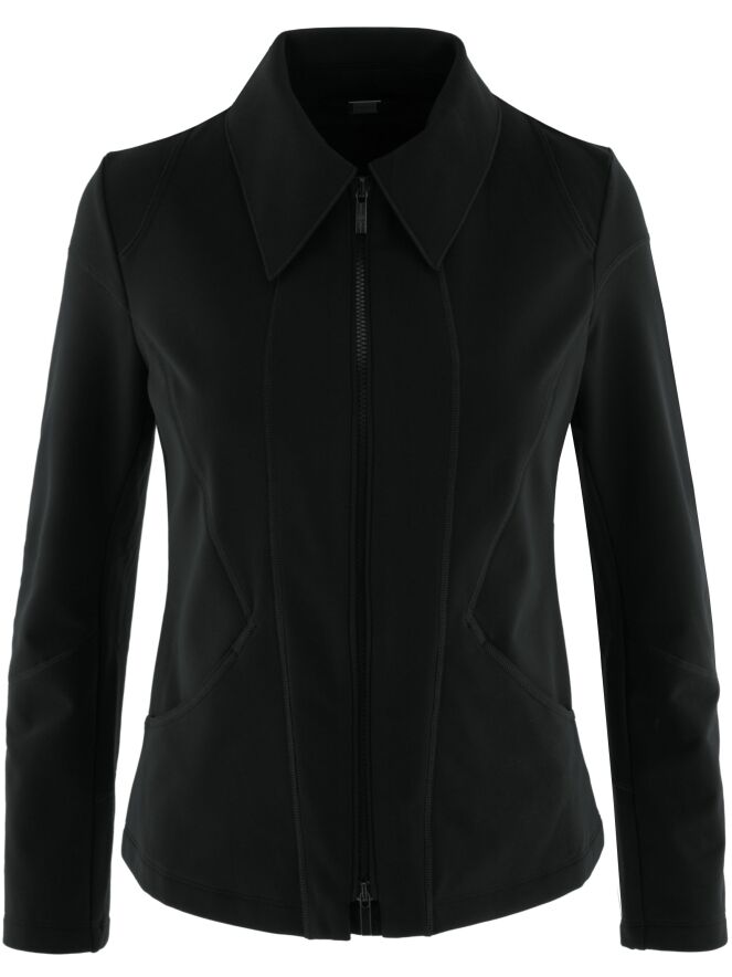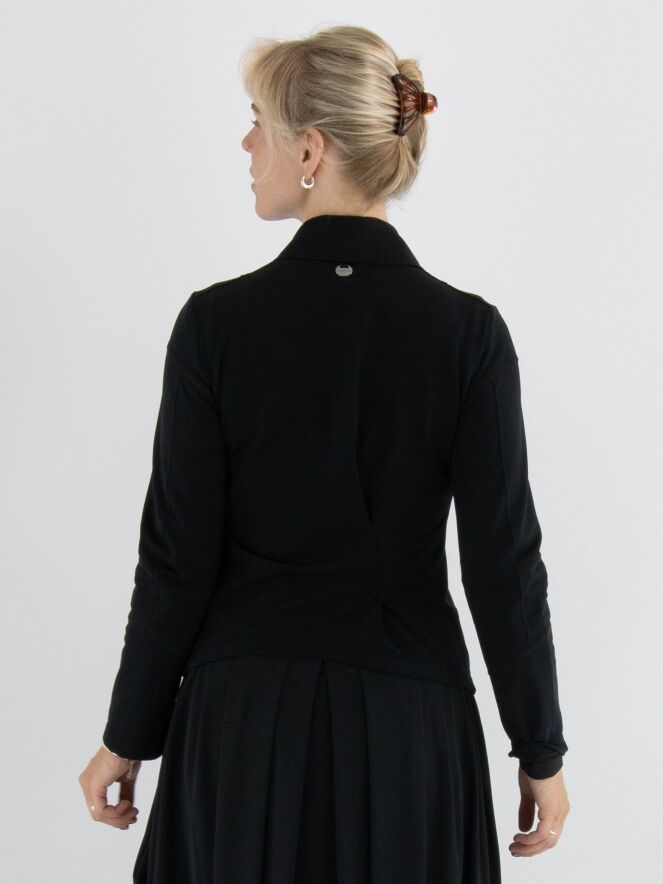 Blazer von High in Schwarz. Der Blazer hat mehrere dekorative Nähte und einen Reißverschluss. Auf der Rückseite, rechts in Taillenhöhe, befindet sich eine Plisséfalte mit einer diagonalen Naht. Dieser Blazer kann bei 30 Grad gewaschen werden.