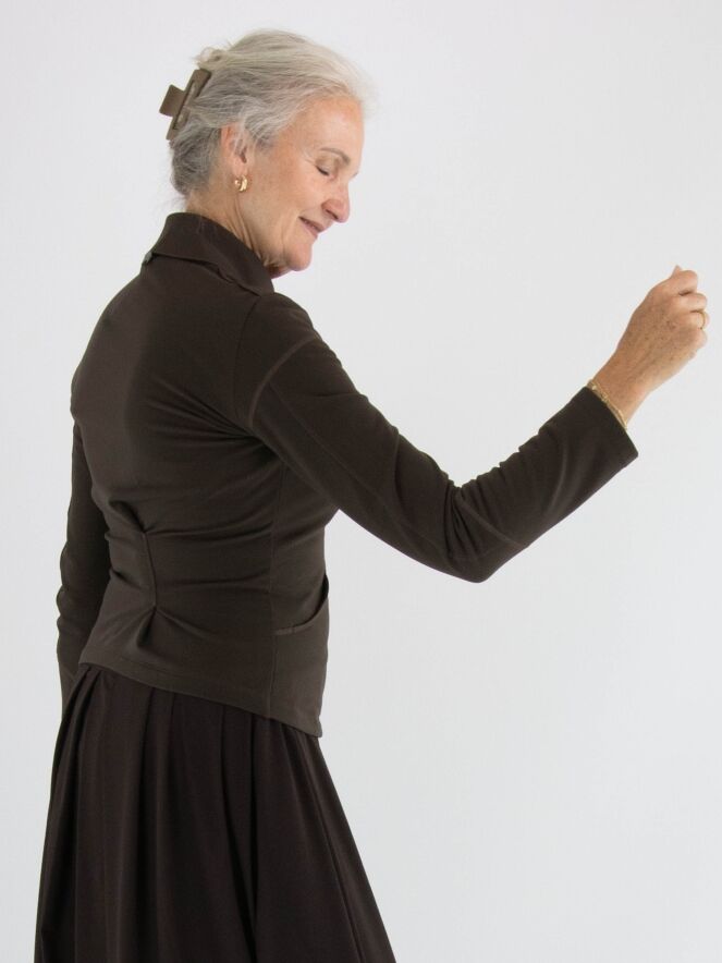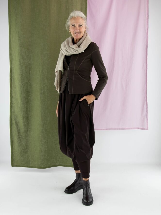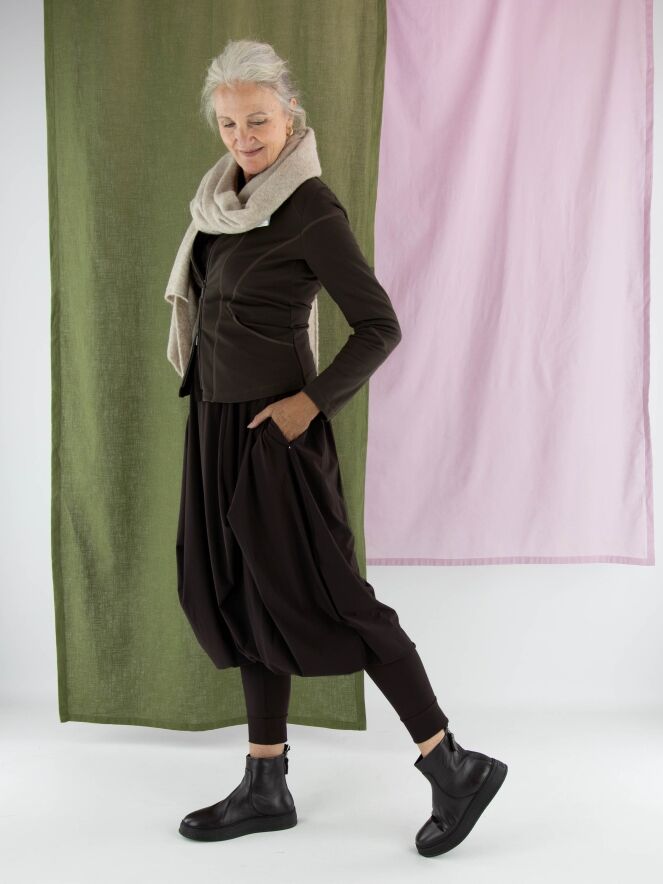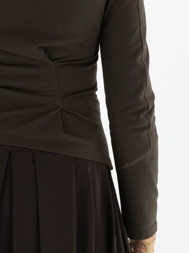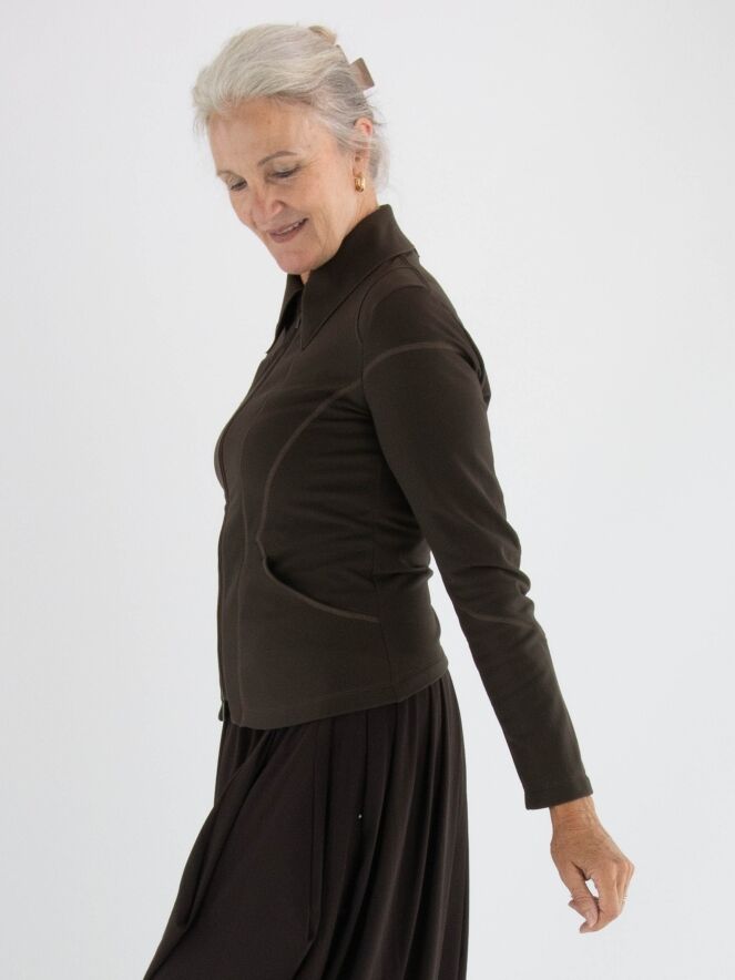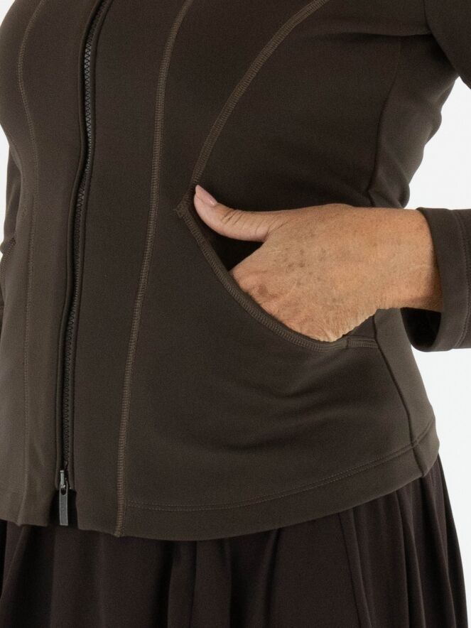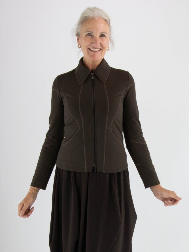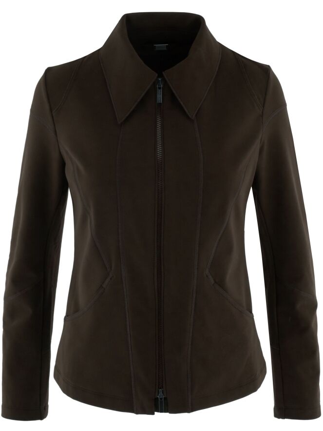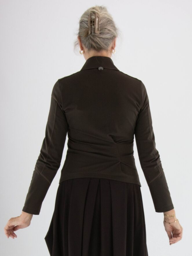 Blazer von High in Olivgrün. Der Blazer hat mehrere dekorative Ziernähte und einen Reißverschluss. Auf der Rückseite, rechts von der Mitte auf Taillenhöhe, befindet sich eine Plisseefalte mit einer diagonalen Naht. Dieser Blazer kann bei 30 Grad gewaschen werden.