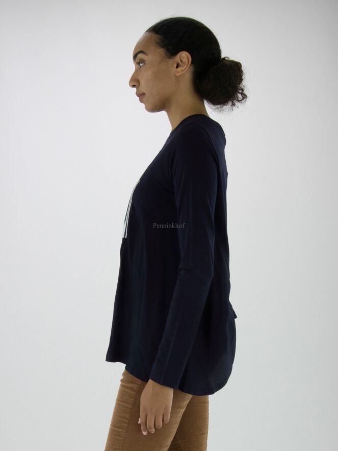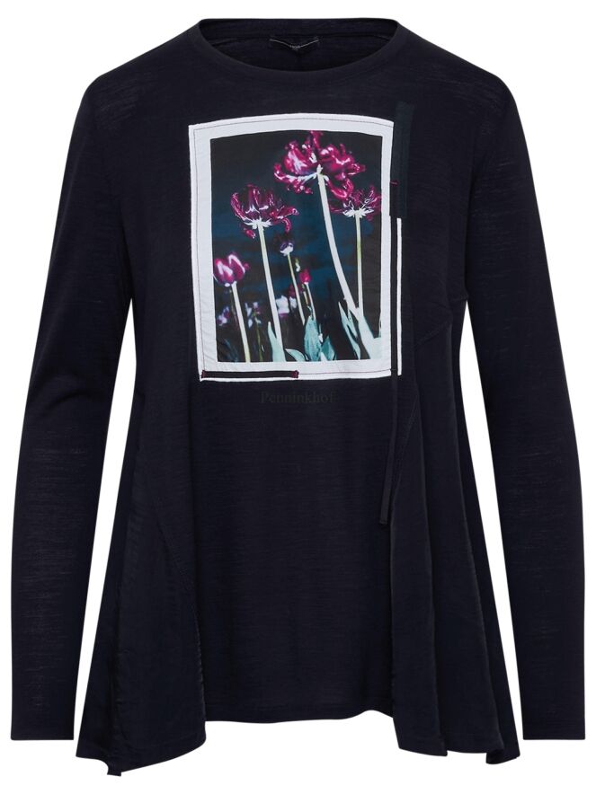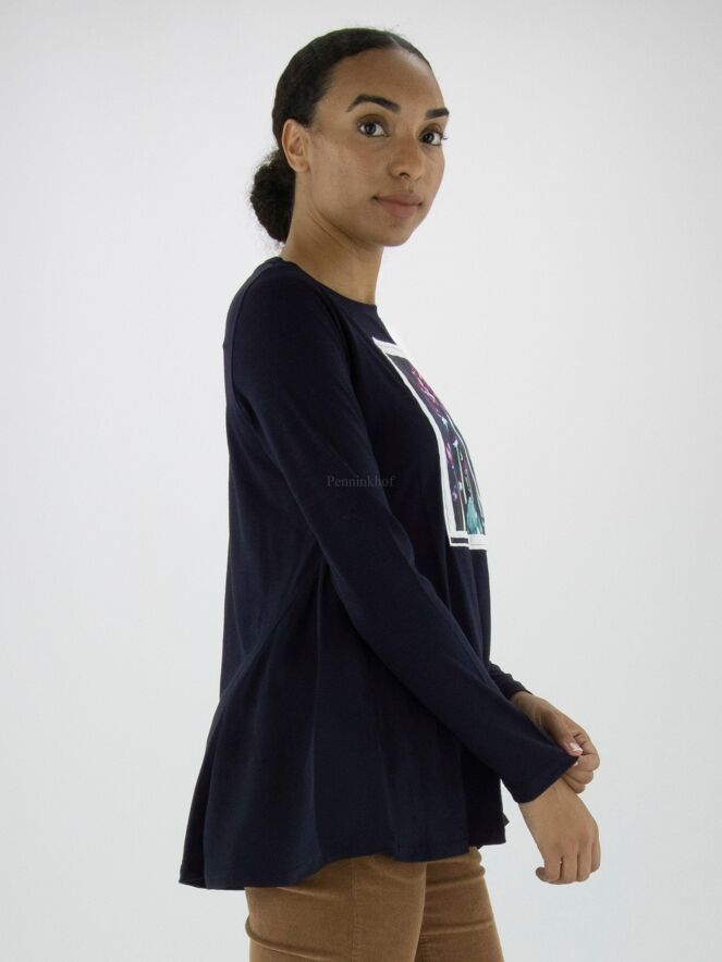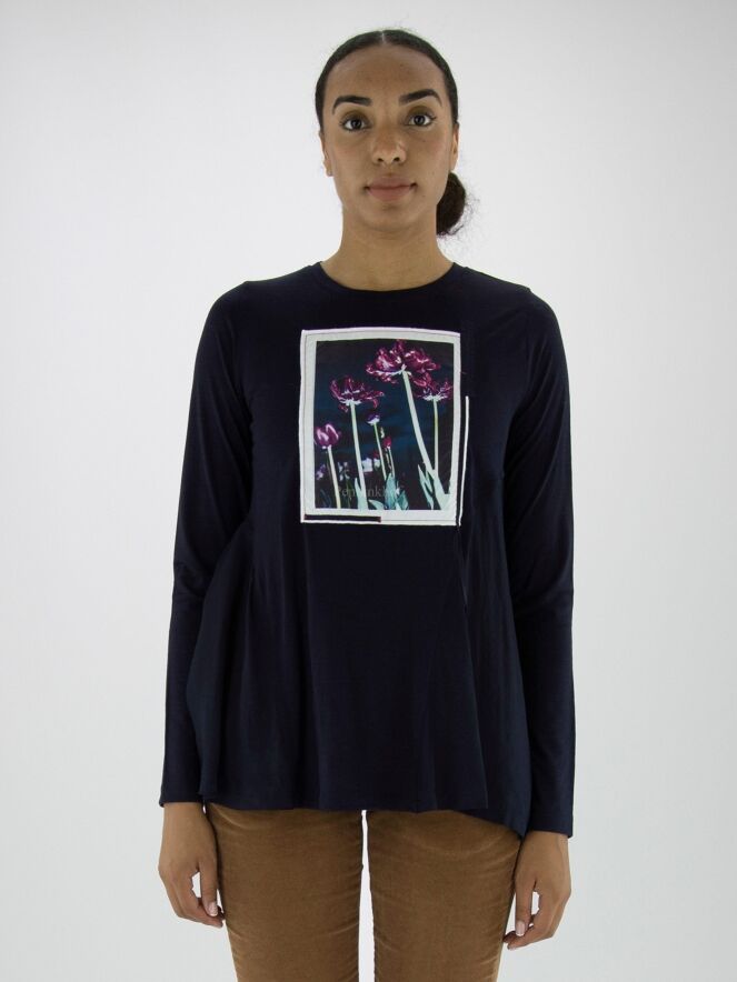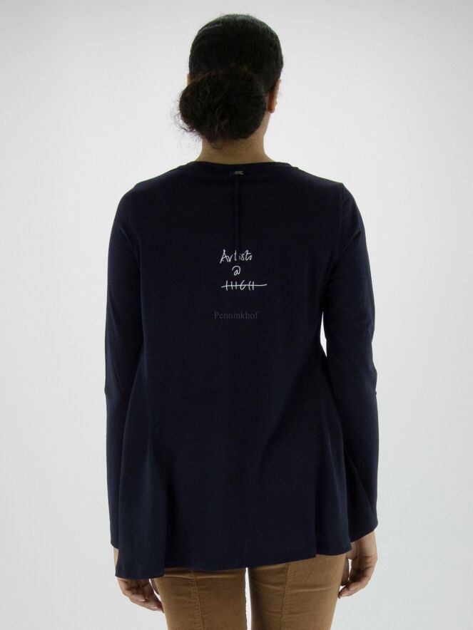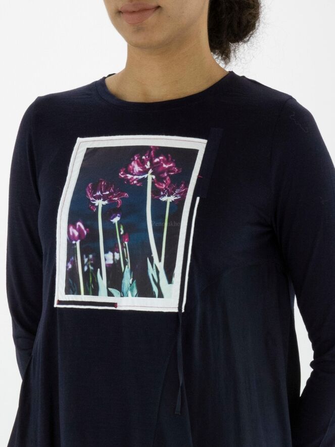 Ein Shirt von High in Marineblau. Auf der Vorderseite ist ein Foto des Fotografen Enrico de Luigi zu sehen. Das Hemd hat eine A - Linie und ab der Achselhöhle sind die Seiten aus einem matten Satinstoff. Dieses Shirt kann mit der Hand gewaschen werden.