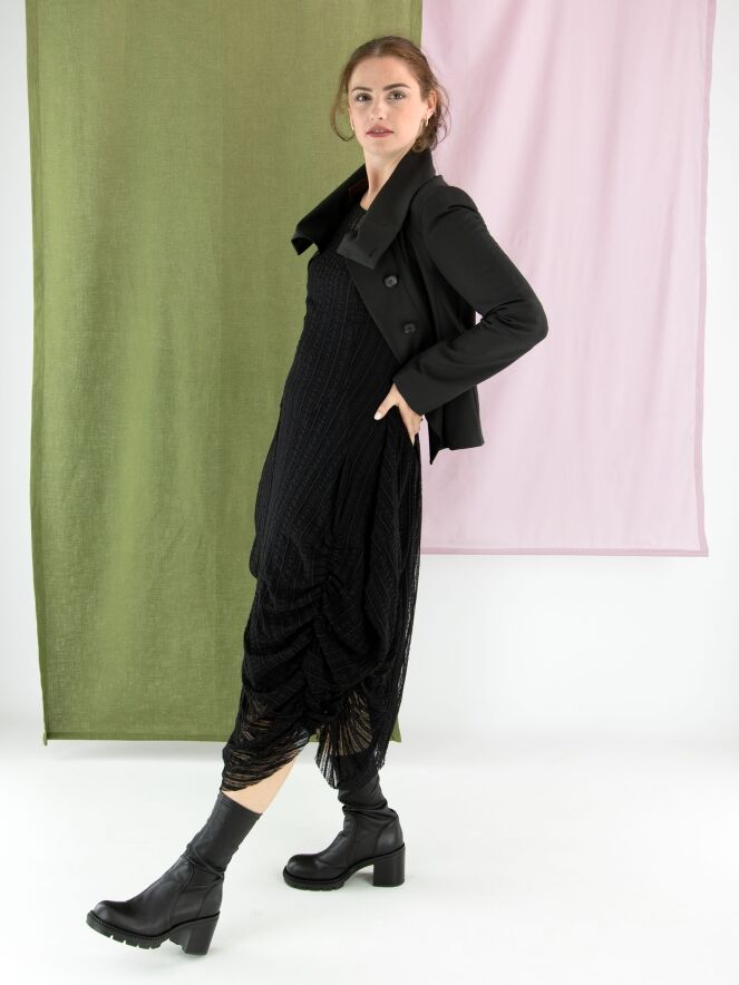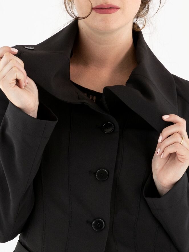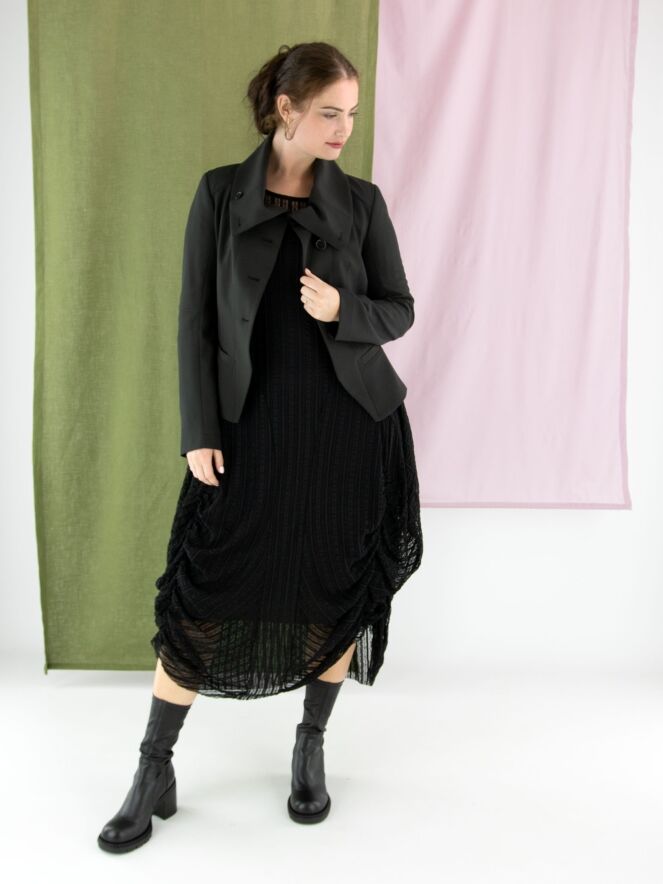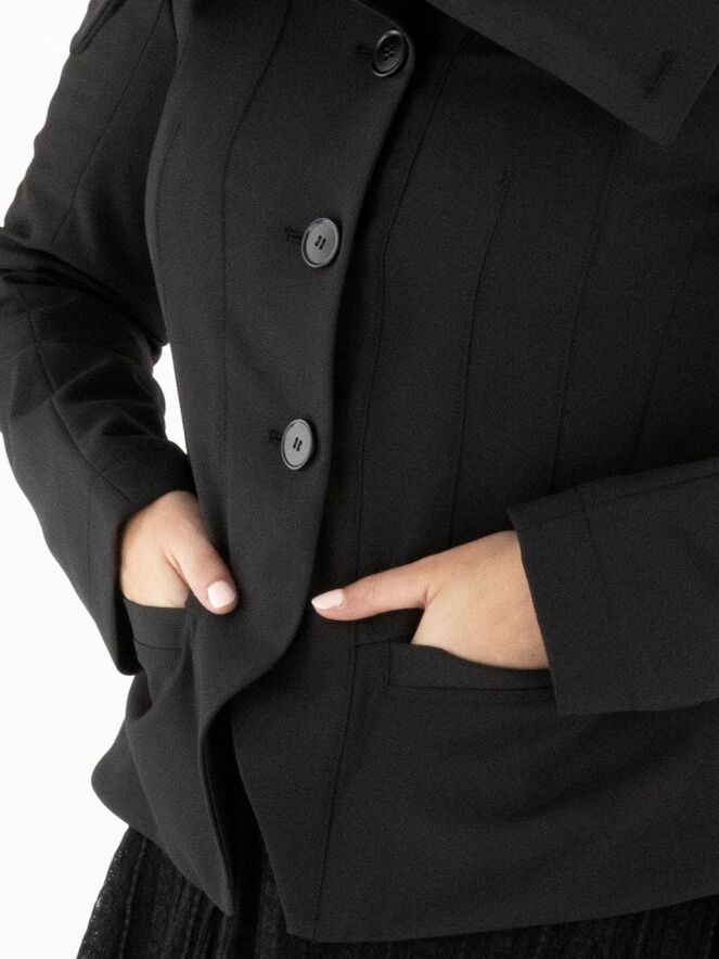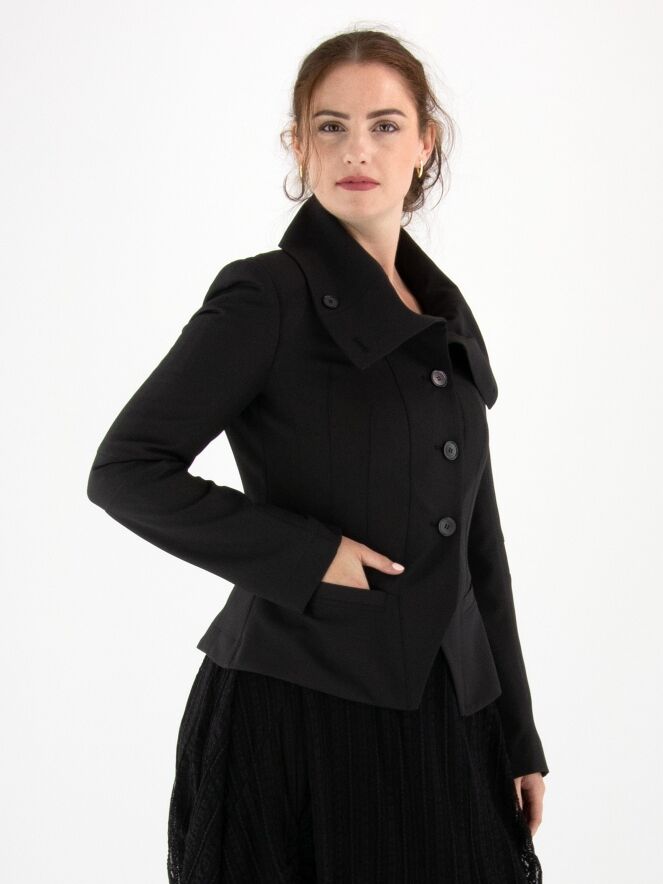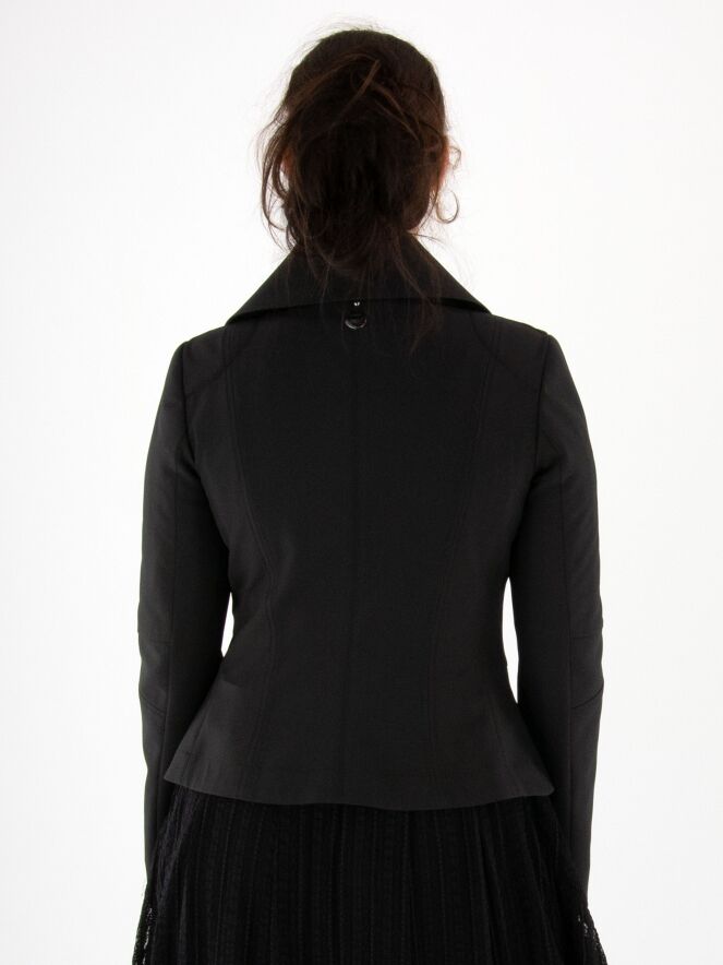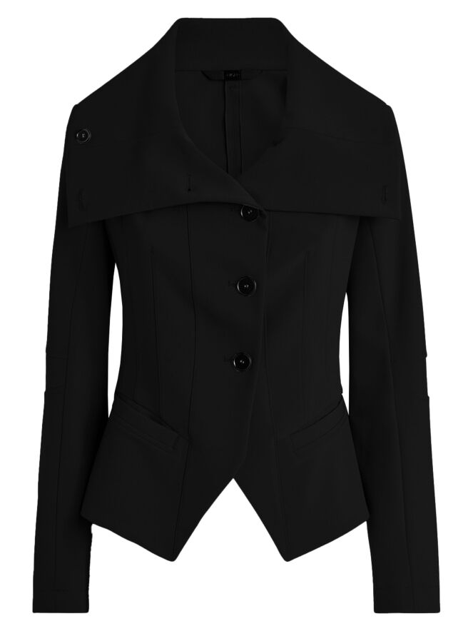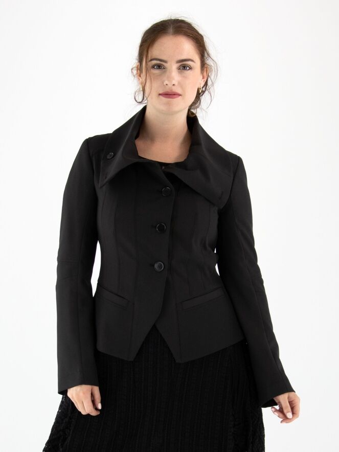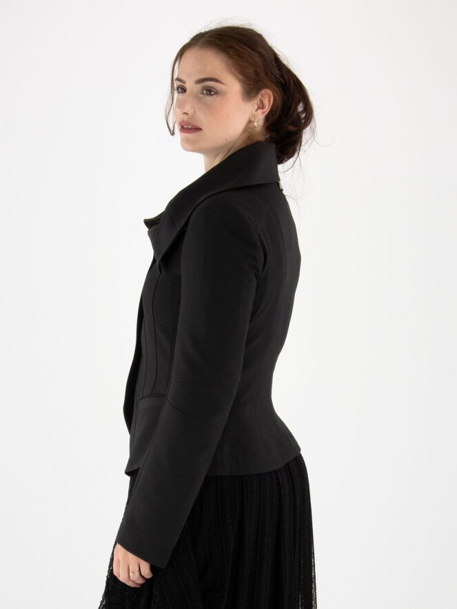 Schwarzer Blazer von High. Der Blazer hat einen breiten Kragen, der dekorativ wie ein Wickelkragen gebunden werden kann. Auf der Vorderseite sind mehrere dekorative Taillennähte eingearbeitet. Dieser Blazer darf nur von Hand gewaschen werden.