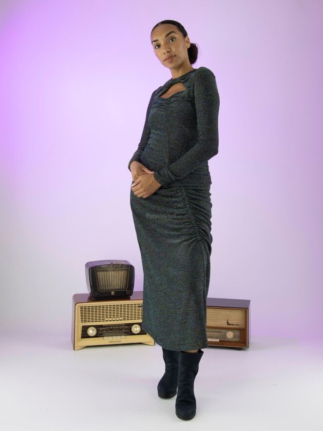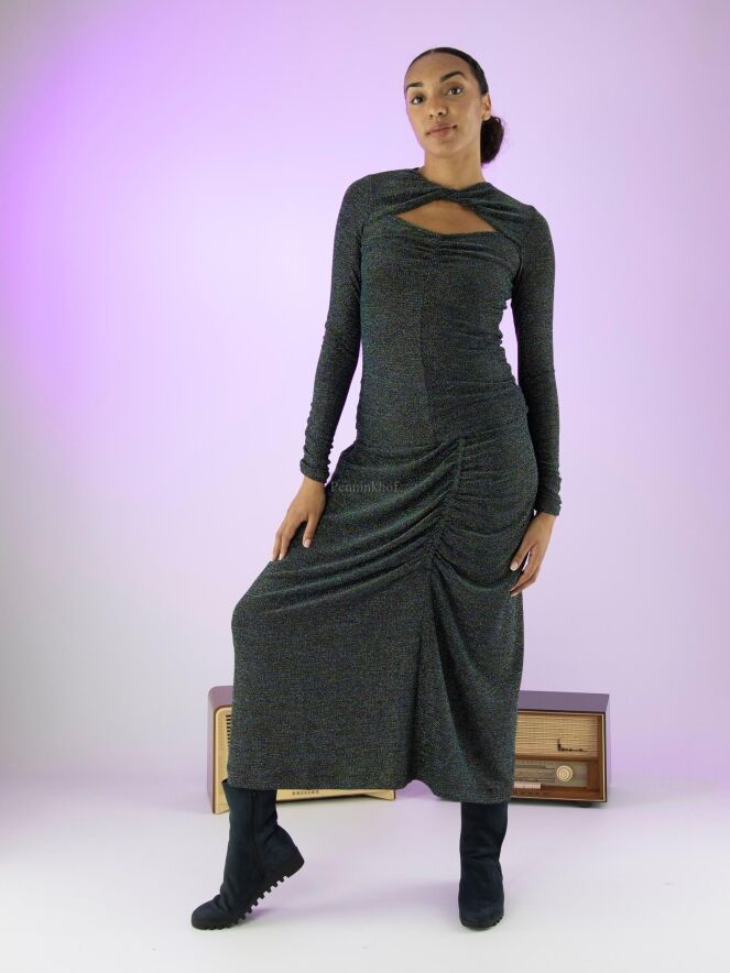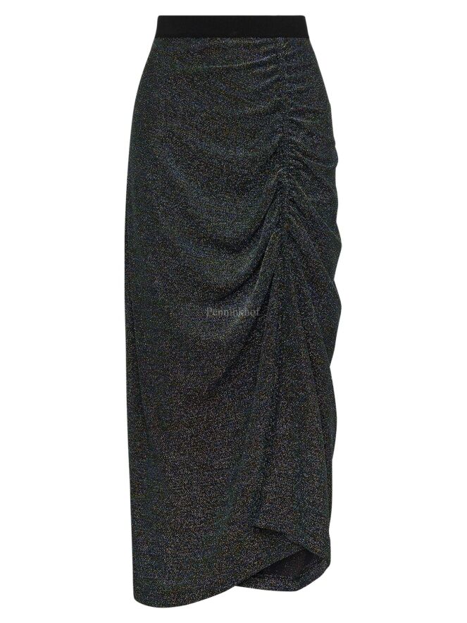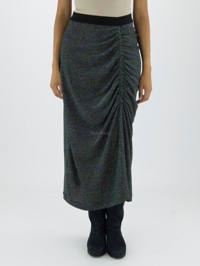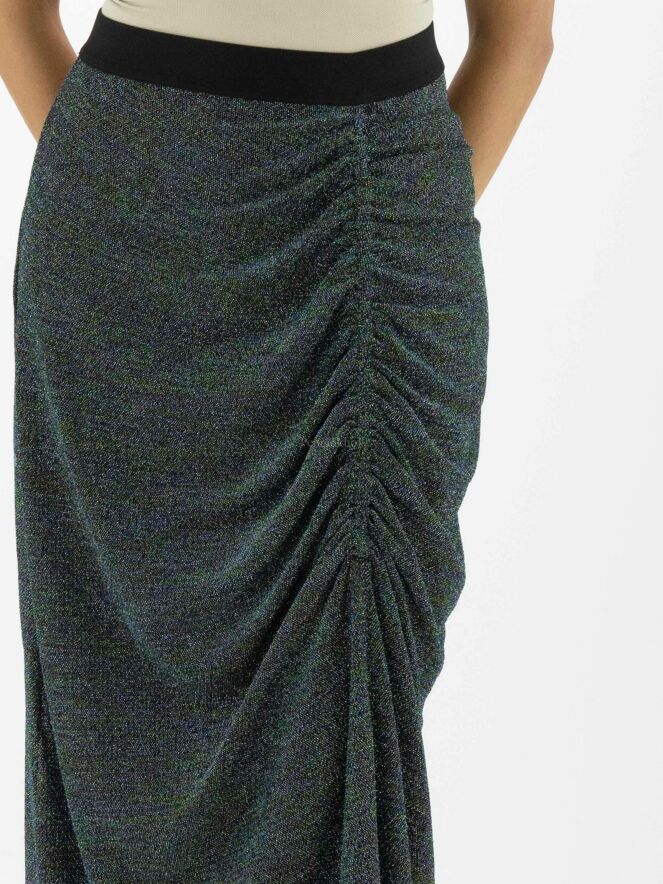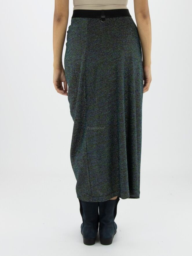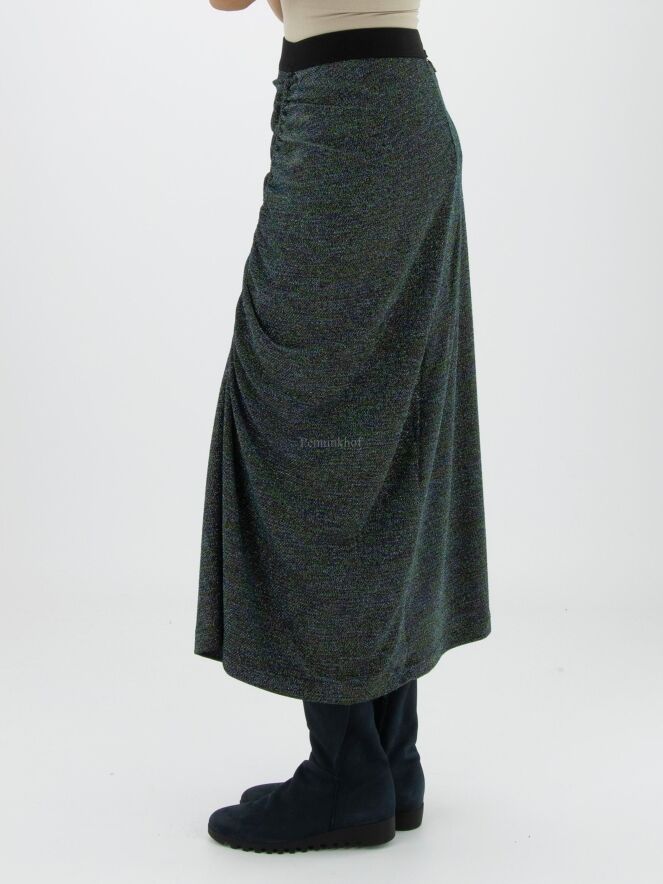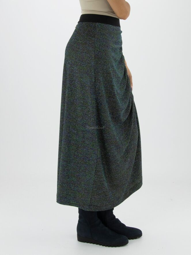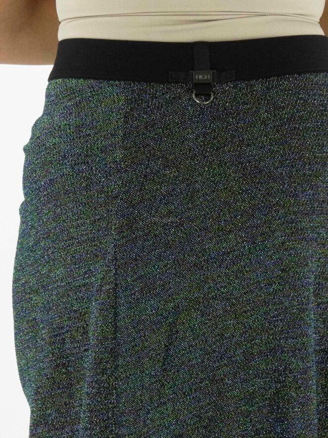 Ein Lurex-Rock von High mit mehreren Farben im Stoff wie Blau, Silber, Grün, Gold und Schwarz. In der Taille befindet sich ein Gummiband. Auf der Vorderseite befindet sich in der Mitte eine vertikale Naht, entlang derer der Stoff in Falten gelegt ist, wodurch ein Drapierungseffekt entsteht. Dieser Rock kann mit der Hand gewaschen werden.