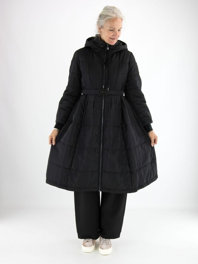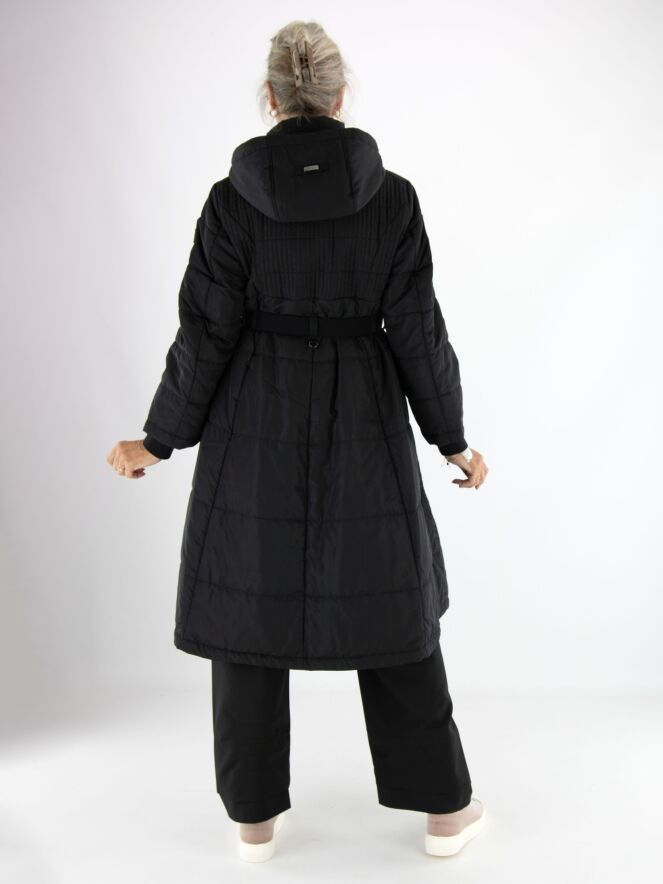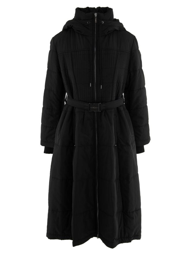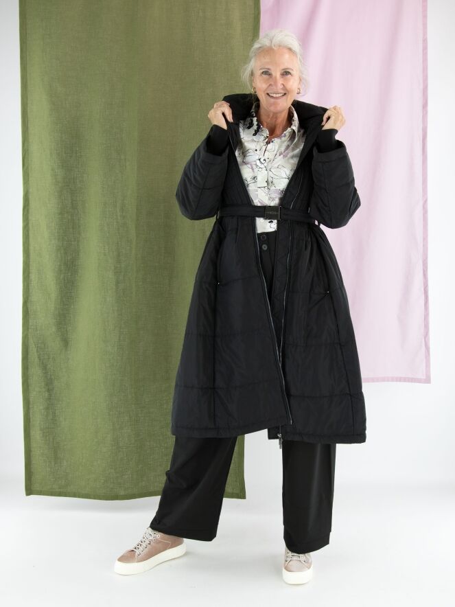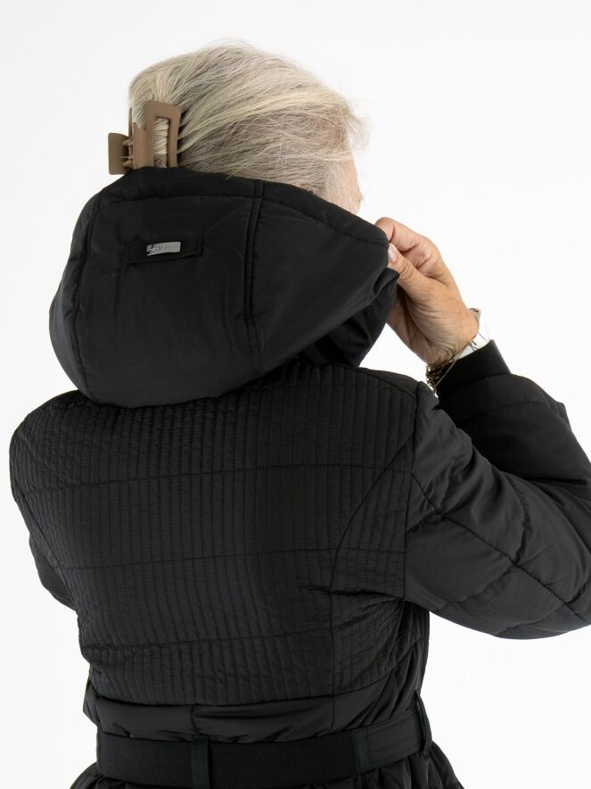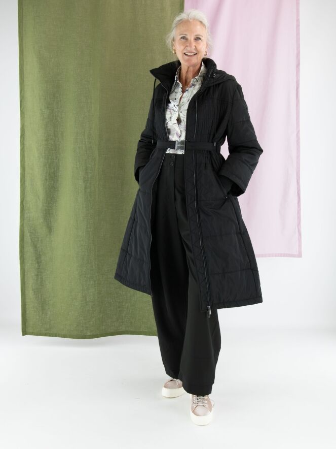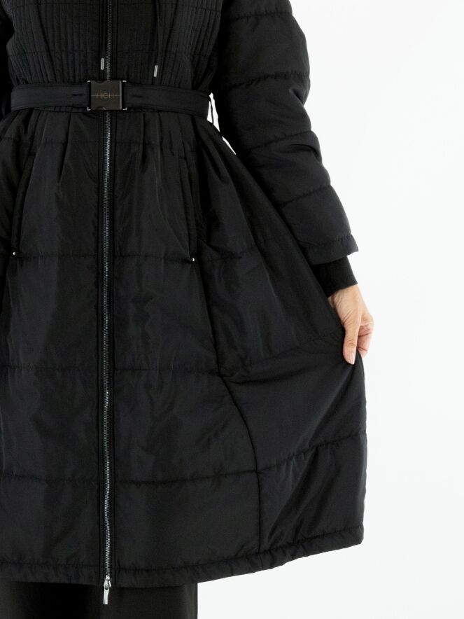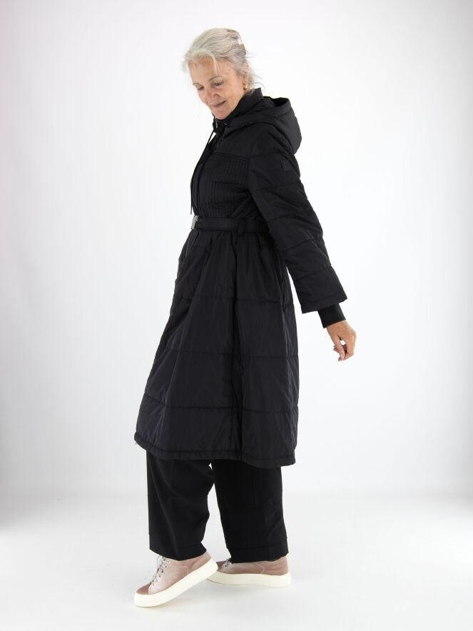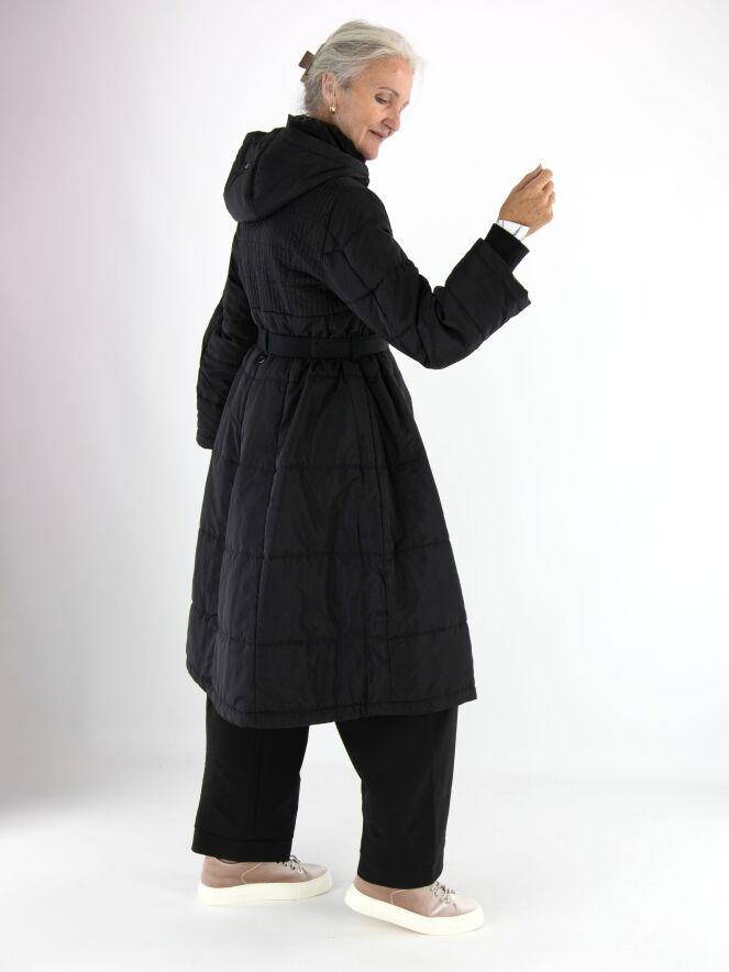 Langer Mantel von High in Schwarz. In der Kapuzenkante befindet sich ein Tunnelzug mit Kordel. Auf Taillenhöhe gibt es einen Gürtel mit nickelfarbener Schnalle. Vom Brustbereich bis zur Taille ist der Stoff in einem gesmokten Muster gesteppt. Der Mantel hat Eingrifftaschen und darf bei 30 Grad gewaschen werden.