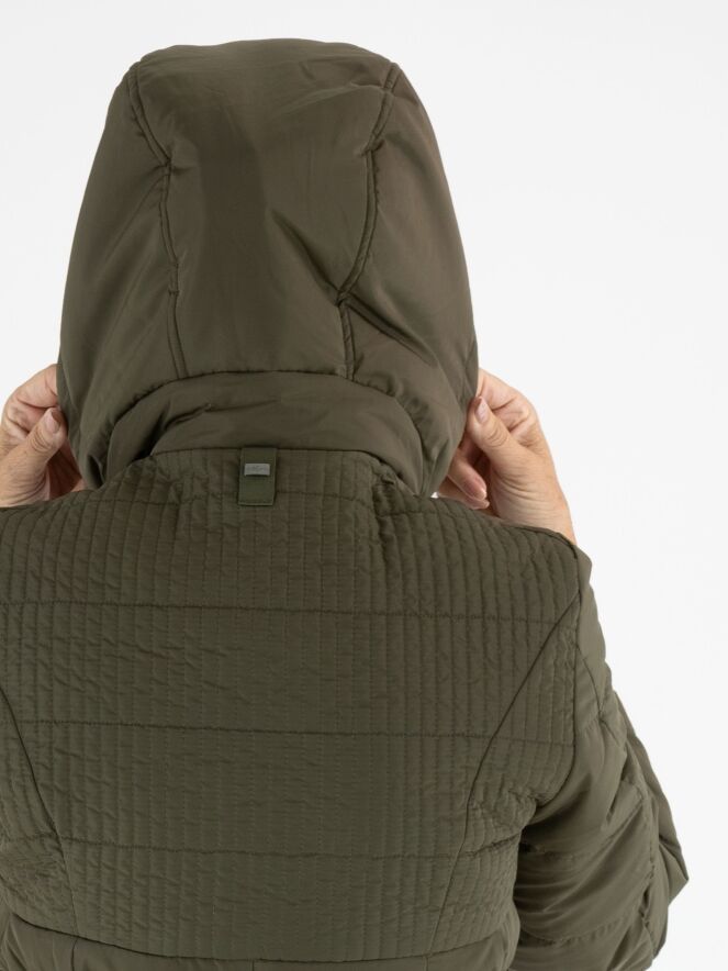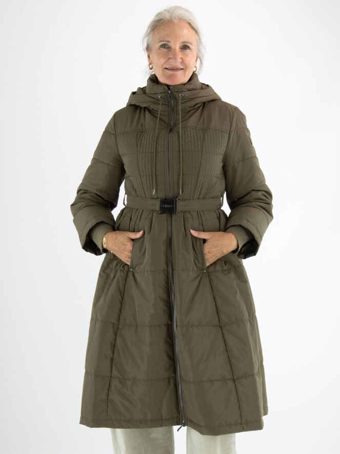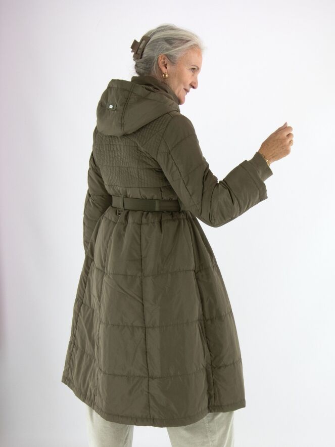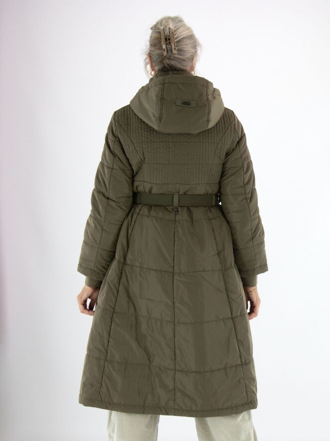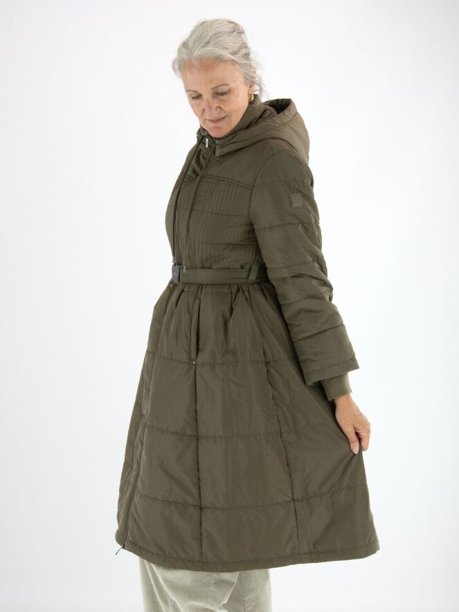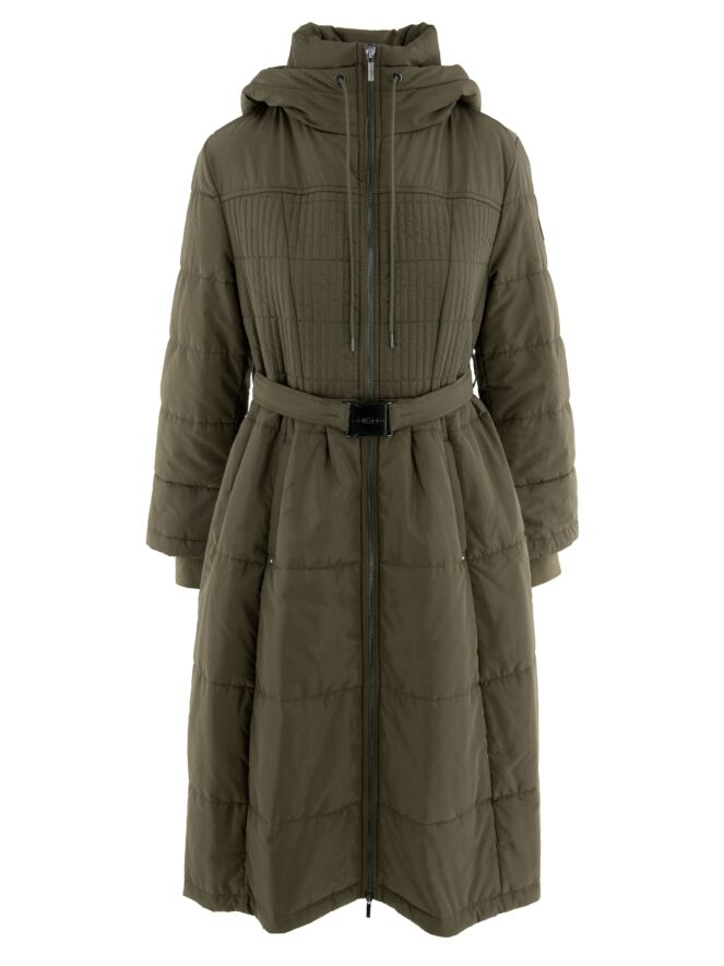 Langer Mantel von High in Olivgrün. In der Kapuzenkante ist ein Tunnelzug mit Kordel eingearbeitet. Auf Taillenhöhe befindet sich ein Gürtel mit nickelfarbener Schnalle. Der Stoff ist von der Brust bis zur Taille in einem Smokmuster gesteppt. Der Mantel hat Eingrifftaschen und kann bei 30 Grad gewaschen werden.
