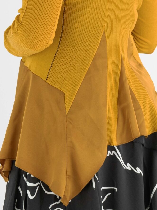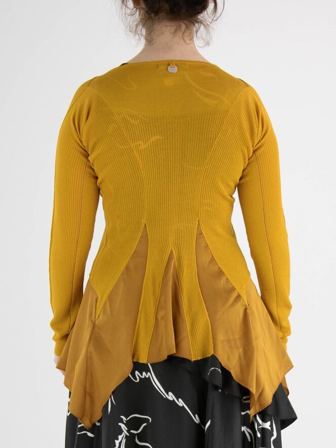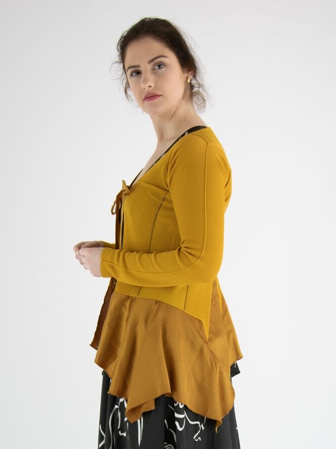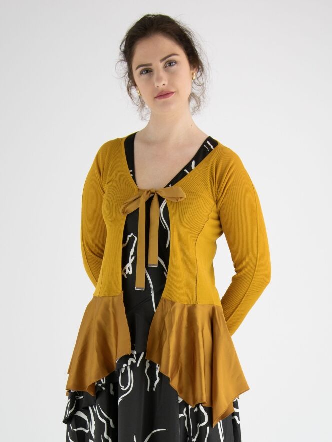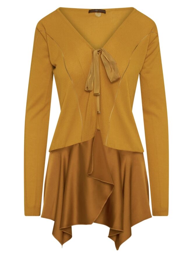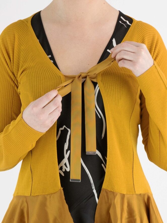 Ein fein gewebtes und leicht transparentes Strickjacke von High in Ockergelb. Auf Höhe der Brust gibt es eine Schließung mit zwei Bändern. In der Mitte ist der Stoff fein gerippt und an den Seiten glatt mit einer Ajourlinie an der Trennlinie. Unterhalb der Taille ist ein mattes Satinstoff. Diese Strickjacke kann von Hand gewaschen werden.