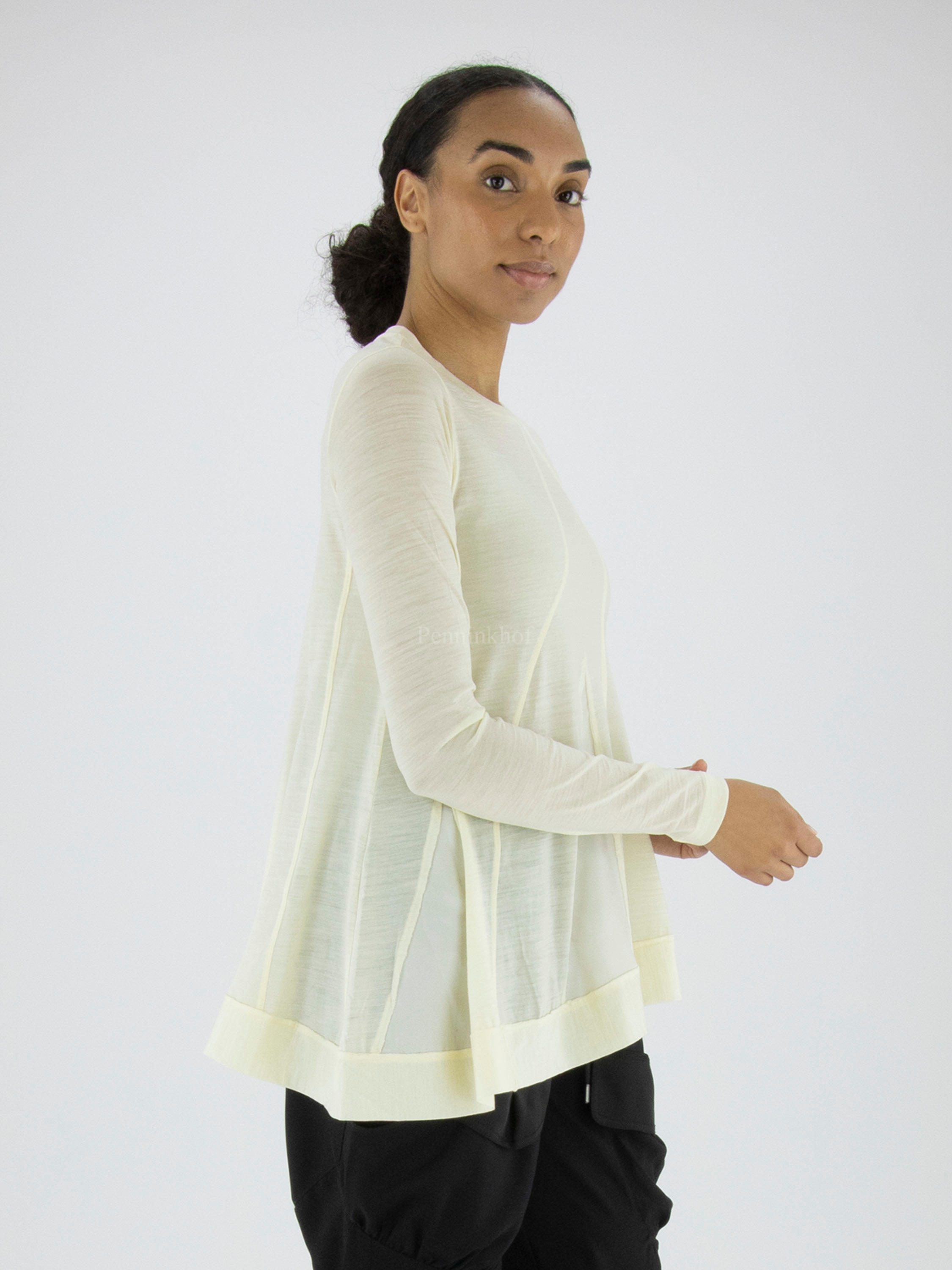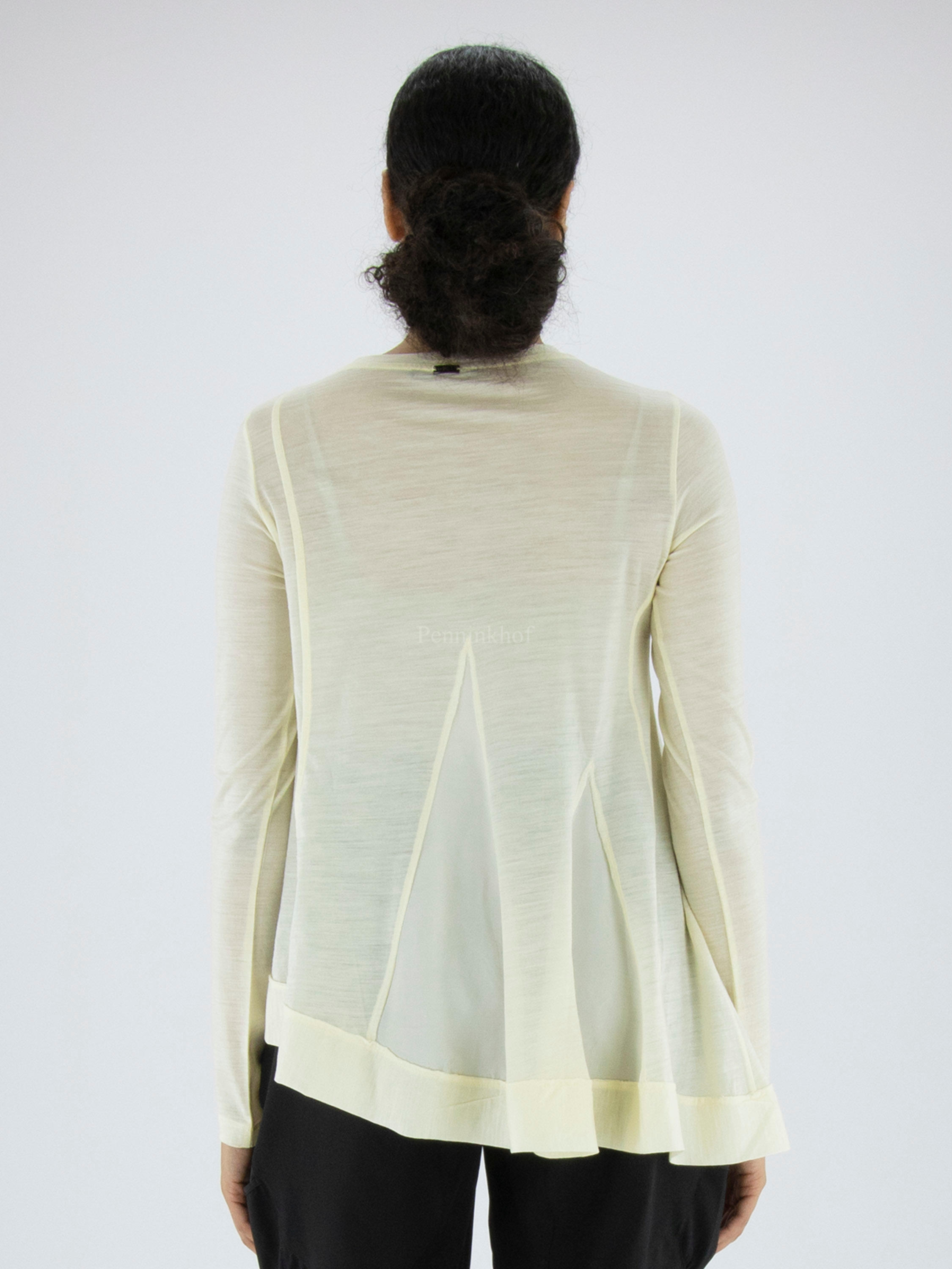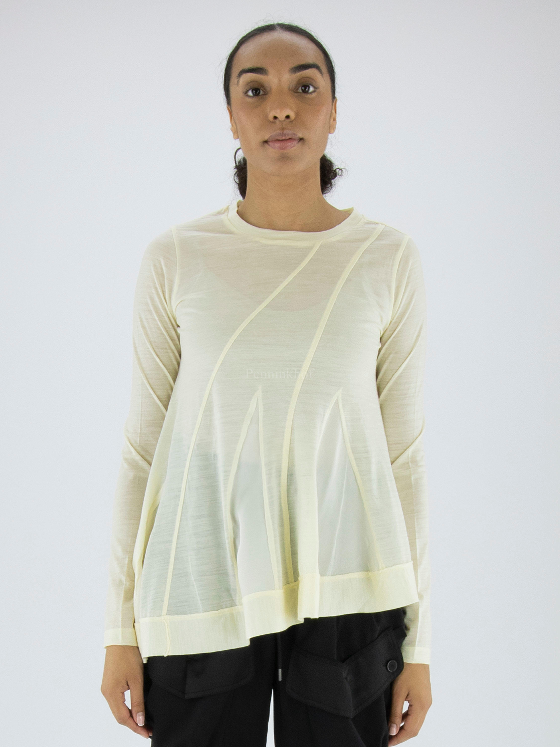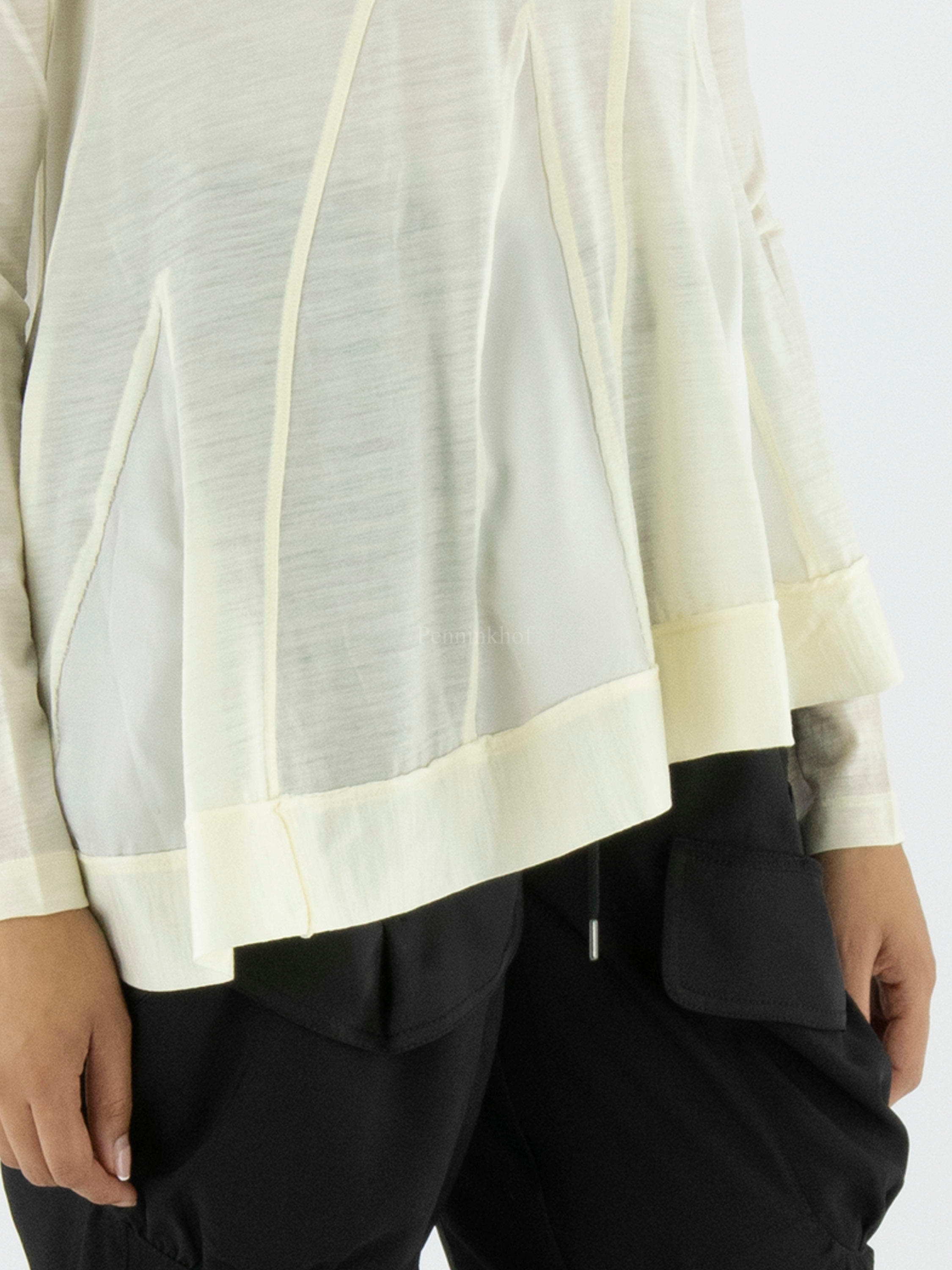 Ein Shirt von High in cremeweißer Farbe. Auf der Vorderseite befinden sich mehrere diagonale Nähte, zwischen denen ein matter Satinstoff liegt. Unten ist ein breites Band mit einer Naht. Dieses Shirt kann mit der Hand gewaschen werden.