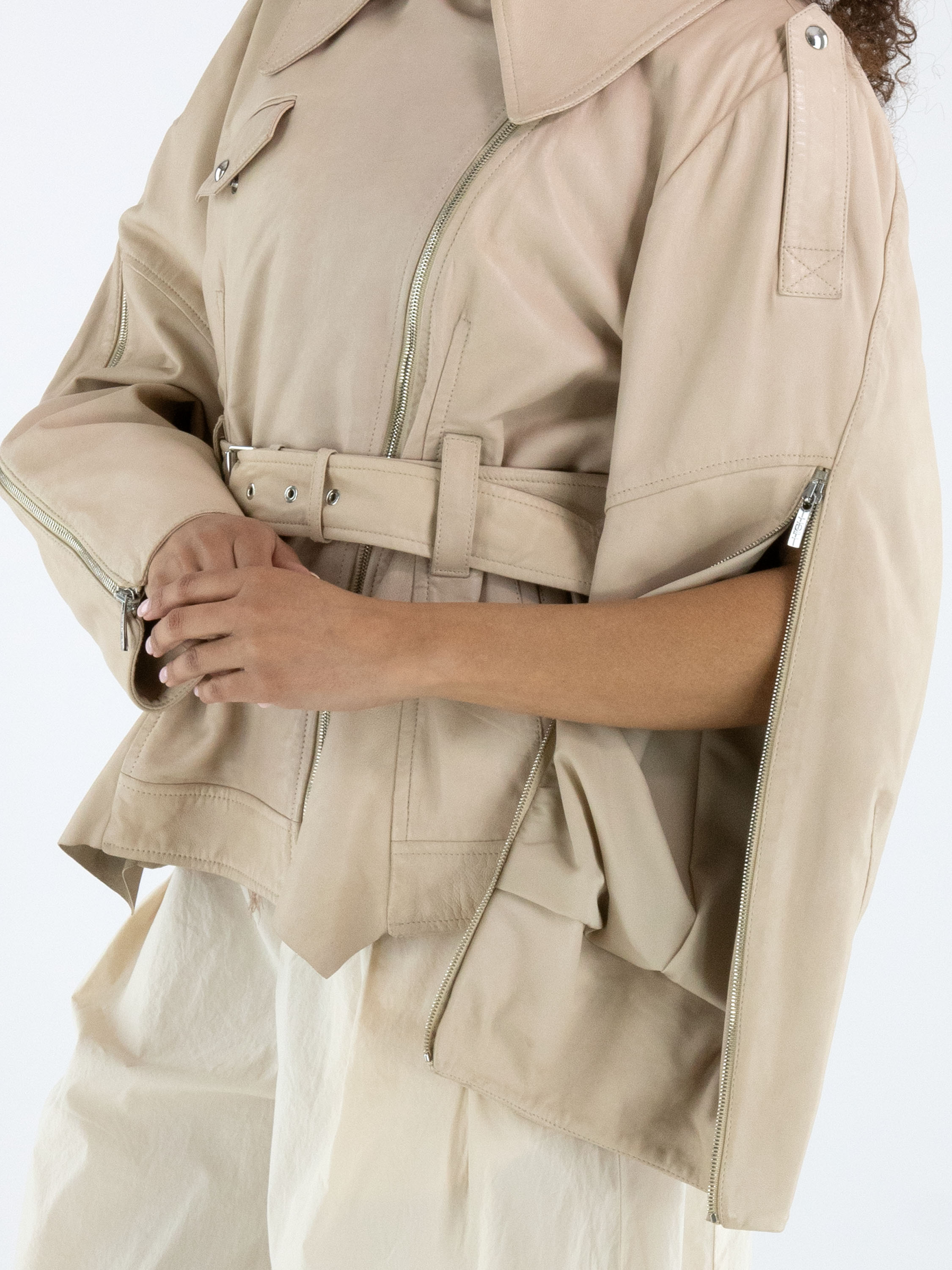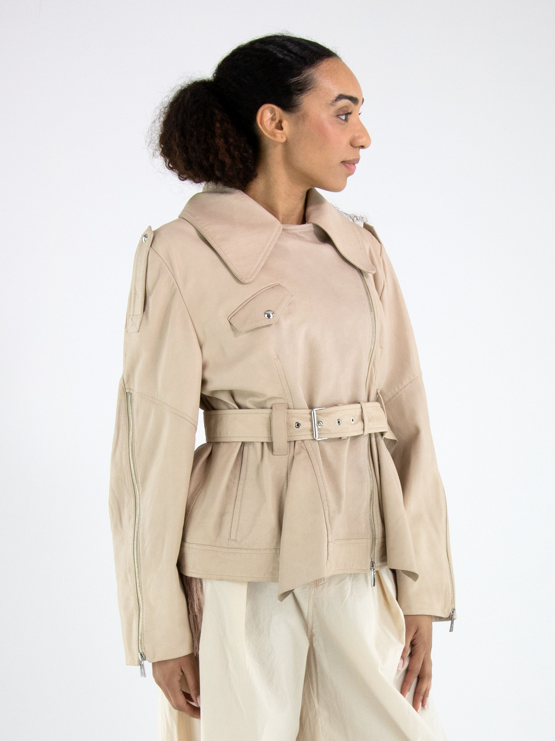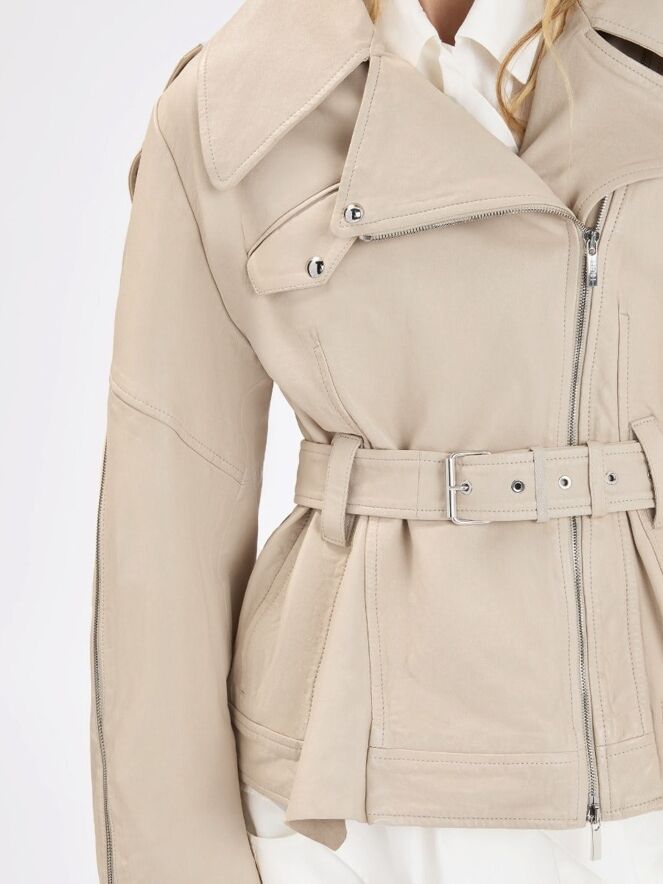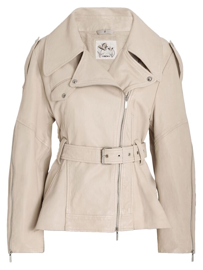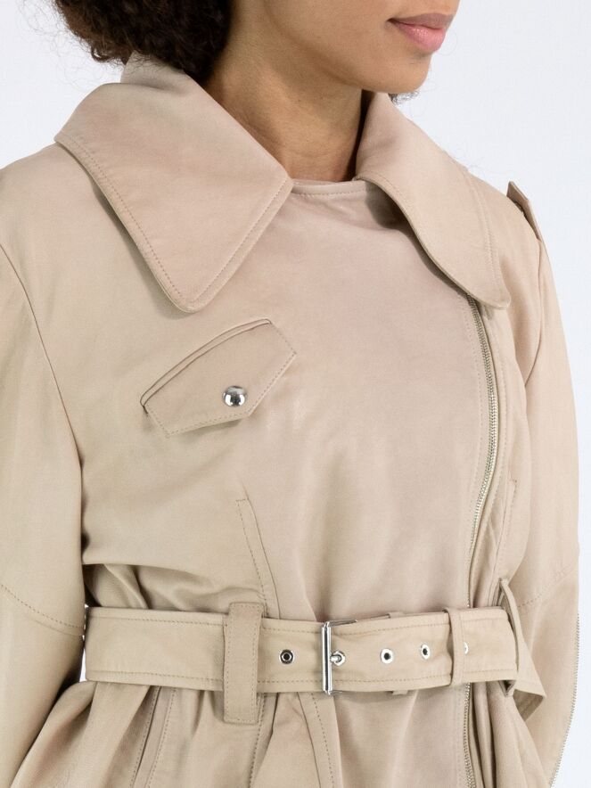Ledercoat von High in einem eleganten Beigeton. Mit breitem Kragen und asymmetrischem Reißverschluss gestaltet, überzeugt er durch eine markante, moderne Silhouette. Von den Ärmelenden verlaufen Reißverschlüsse bis über den Ellenbogen und setzen ein stilvolles, markantes Detail. Ein Gürtel aus demselben Leder betont die Taille feminin. Der Coat ist gefüttert und darf nicht gewaschen werden.