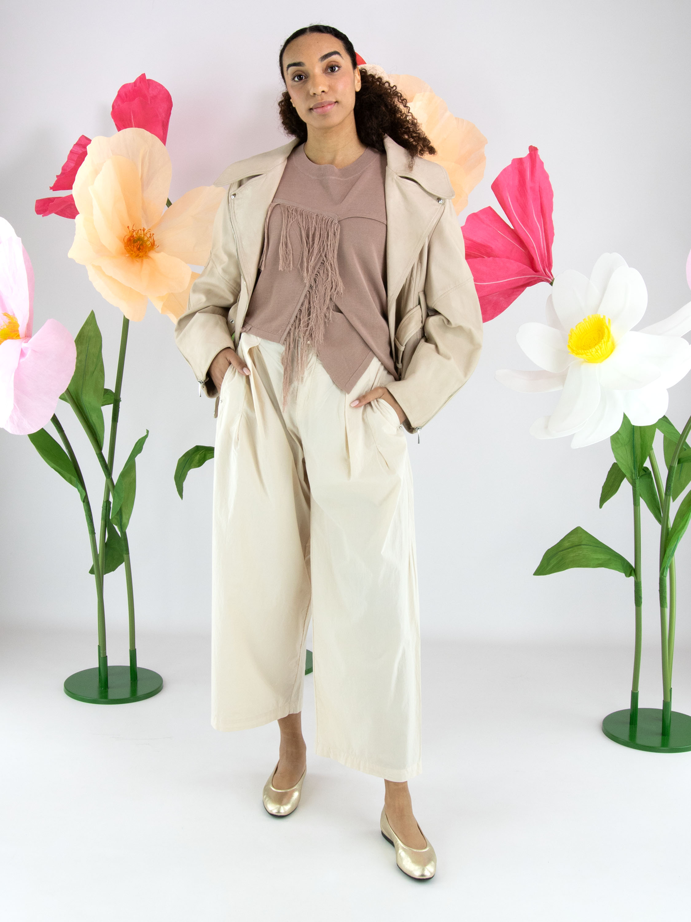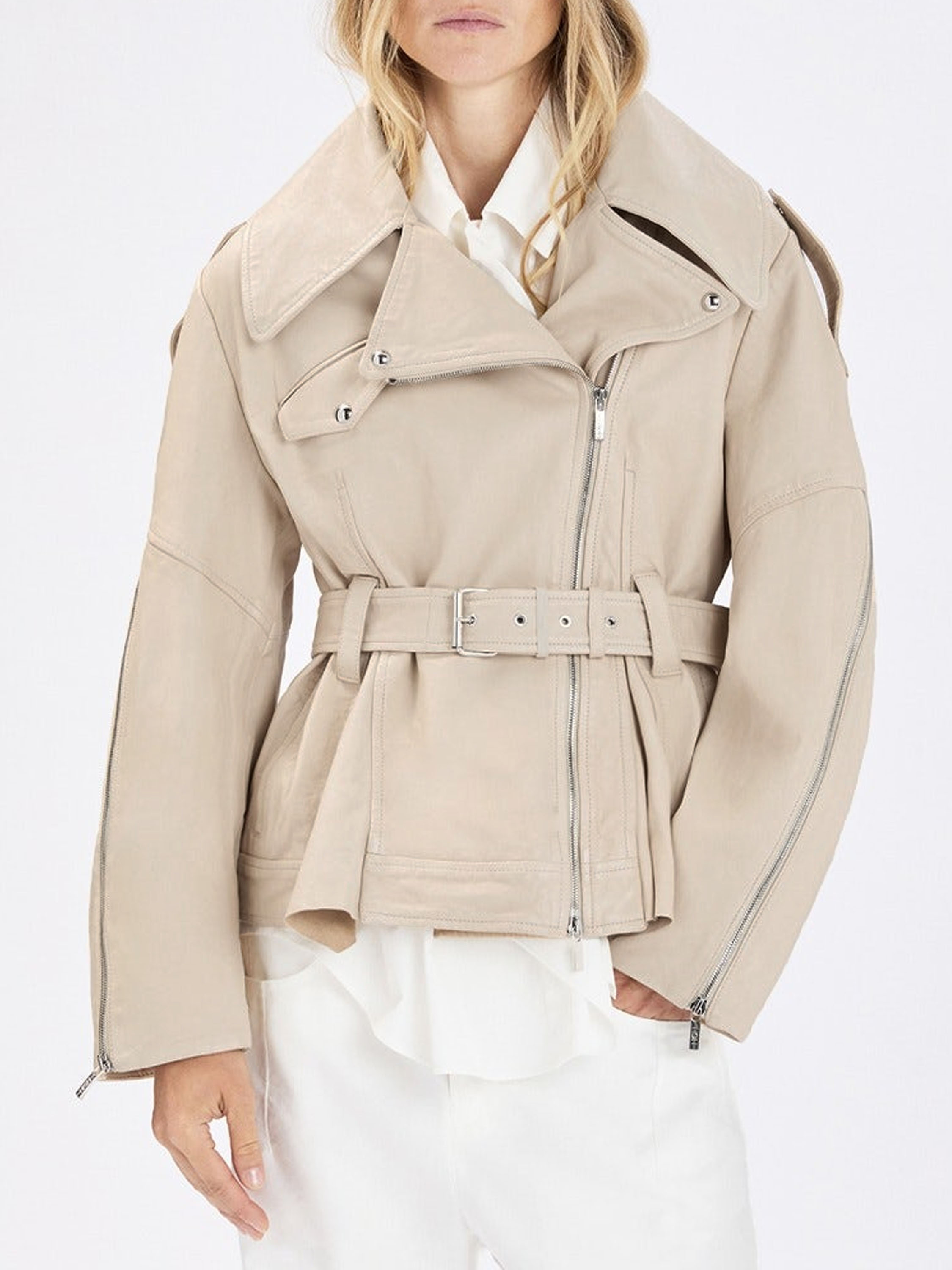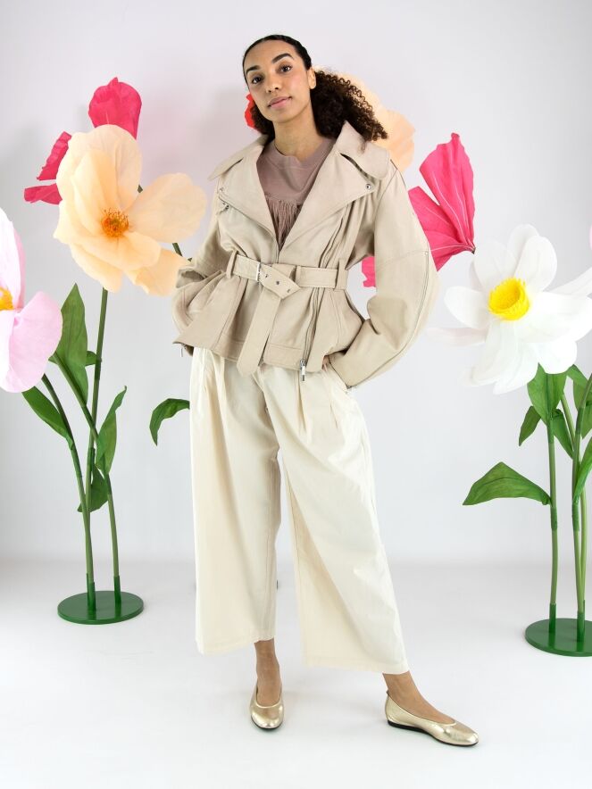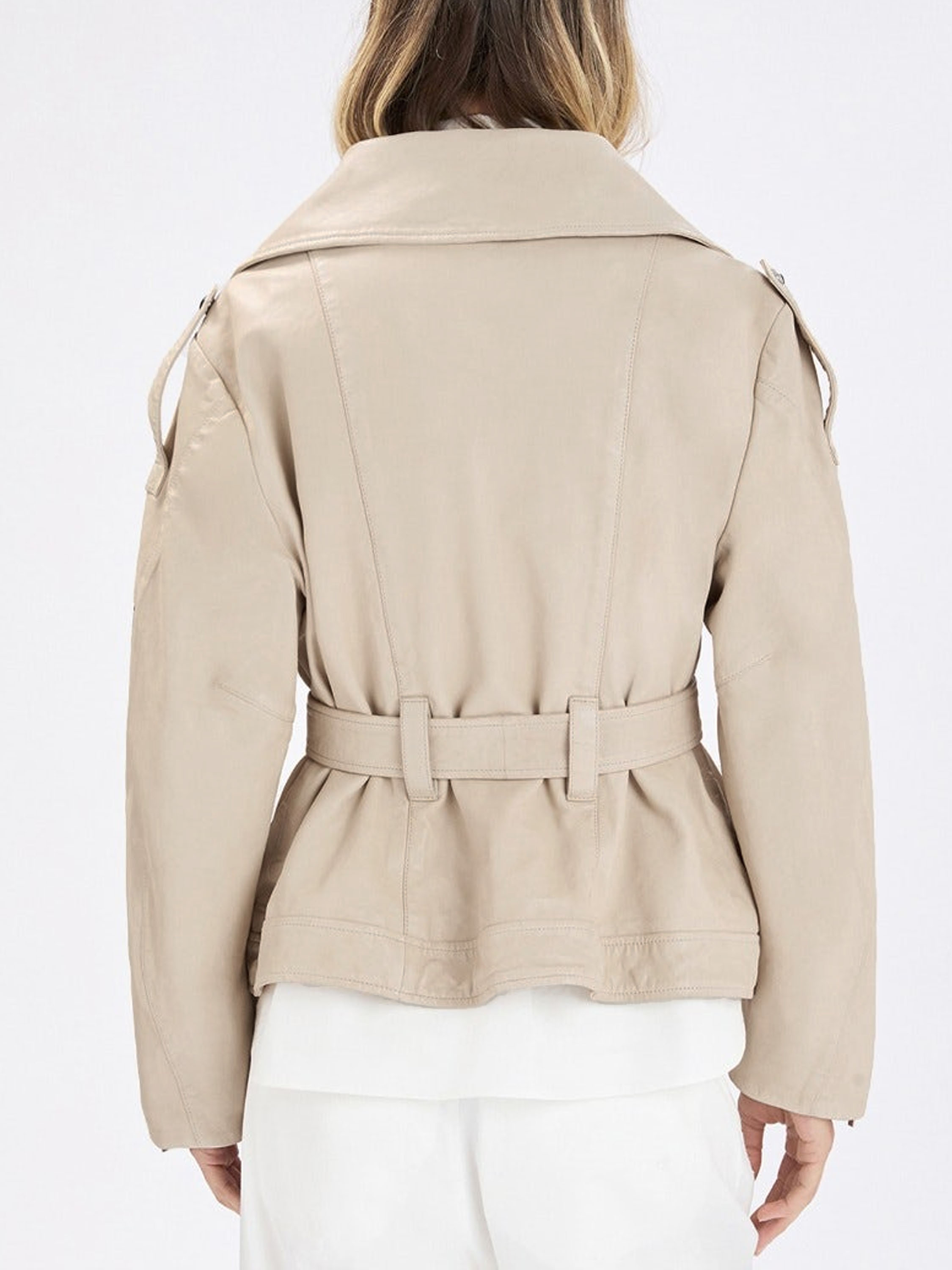 Ledercoat von High in einem eleganten Beigeton. Mit breitem Kragen und asymmetrischem Reißverschluss gestaltet, überzeugt er durch eine markante, moderne Silhouette. Von den Ärmelenden verlaufen Reißverschlüsse bis über den Ellenbogen und setzen ein stilvolles, markantes Detail. Ein Gürtel aus demselben Leder betont die Taille feminin. Der Coat ist gefüttert und darf nicht gewaschen werden.