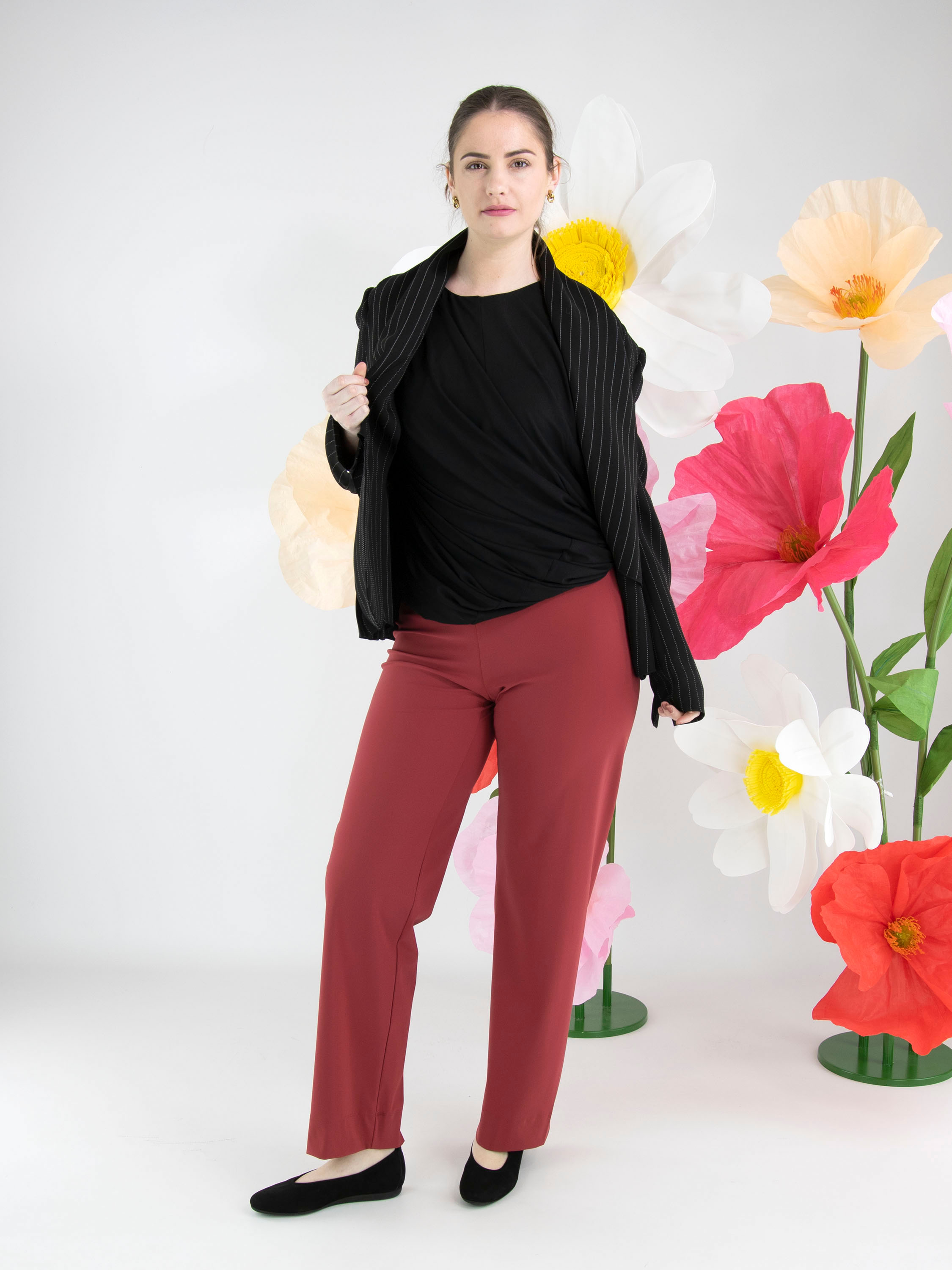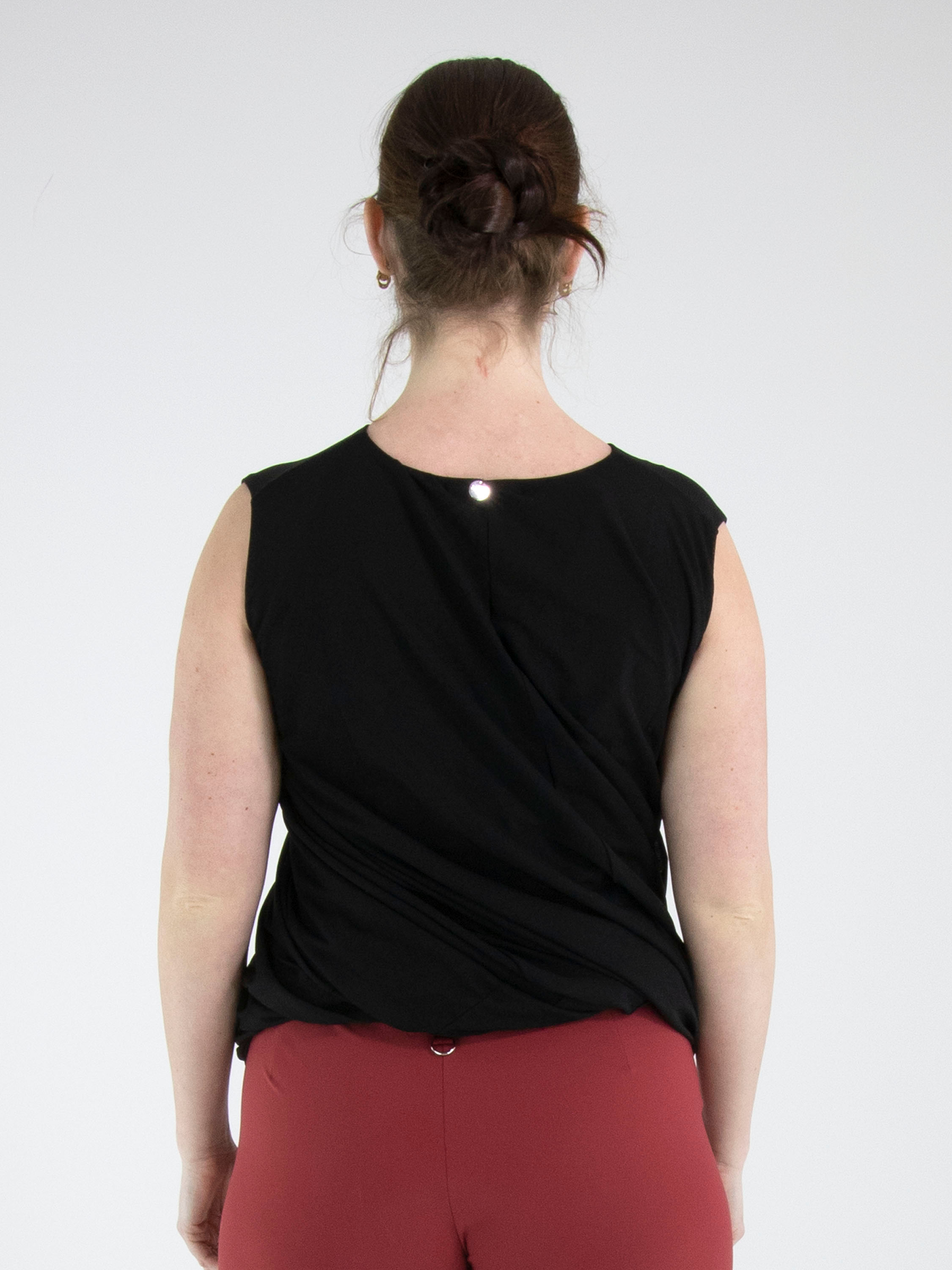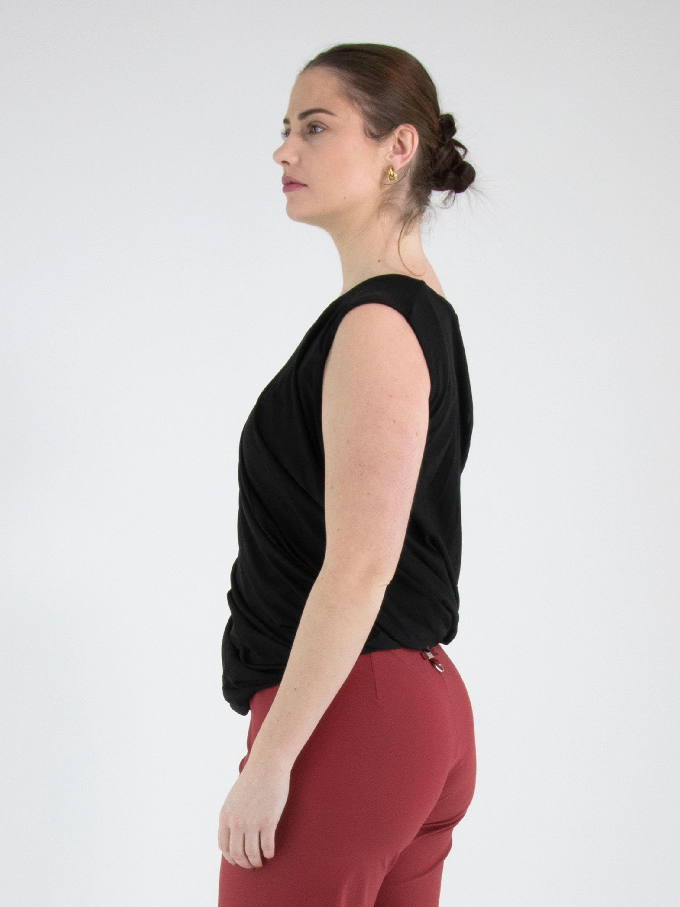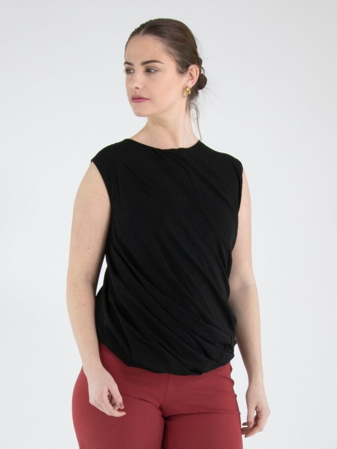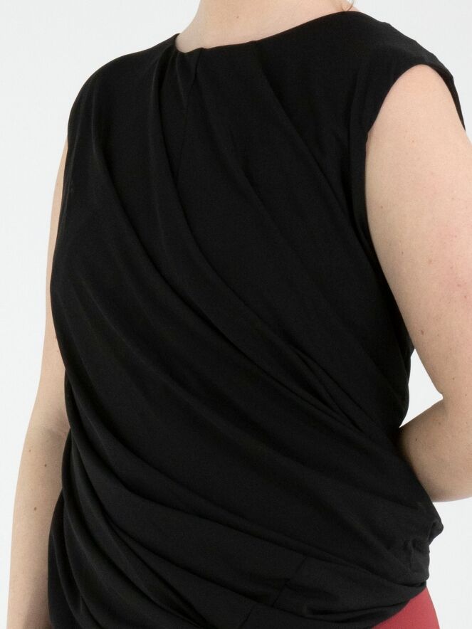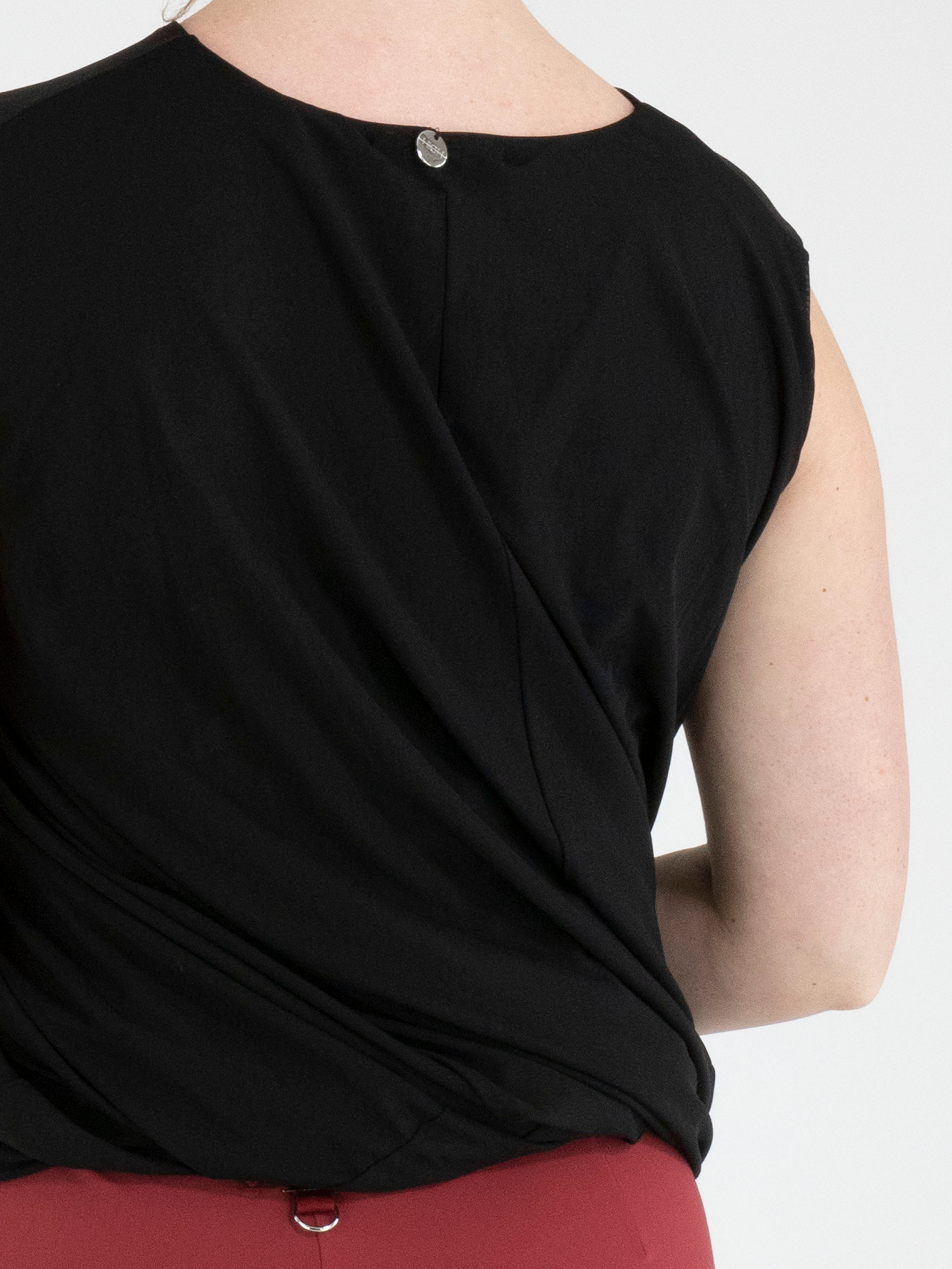 Ein Top von High in Schwarz. Der Top ist mit einer doppellagigen Stoffverarbeitung gearbeitet, die innen gedreht ist und so einen besonderen Drapiereffekt erzeugt. Der Top hat einen Rundhalsausschnitt und kann von Hand gewaschen werden.