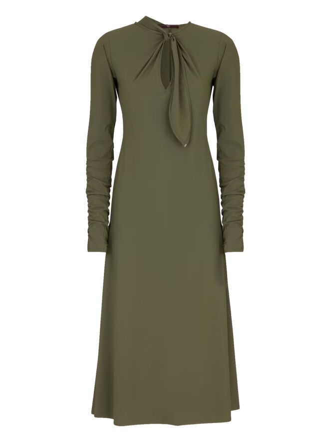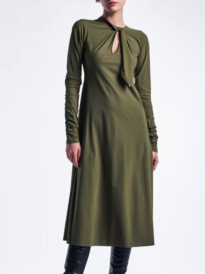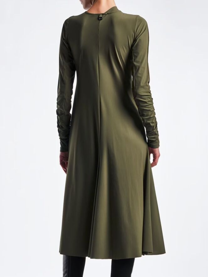 Ein Kleid von High in Olivgrün. In der Mitte des hohen Rundhalsausschnitts befindet sich eine Wickeloptik mit einem Ausschnitt bis zur Brust. Der Stoff der langen Ärmel ist ab dem Ellbogen entlang der Naht fein gefaltet. Ab der Taille hat das Kleid eine leichte A-Linie. Dieses Kleid kann von Hand gewaschen werden.