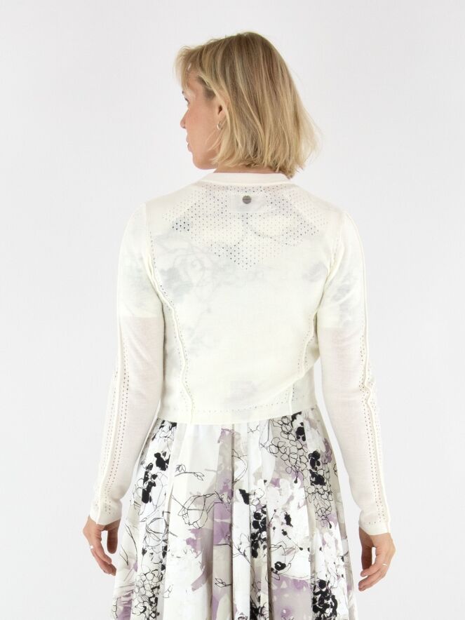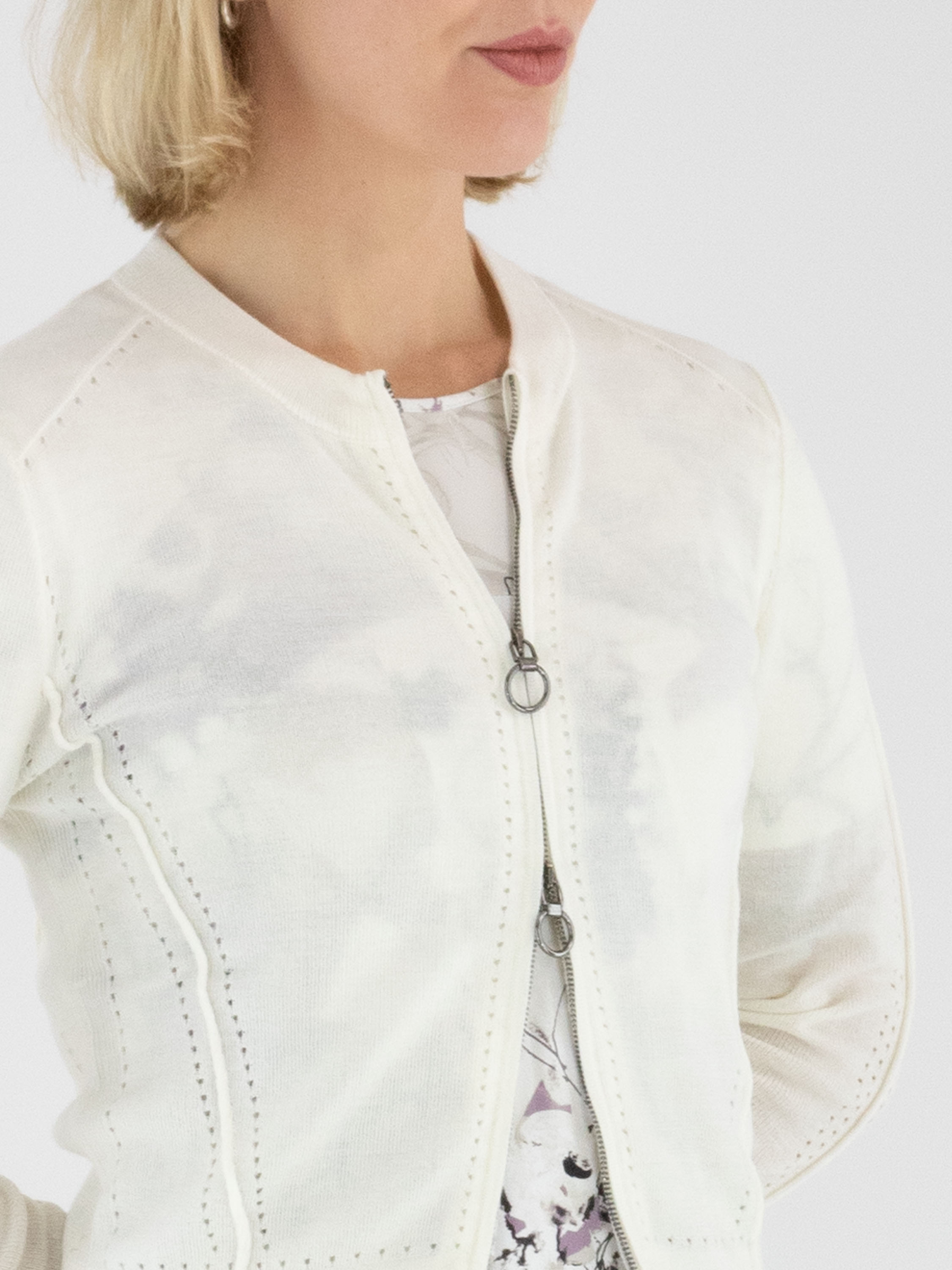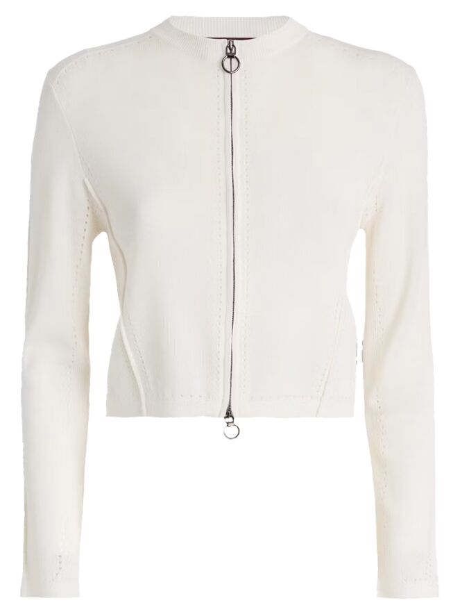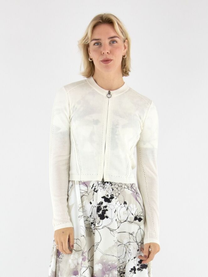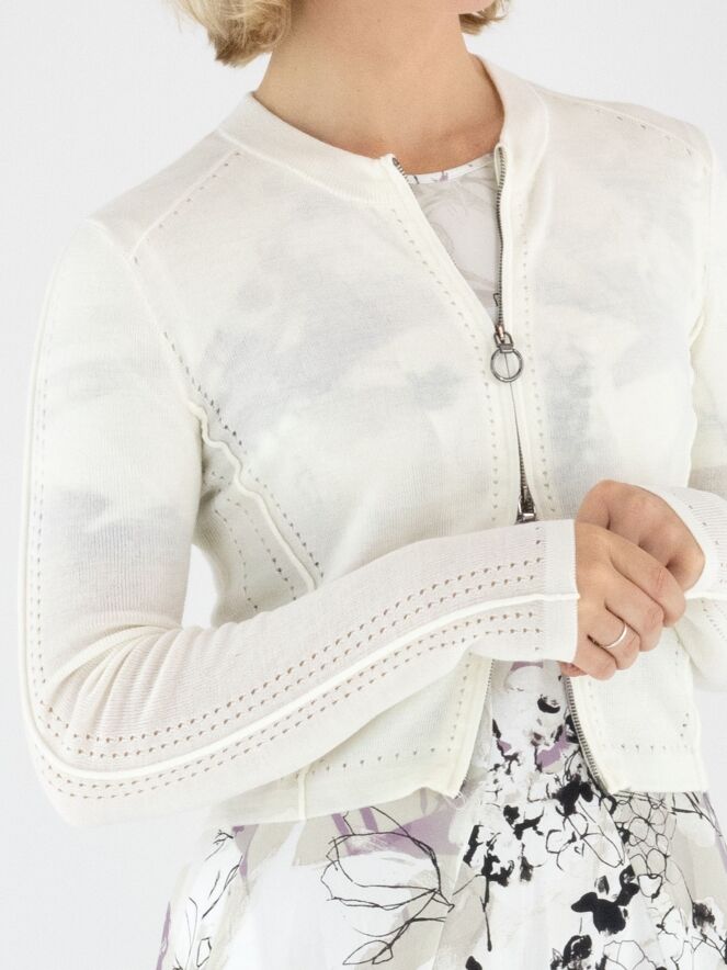 Eine kurze Strickjacke von High in Cremeweiß. Am Rundhalsausschnitt verläuft ein fein gerippter Strickbund. Mehrere Ajourlinien ziehen sich entlang des Reißverschlusses, der Seiten und über die langen Ärmel und verleihen der Jacke eine raffinierte, leichte Ausstrahlung. Diese Jacke kann per Hand gewaschen werden.