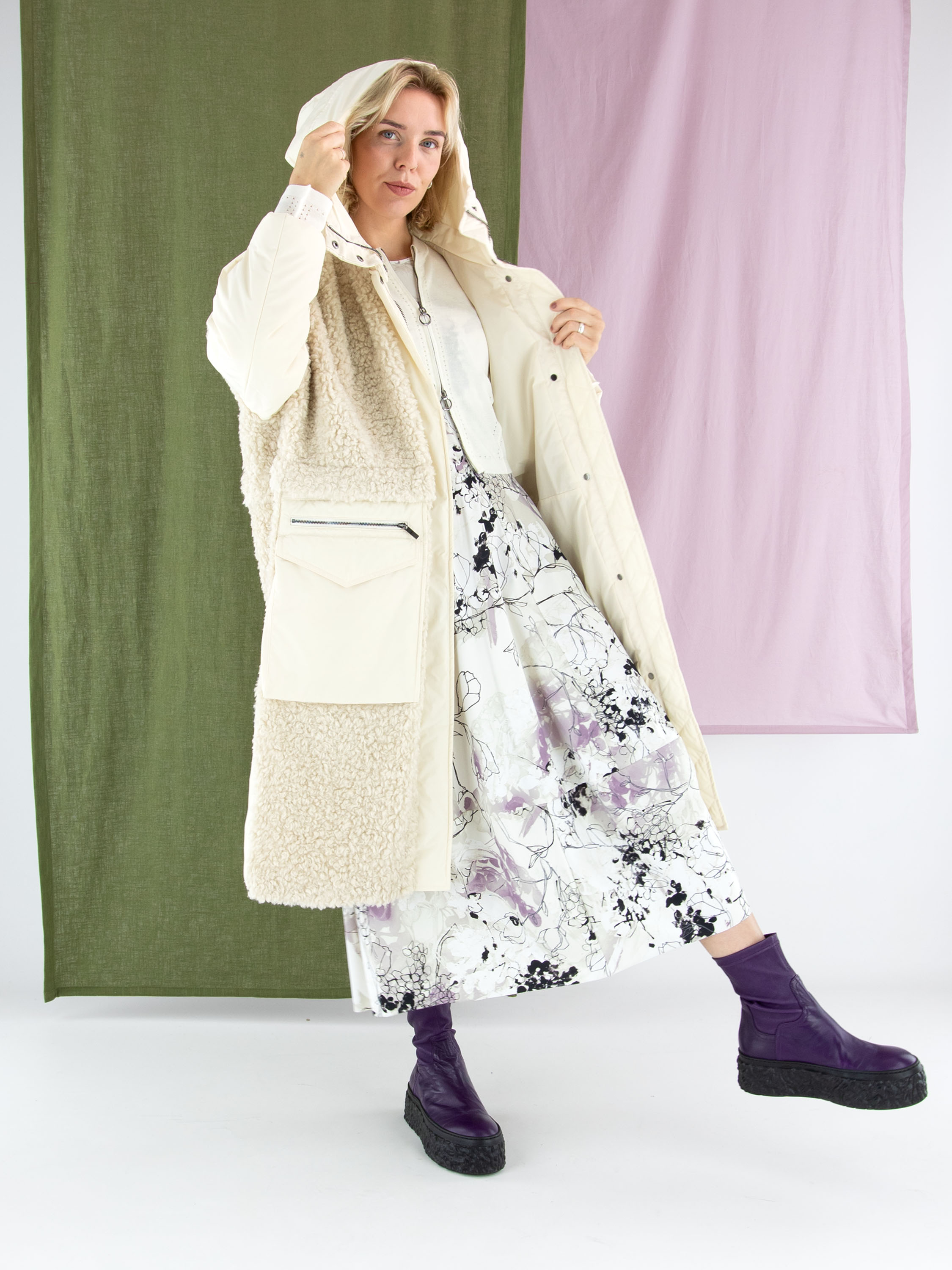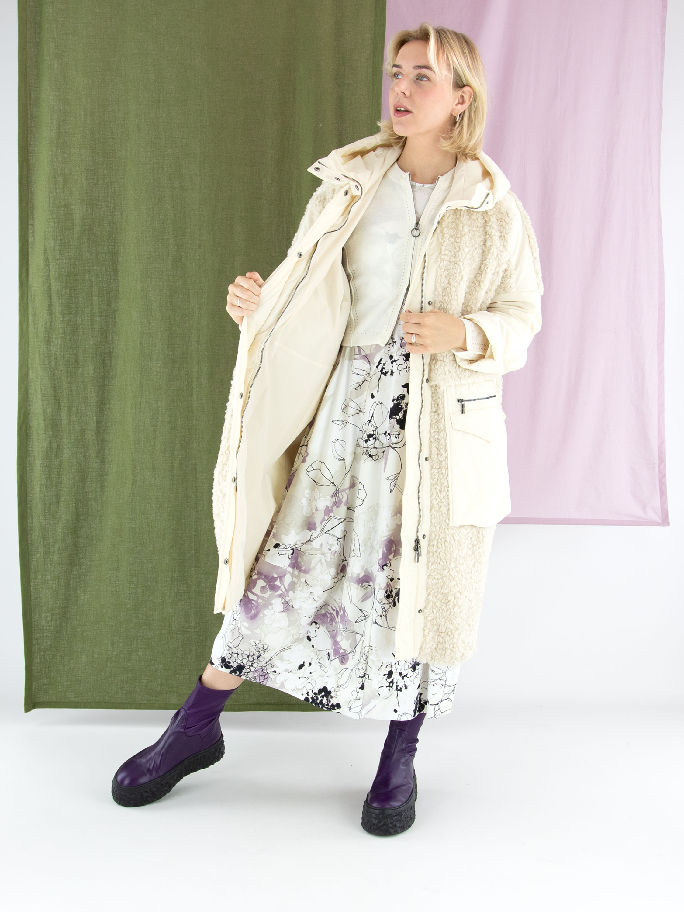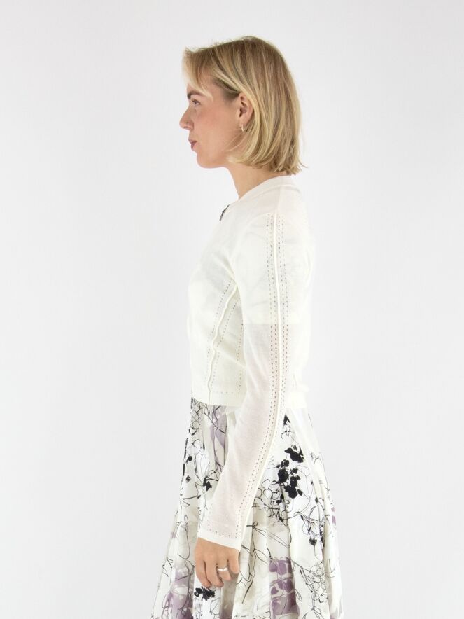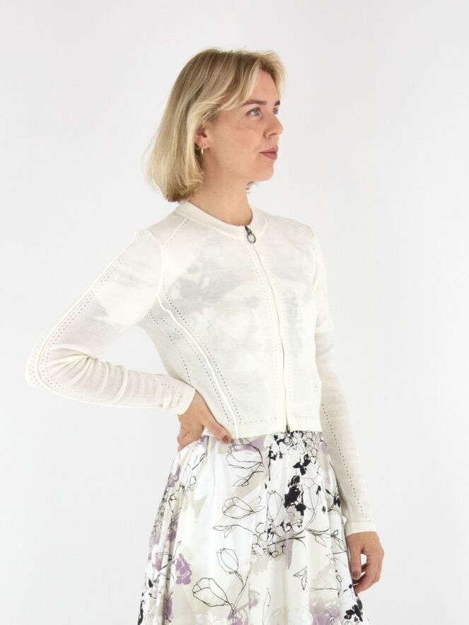 Eine kurze Strickjacke von High in Cremeweiß. Am Rundhalsausschnitt verläuft ein fein gerippter Strickbund. Mehrere Ajourlinien ziehen sich entlang des Reißverschlusses, der Seiten und über die langen Ärmel und verleihen der Jacke eine raffinierte, leichte Ausstrahlung. Diese Jacke kann per Hand gewaschen werden.