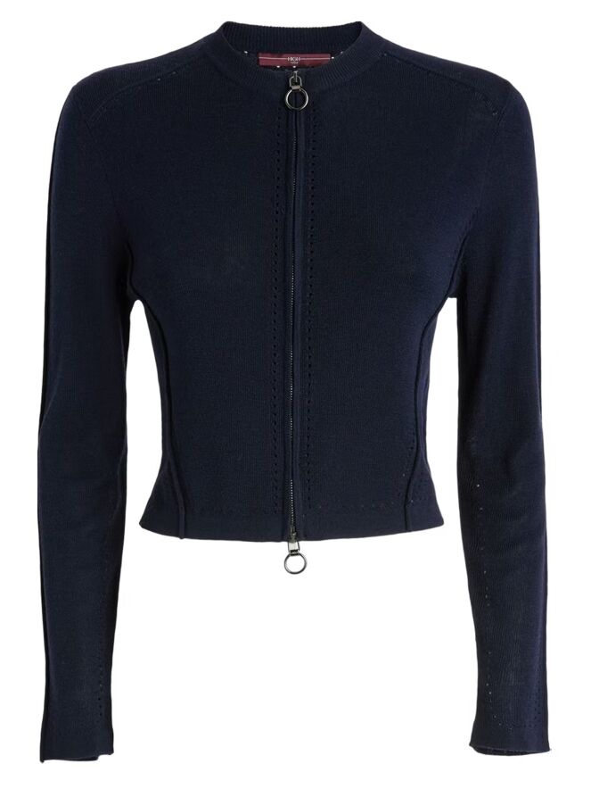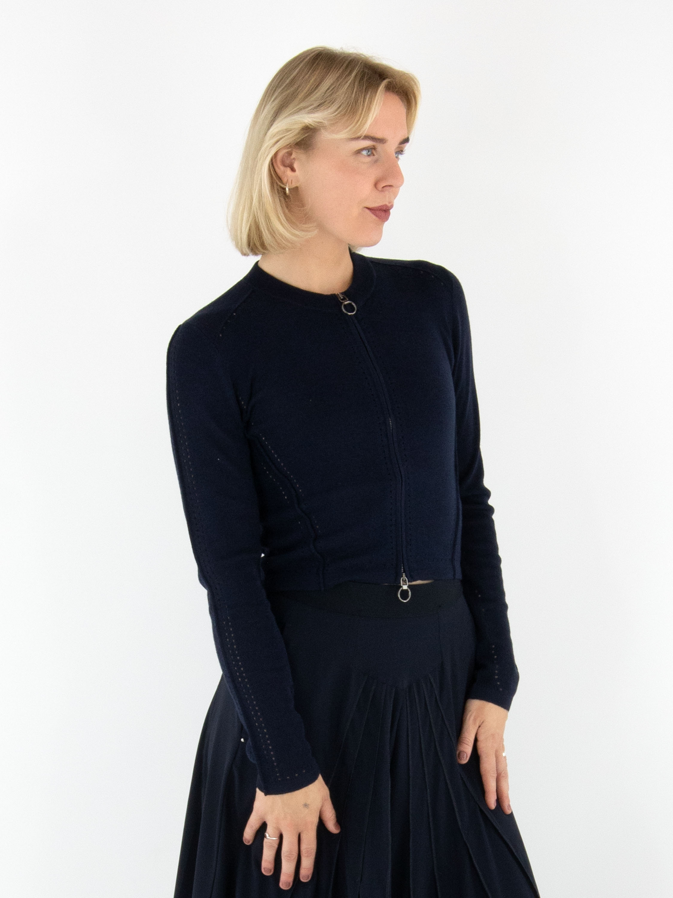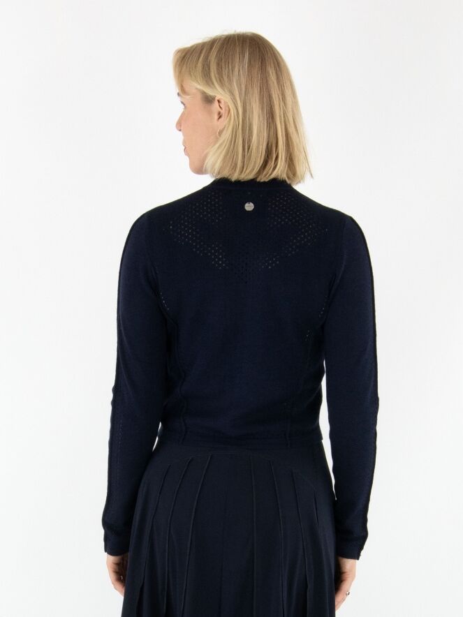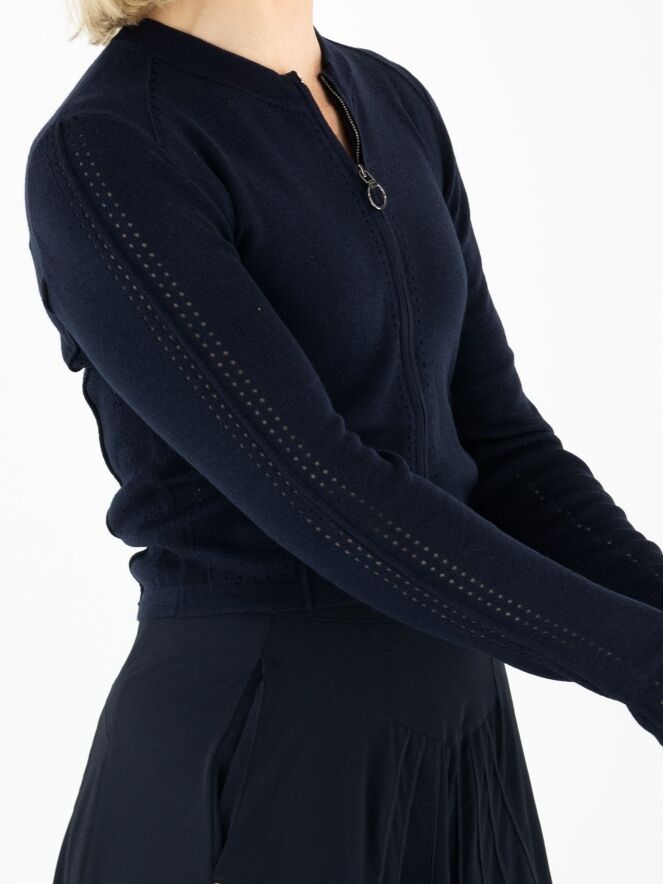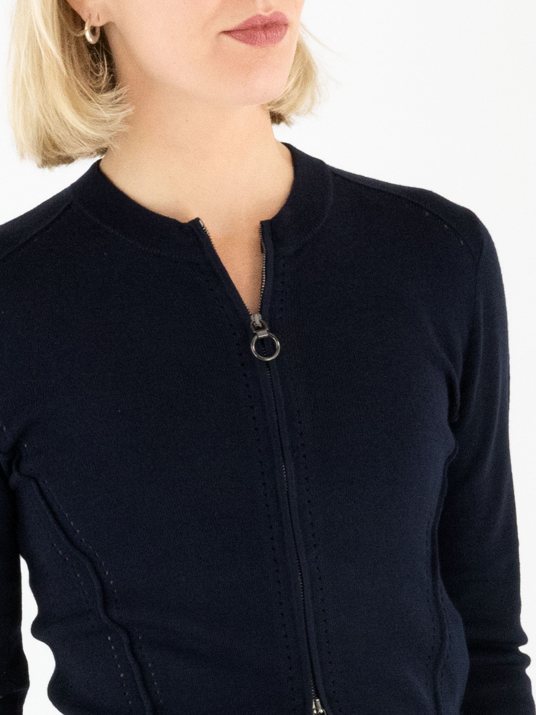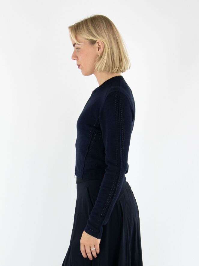 Eine kurze Strickjacke von High in Marineblau. Entlang des Rundhalsausschnitts verläuft ein fein gerippter Strickbund. Entlang des Reißverschlusses, an den Seiten und über die langen Ärmel ziehen sich mehrere Ajourlinien, die der Jacke eine raffinierte und moderne Ausstrahlung verleihen. Diese Strickjacke kann per Hand gewaschen werden.
