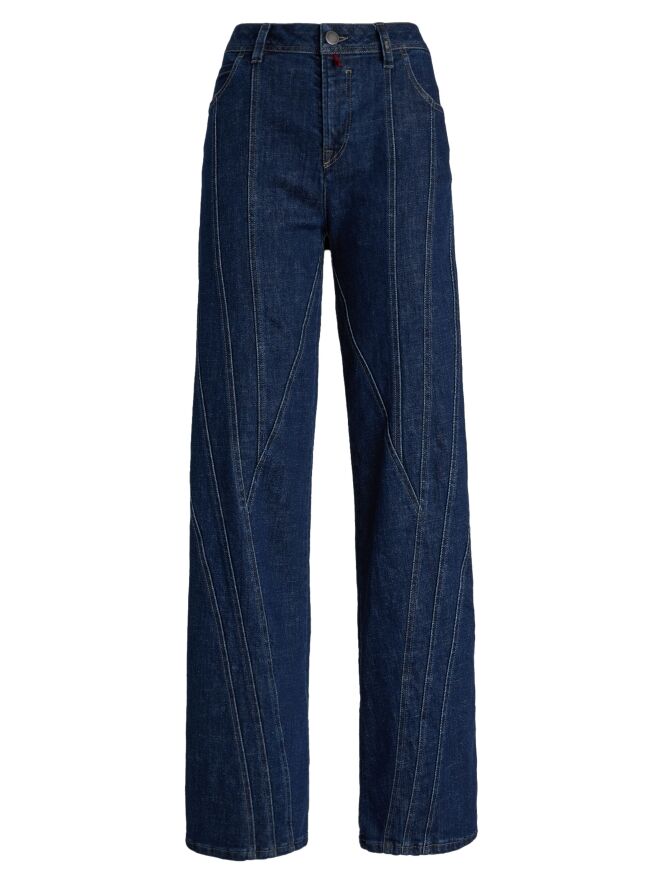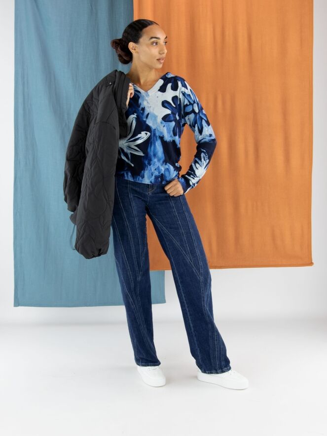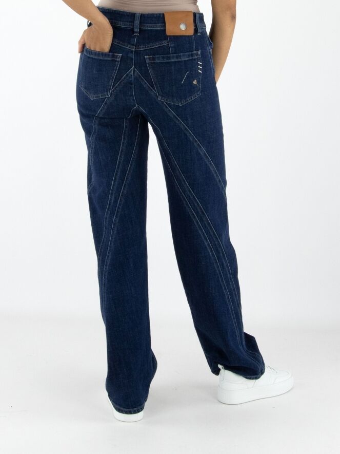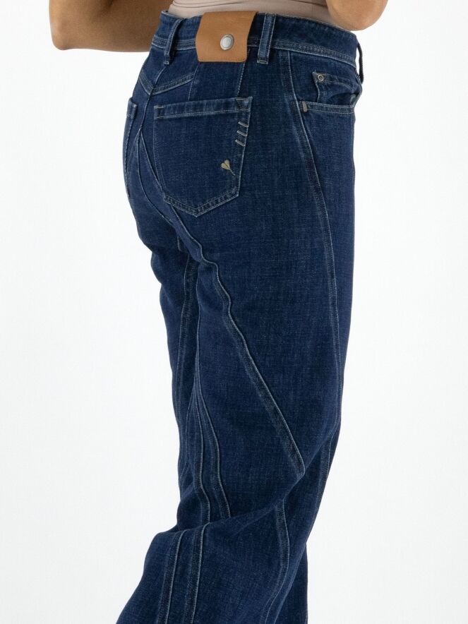 Jeans von High in einer klassischen Denimfarbe. Im 5-Pocket-Stil mit gerade geschnittenen Beinen. Mehrere dekorative Doppelsteppnähte verlaufen vertikal und diagonal vom Bund und den Taschen aus. Diese Jeans darf bei 30 Grad gewaschen werden.