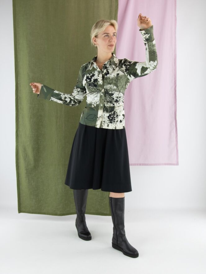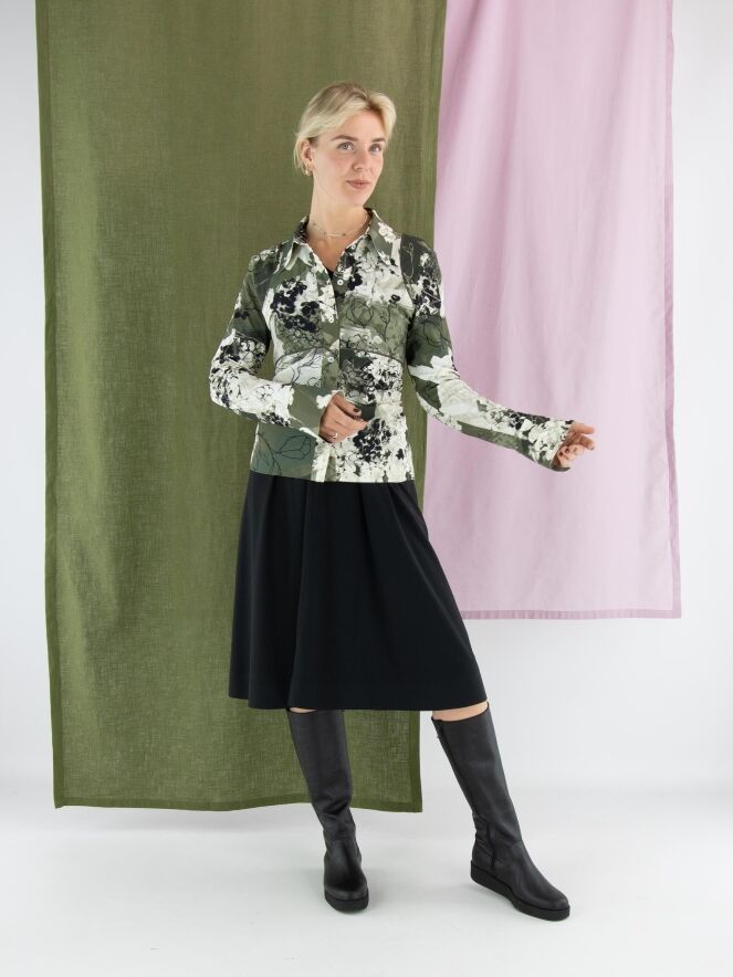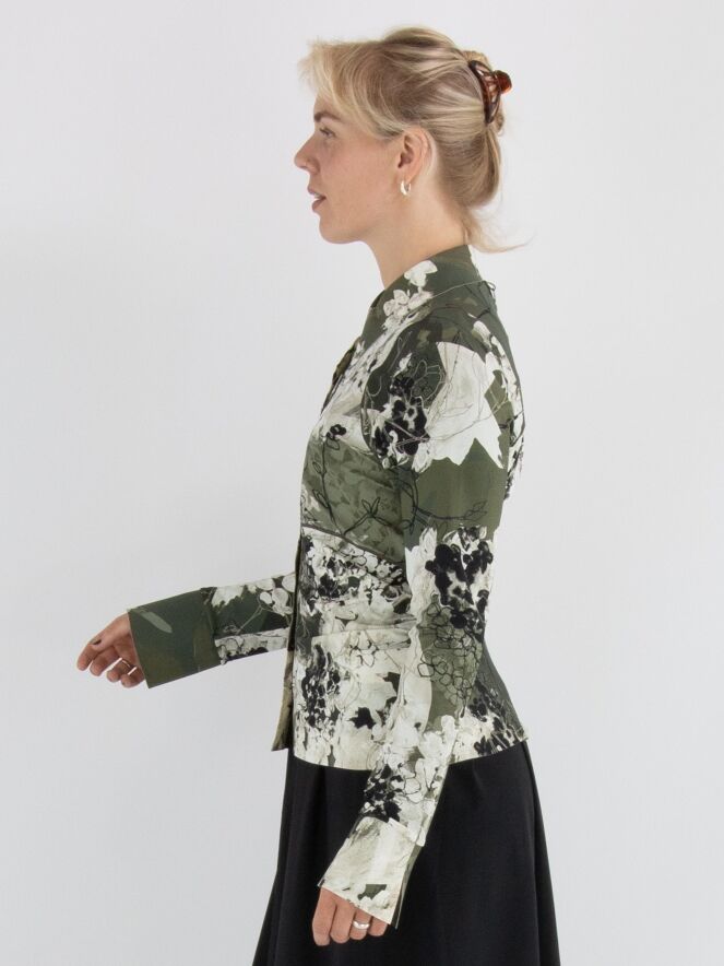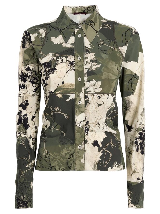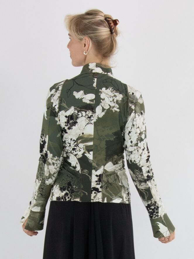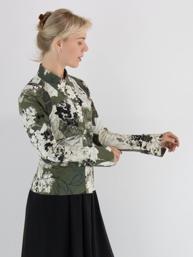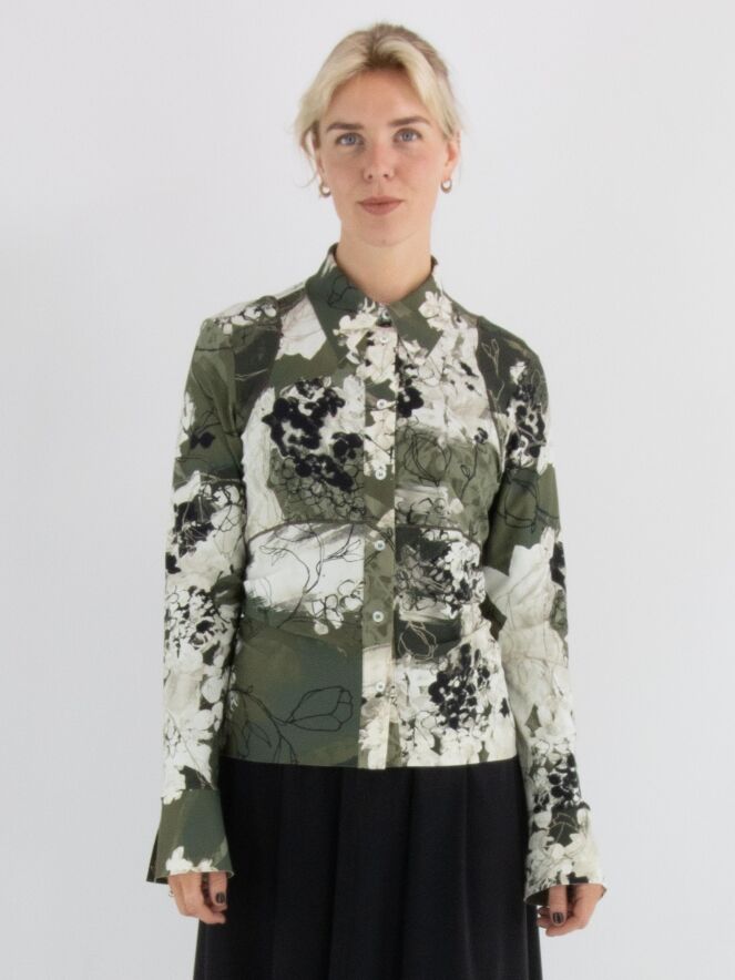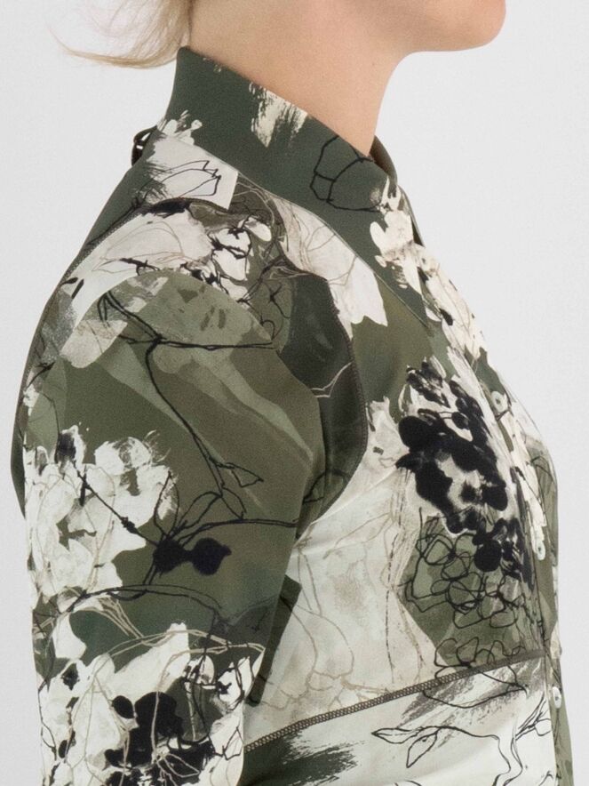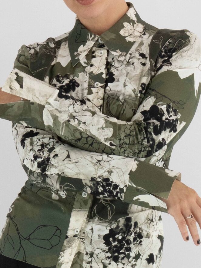 Bluse von High mit einem grafischen Blumenmuster in Olivgrün, Beige und Schwarz auf cremeweißem Hintergrund. Entlang der Seitennähte ist der Stoff gesmokt. Diese Bluse sollte von Hand gewaschen werden.