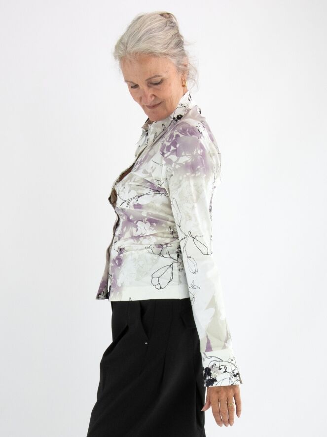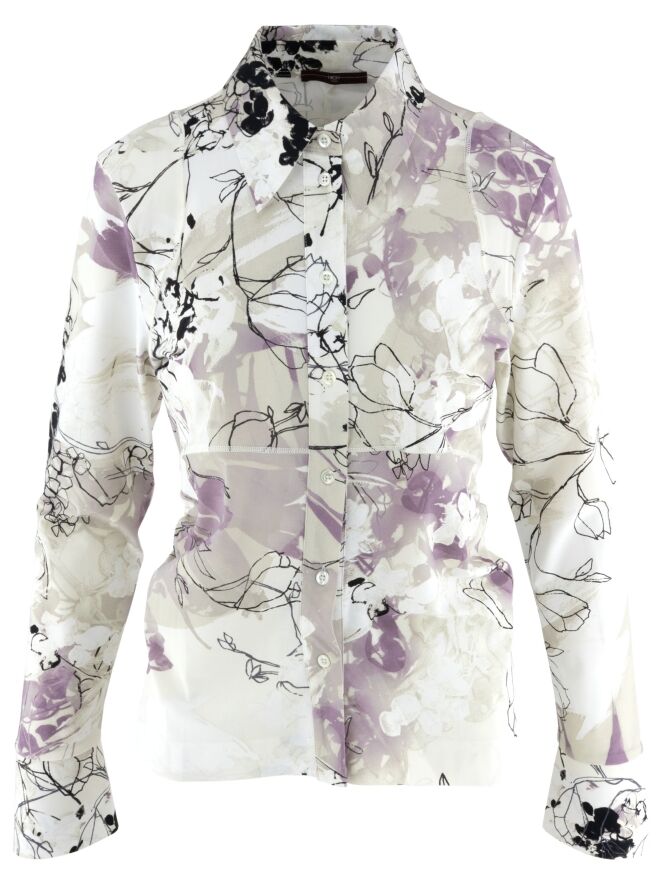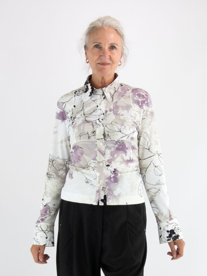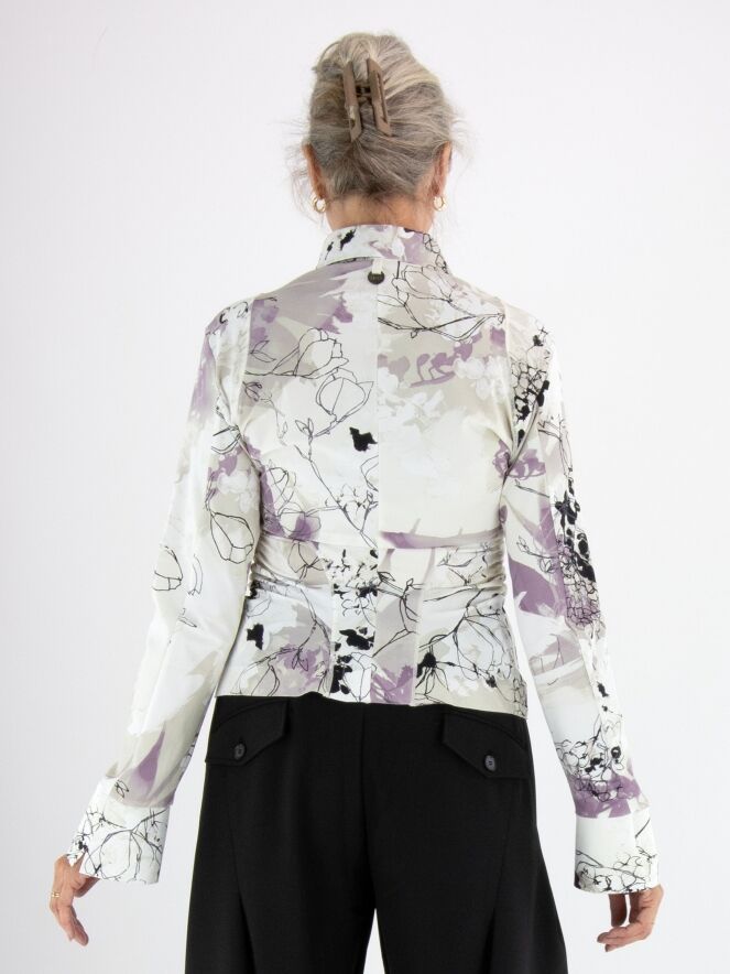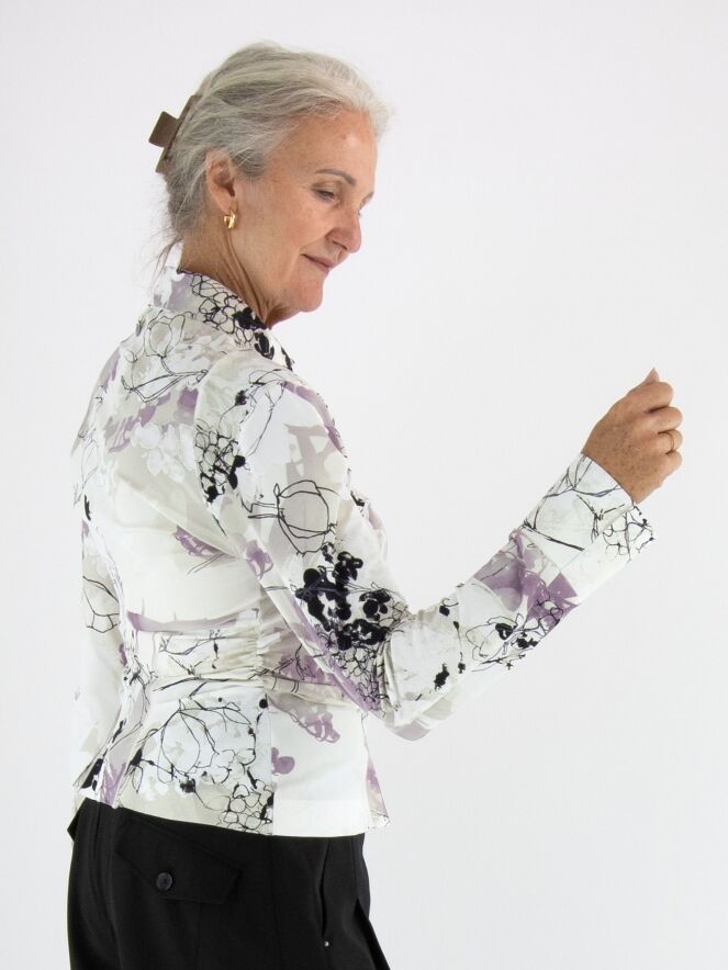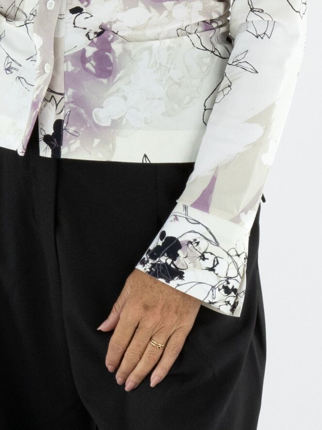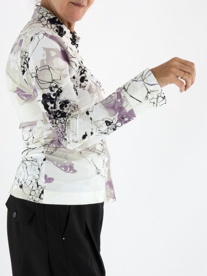 Bluse von High mit einem grafischen Blumenmuster in Lila, Beige und Schwarz auf einem cremeweißen Hintergrund. Entlang der Seitennähte ist der Stoff gesmokt. Diese Bluse sollte von Hand gewaschen werden.