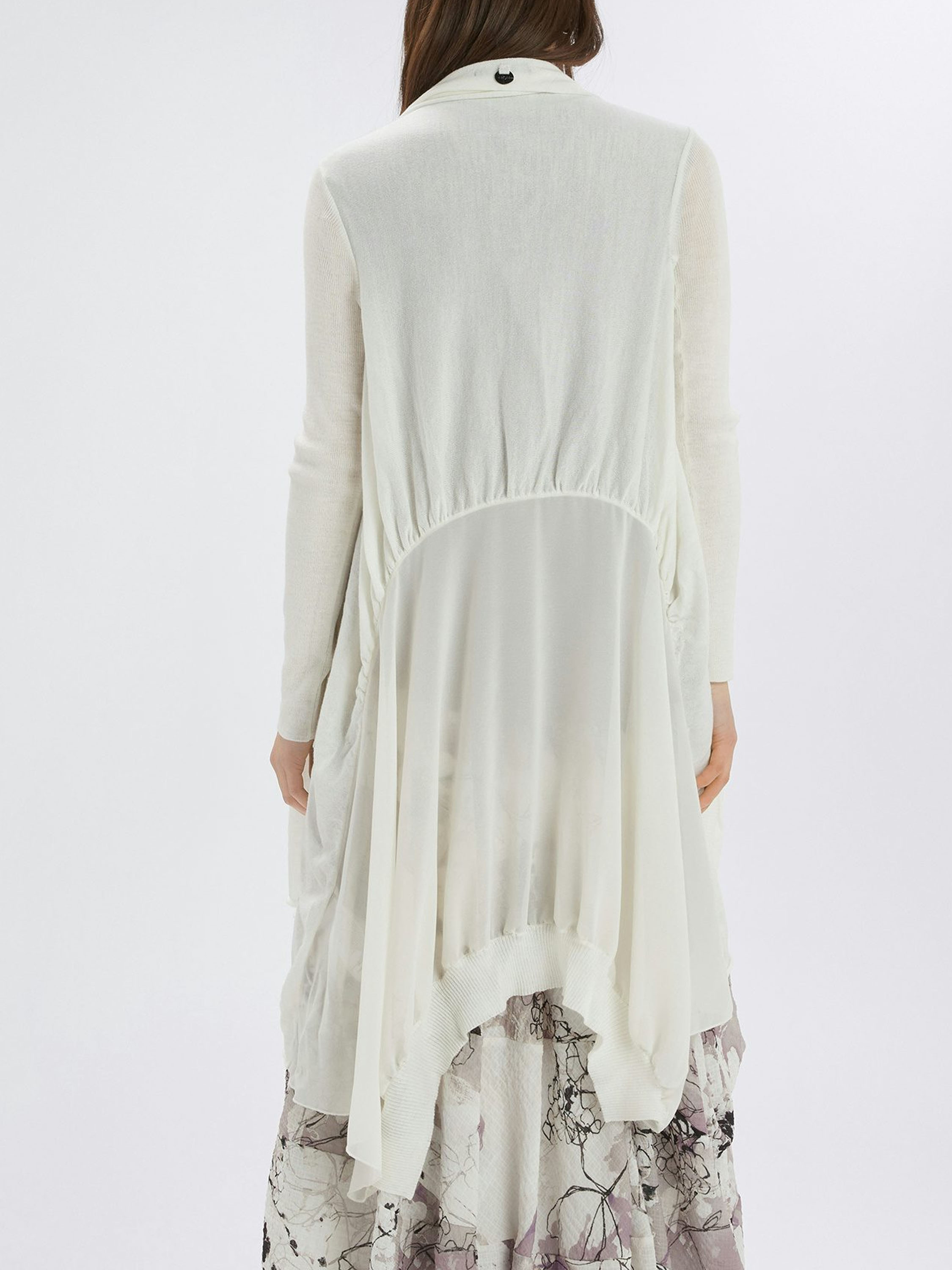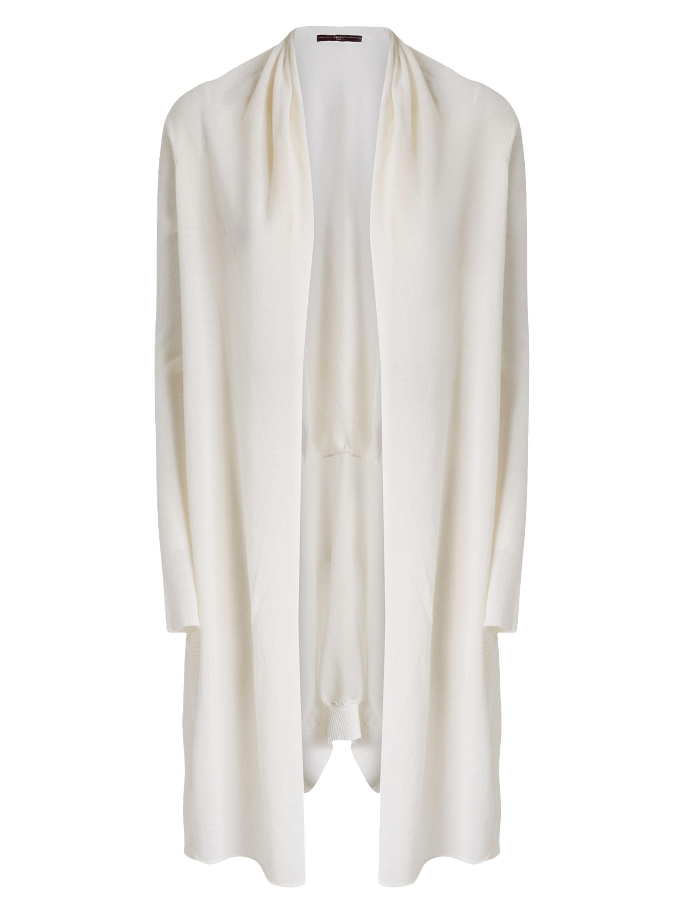 Eine lange, luxuriöse Strickjacke von High in Cremeweiß. Die Jacke hat einen Schalkragen und keinen Verschluss. Auf der Rückseite befindet sich auf Taillenhöhe eine rund geschnittene Naht, unterhalb der der Stoff transparent ist. Diese Strickjacke kann von Hand gewaschen werden.