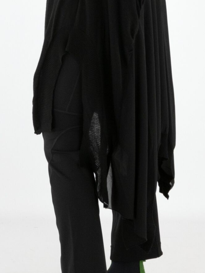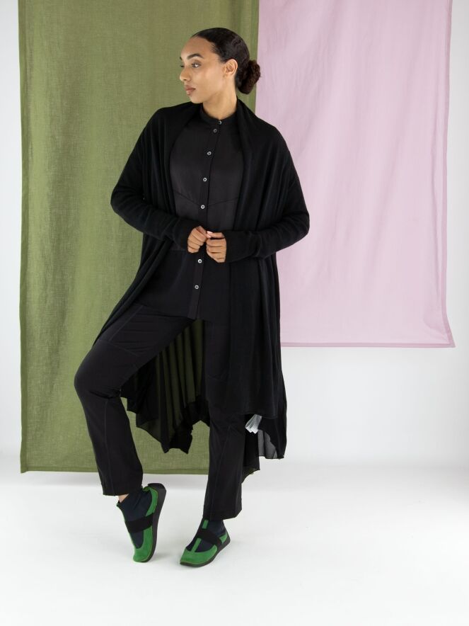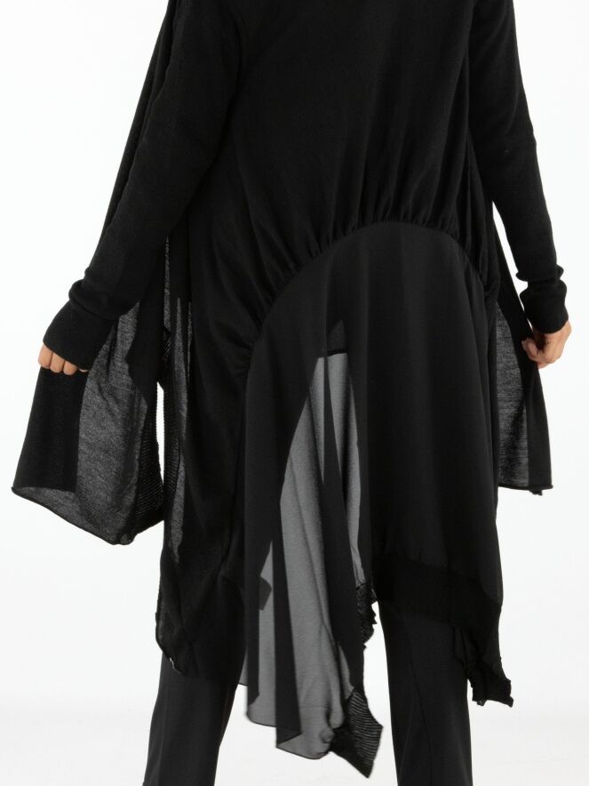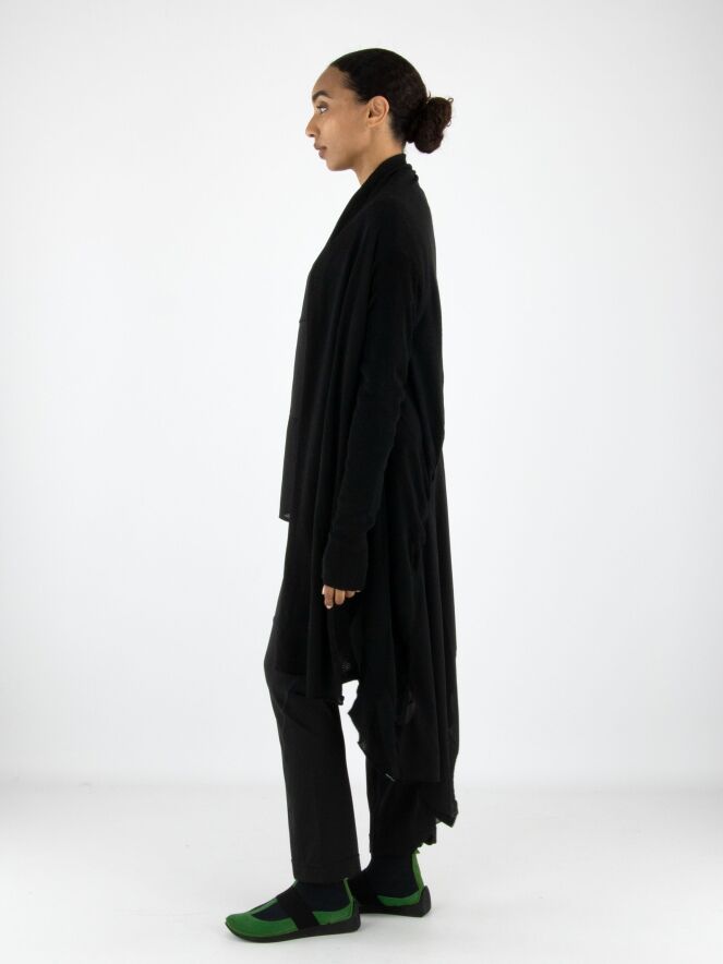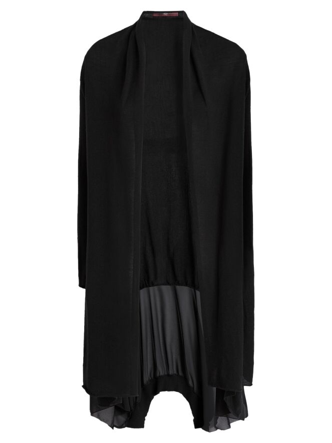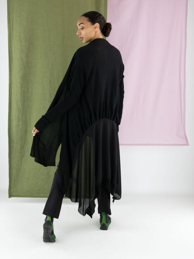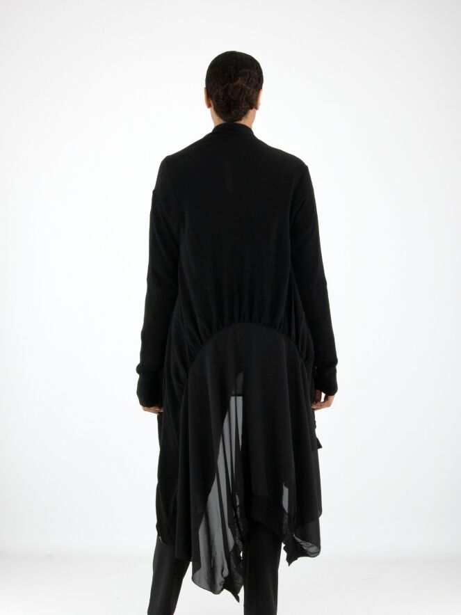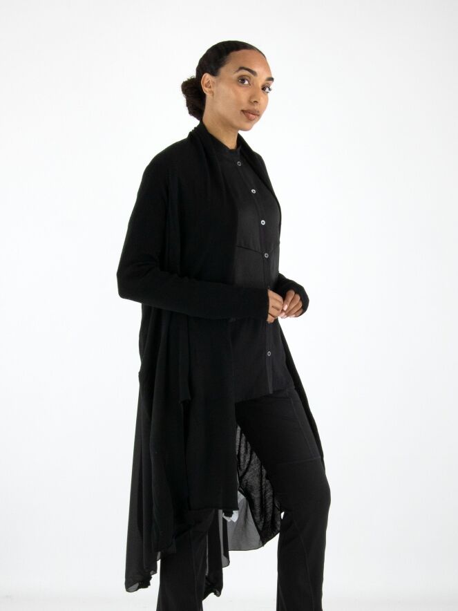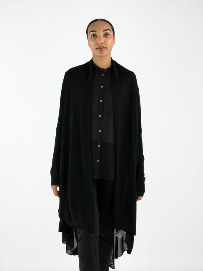 Langer, luxuriöser Cardigan von High in Schwarz. Die Strickjacke hat einen Schalkragen und keinen Verschluss. Auf der Rückseite befindet sich auf Taillenhöhe eine rund geschnittene Naht, unterhalb derer der Stoff transparent ist. Diese Strickjacke sollte von Hand gewaschen werden.