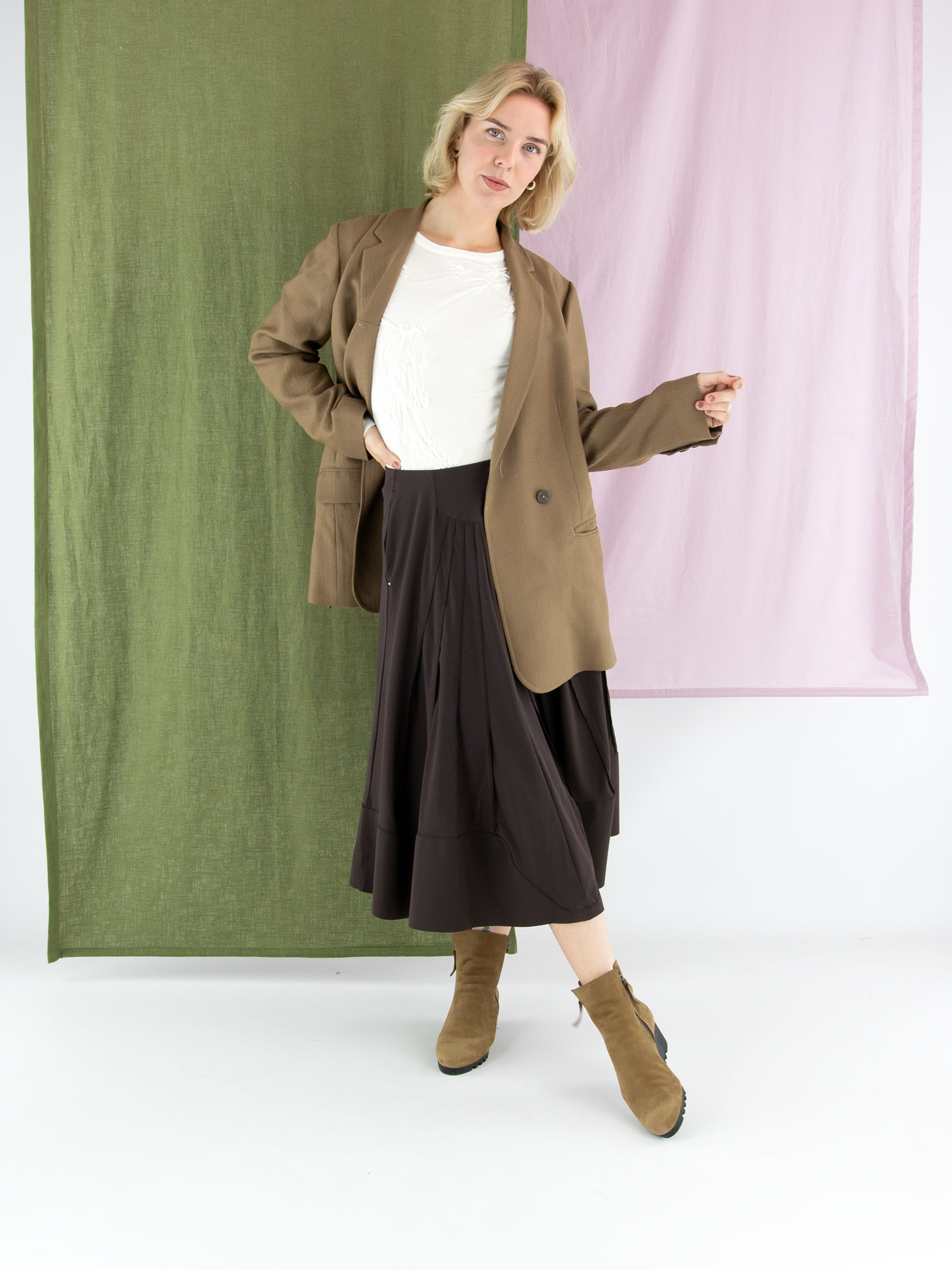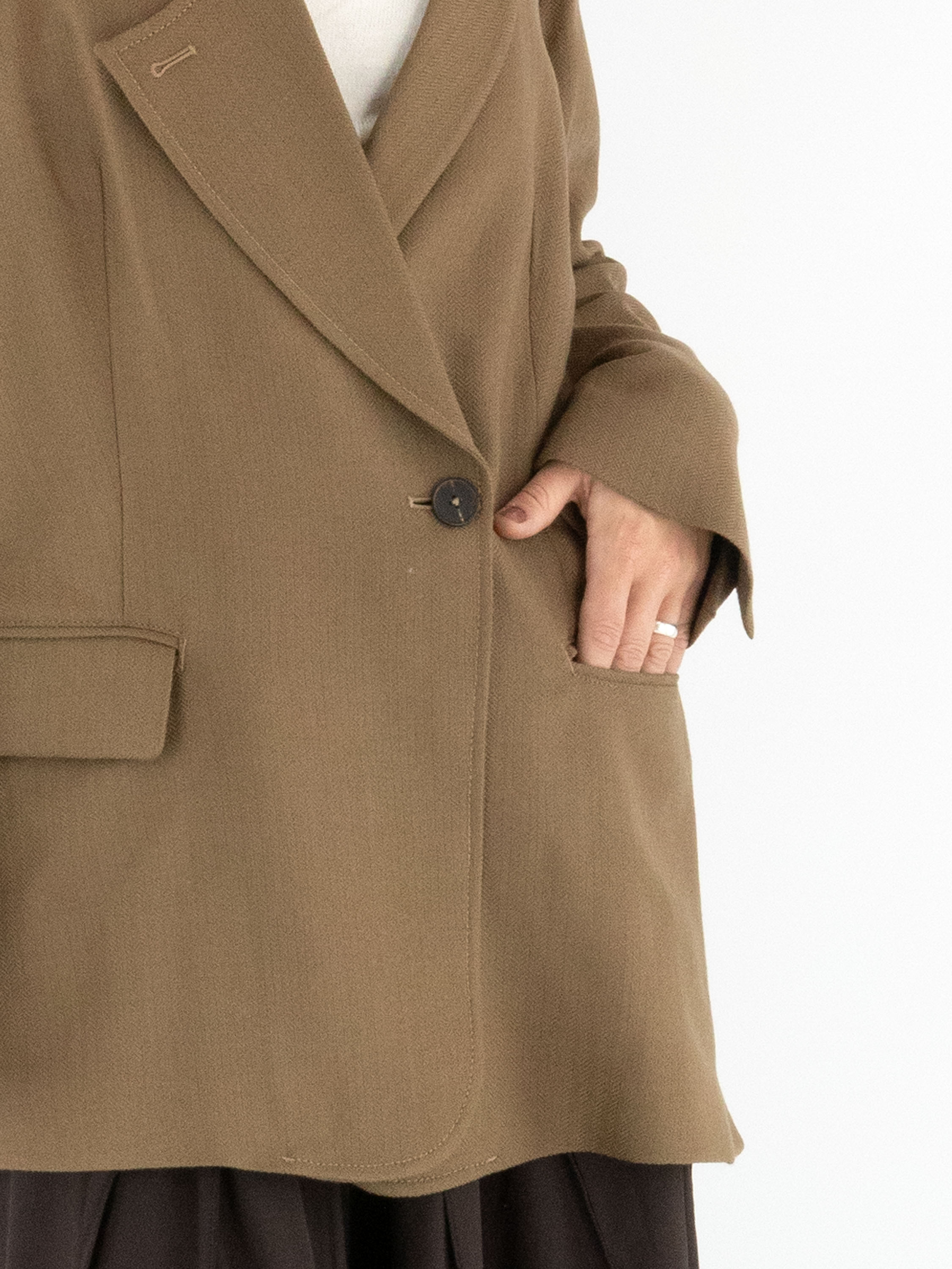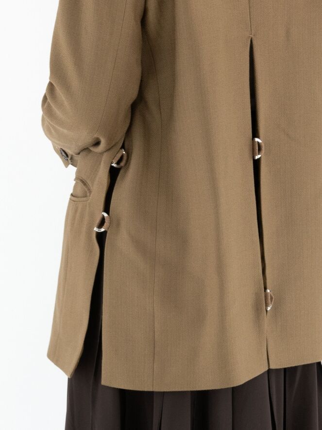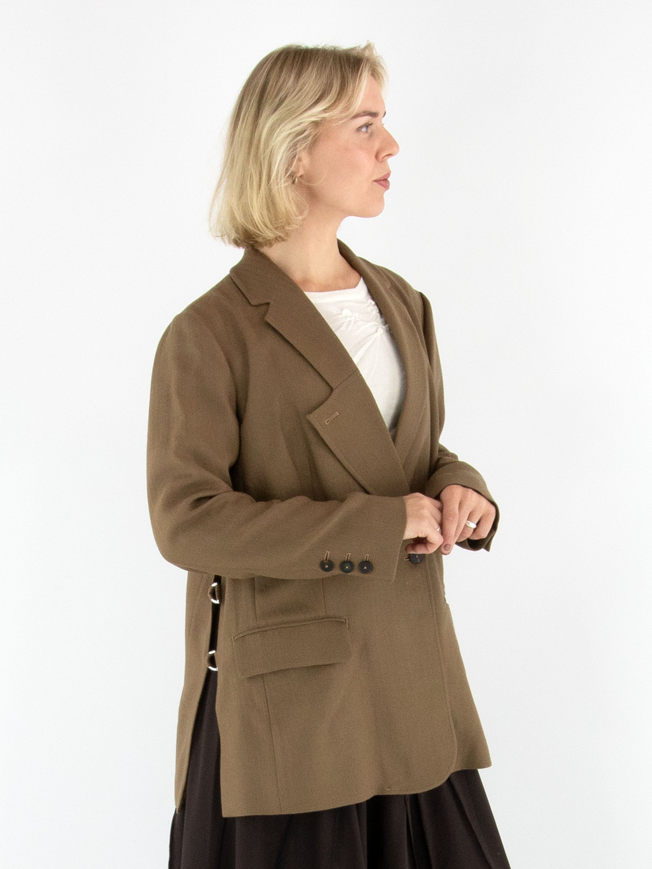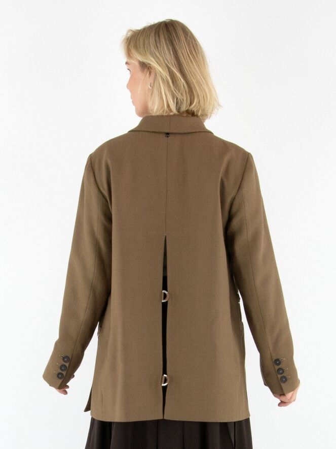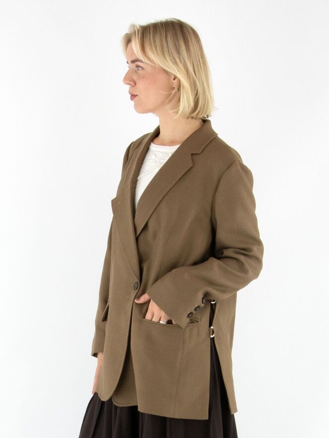Luxuriöser Blazer von High in einem fein melierten Braunton. Mit asymmetrischem Ein-Knopf-Verschluss gearbeitet, zeigt er tiefe Schlitze an den Seiten und in der hinteren Mitte. Silberfarbene Schnallen in Halbkreisform verbinden dort elegant die Stoffpartien. Der Blazer ist vollständig gefüttert und darf nicht gewaschen werden.