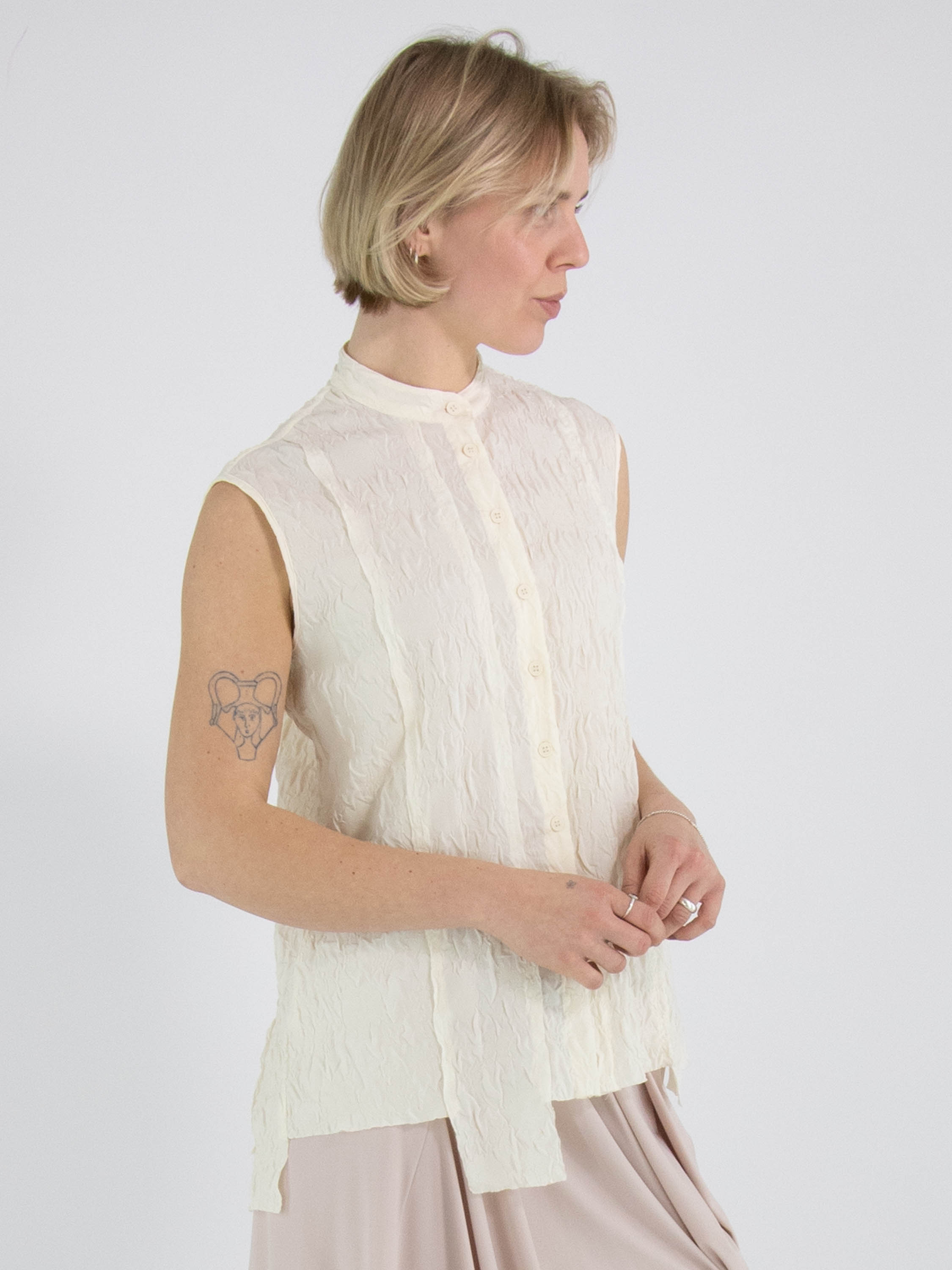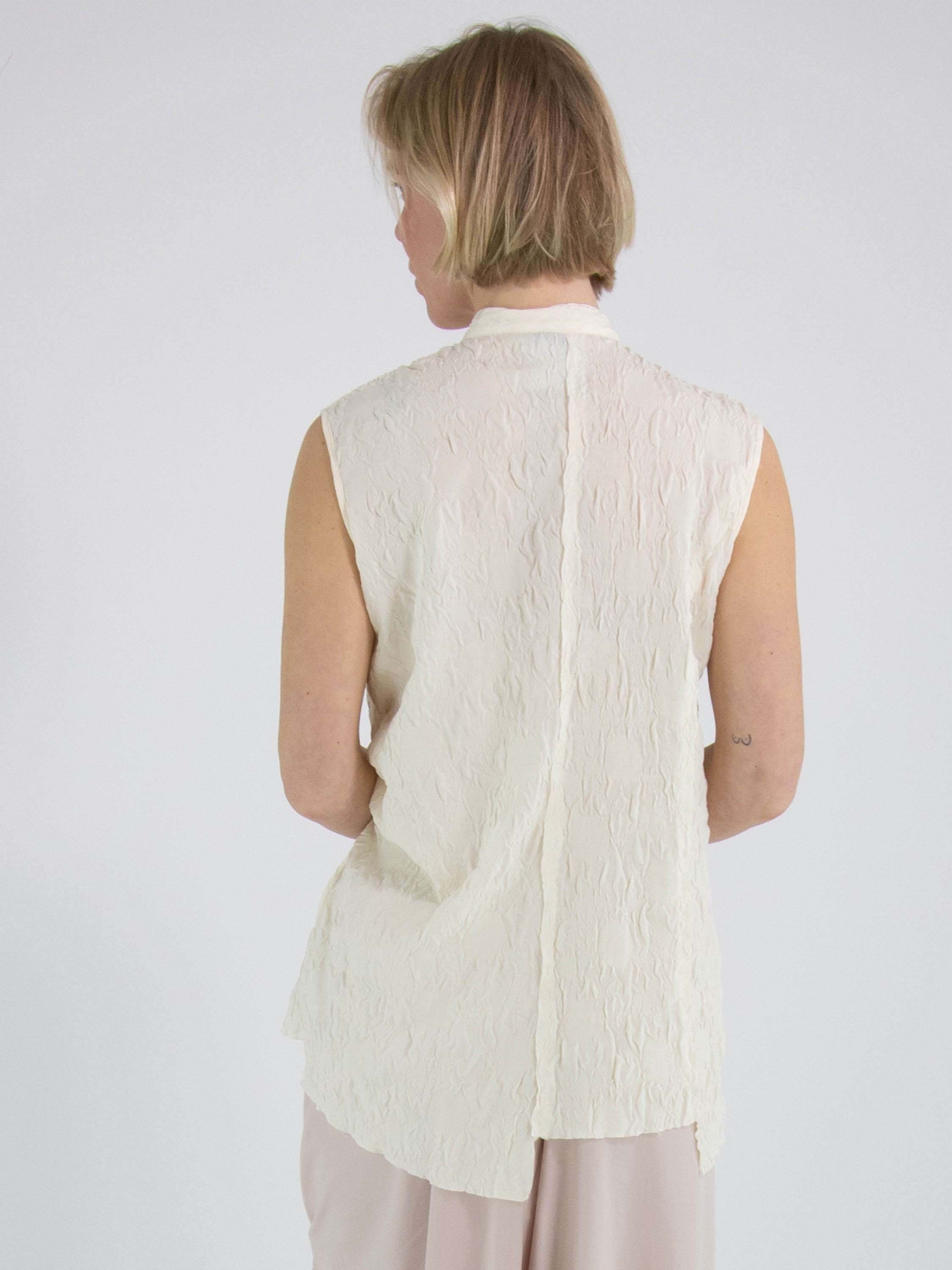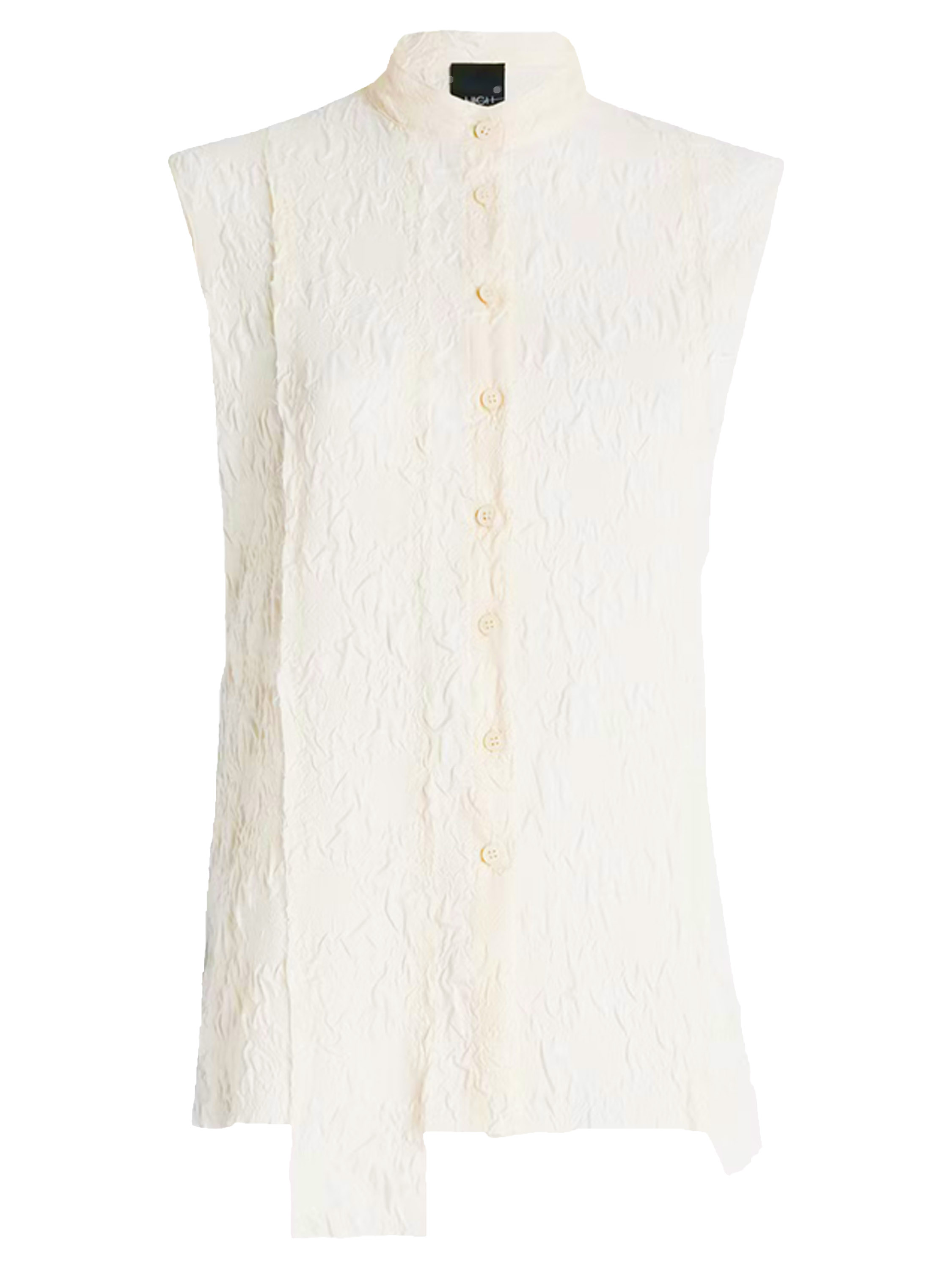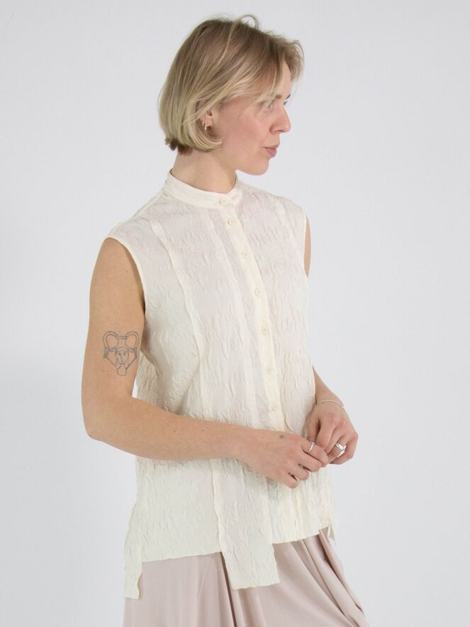 Eine gesmockte Weste von High Lab in Schwarz. Die Weste hat einen Knopfverschluss und in der hinteren Mitte eine umgekehrte Naht. Diese Weste kann per Hand gewaschen werden.