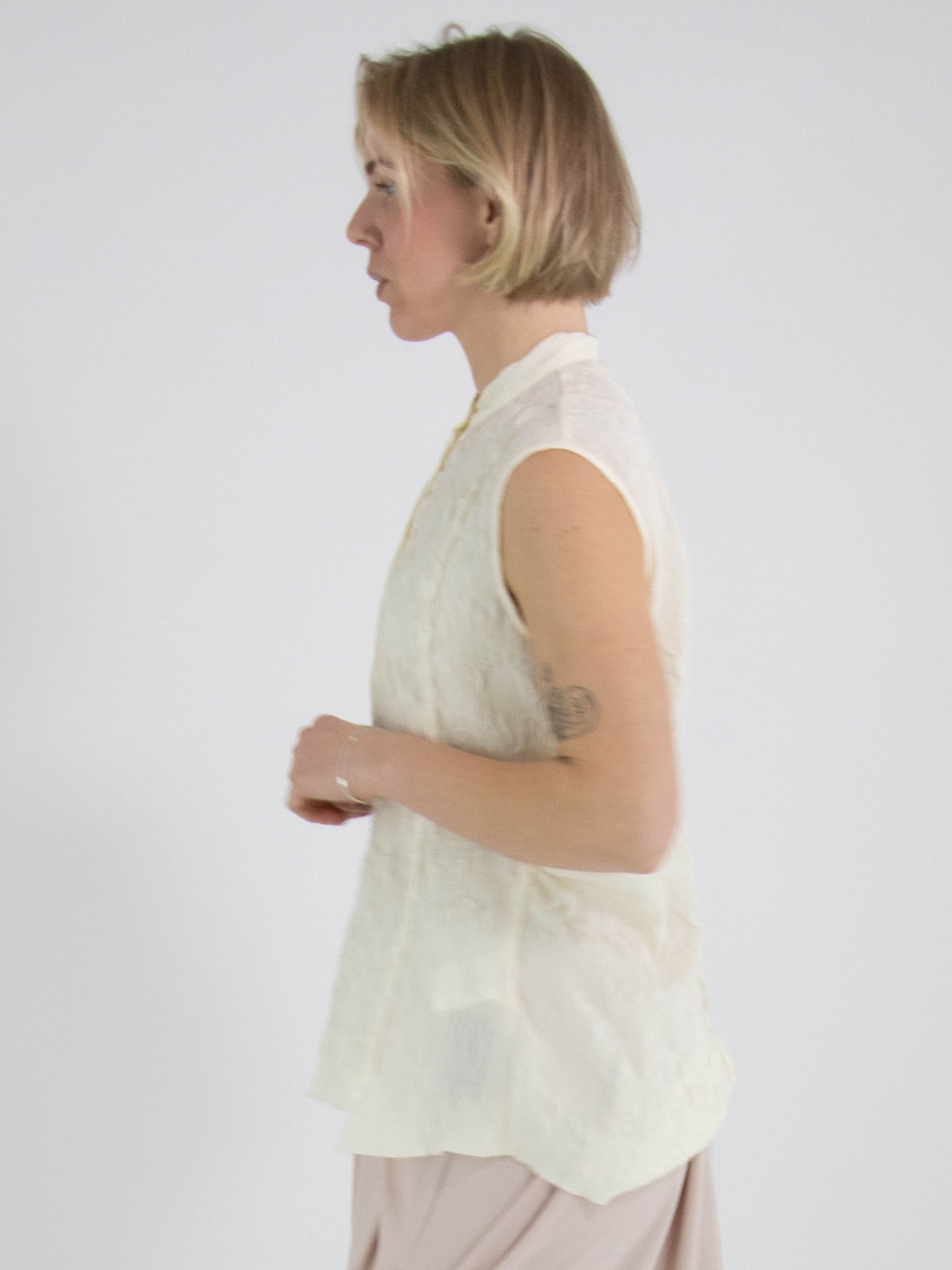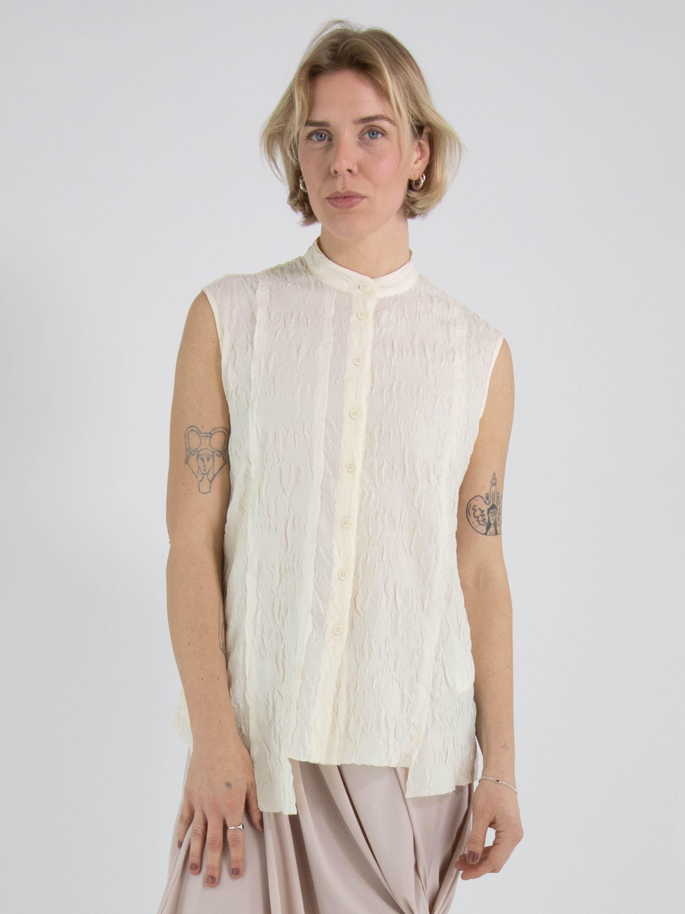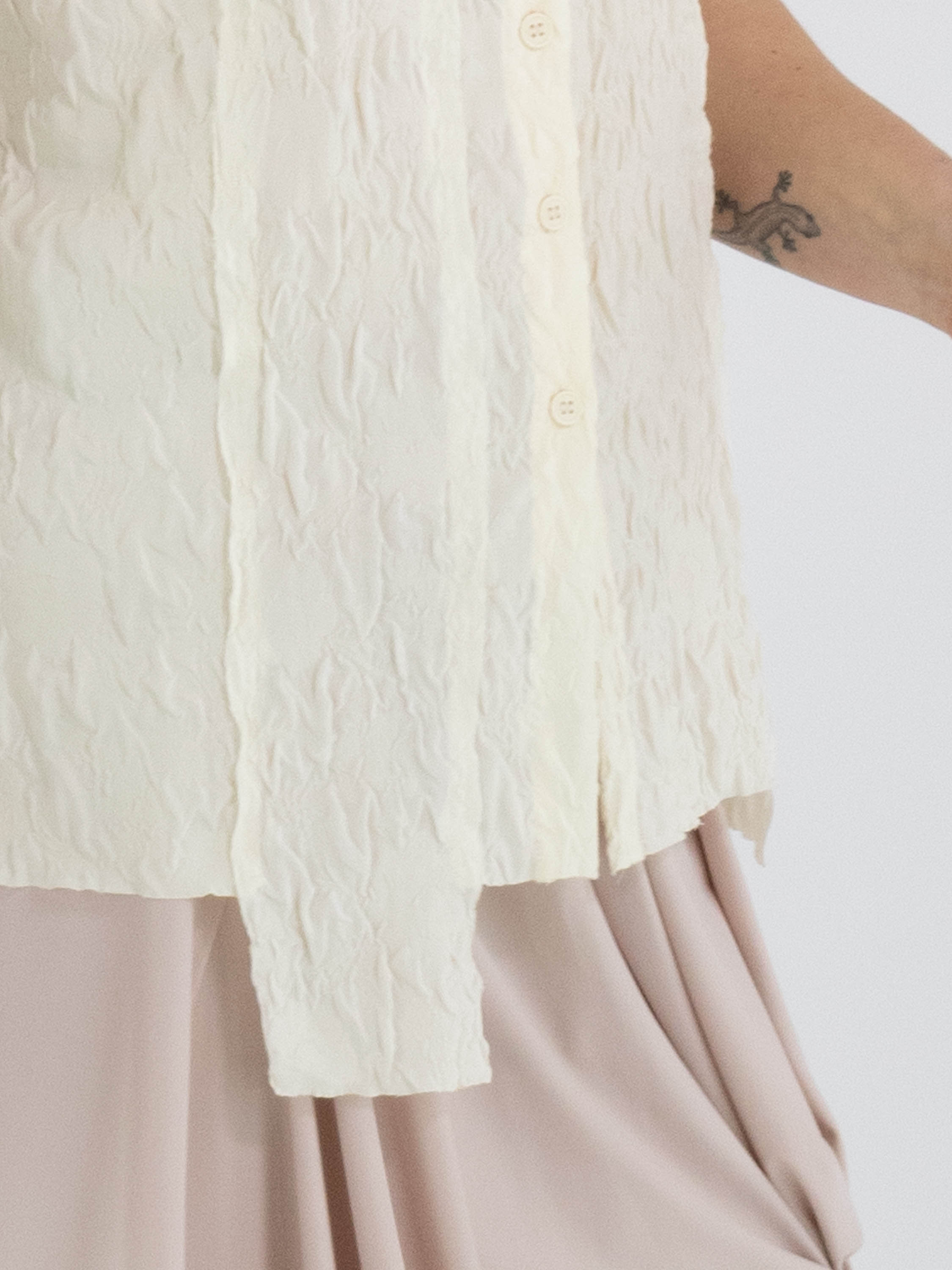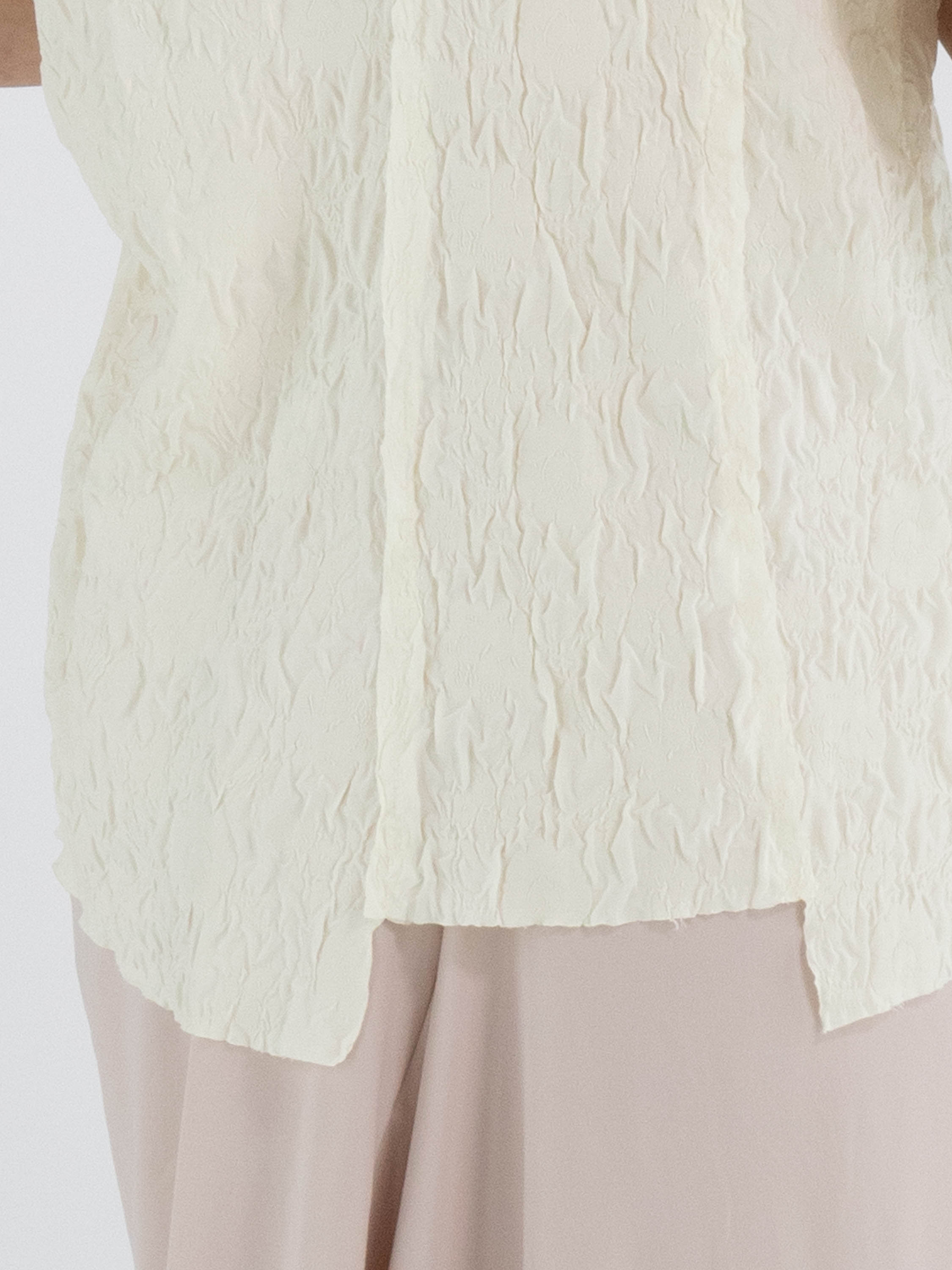 Eine gesmockte Weste von High Lab in Schwarz. Die Weste hat einen Knopfverschluss und in der hinteren Mitte eine umgekehrte Naht. Diese Weste kann per Hand gewaschen werden.