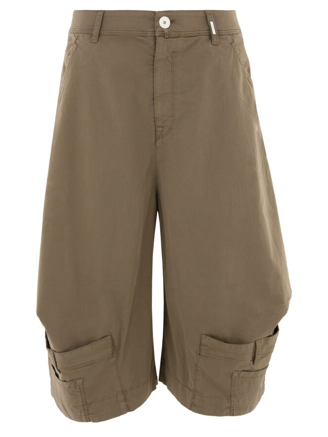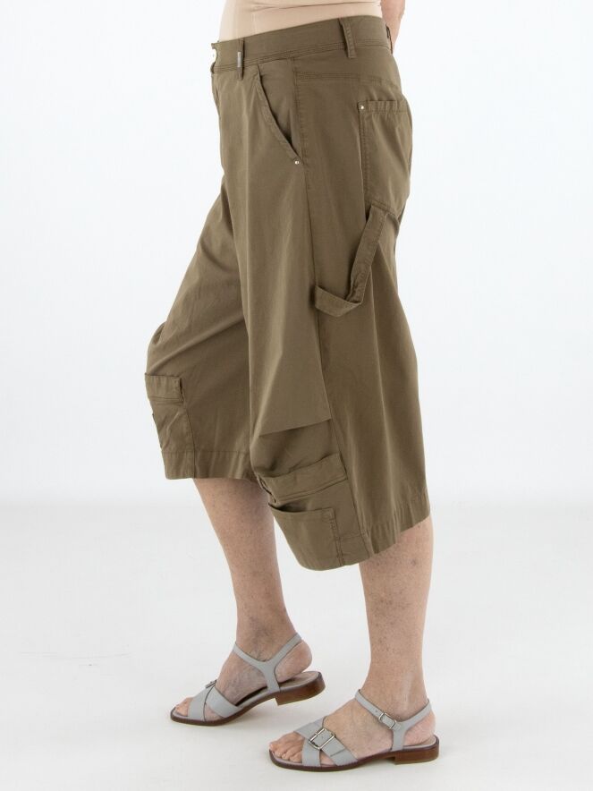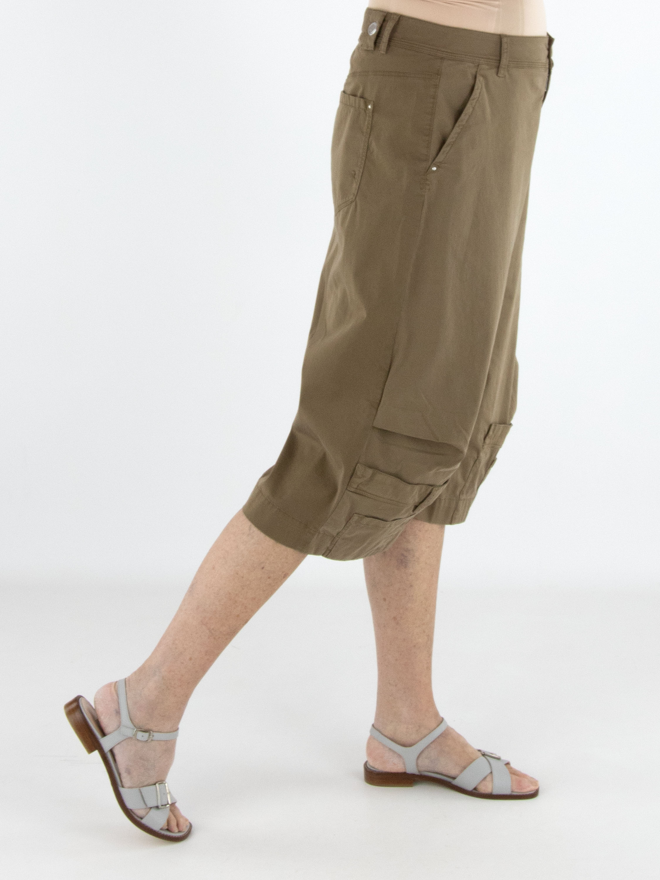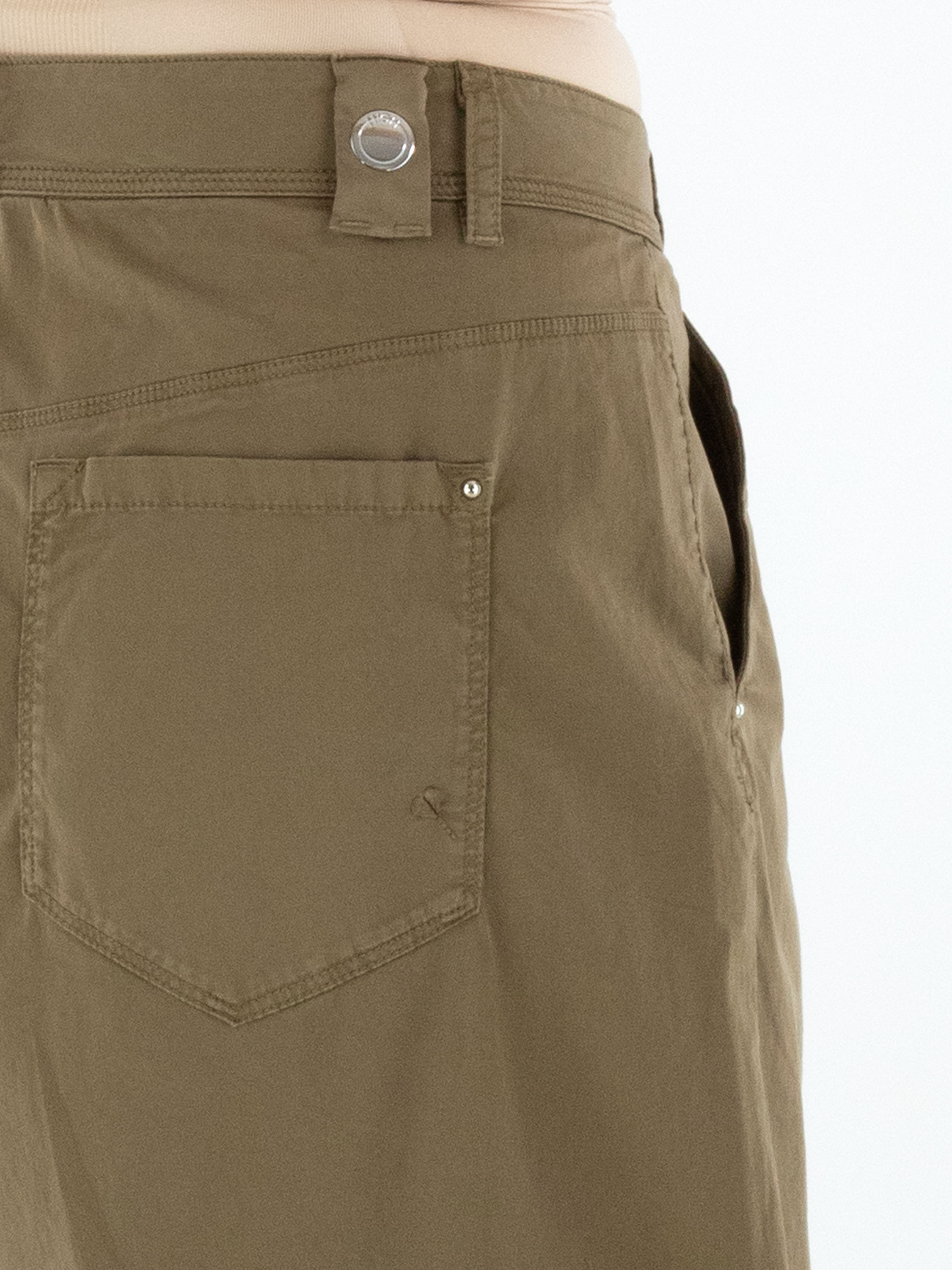 Caprihose von High in einem warmen Braunton. Am unteren Teil der Hosenbeine befindet sich ein besonderes Designdetail, das den Eindruck einer umgekehrten Hose mit Taschen vermittelt. Dieses raffinierte Element verleiht dem Modell eine moderne und überraschende Ausstrahlung. Diese Hose kann bei 30 Grad gewaschen werden.