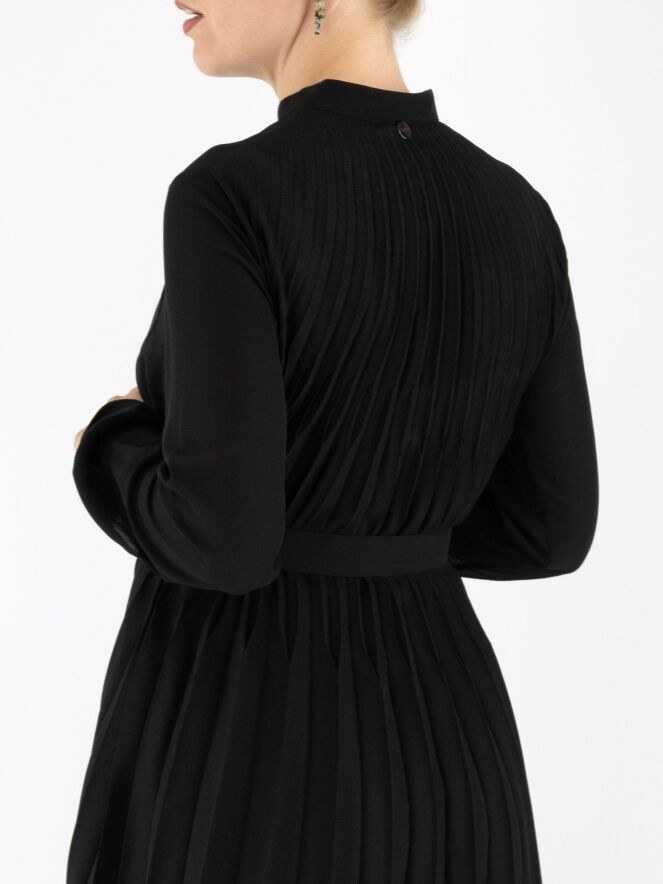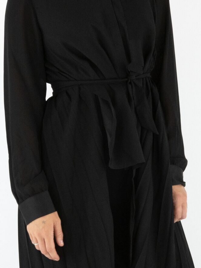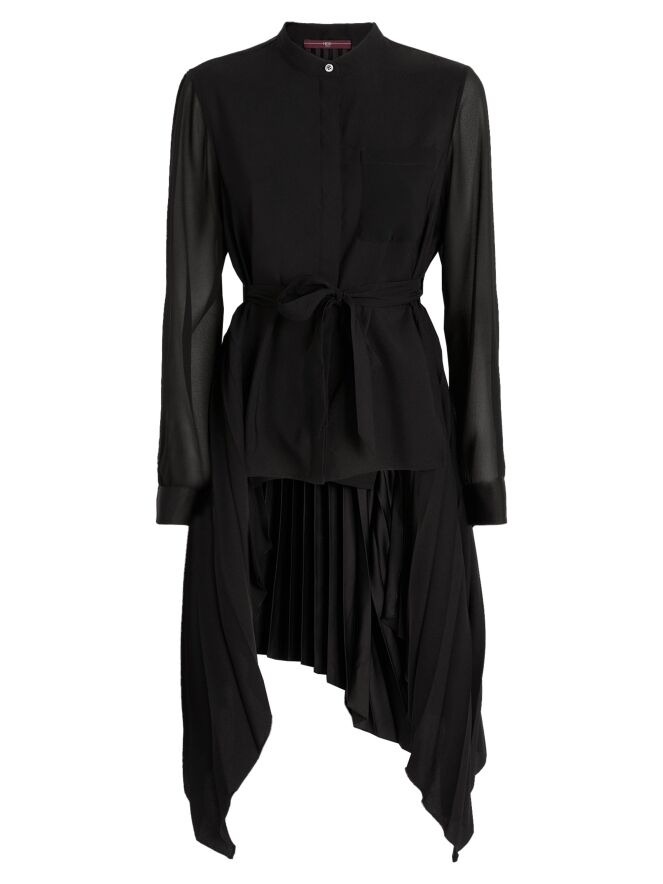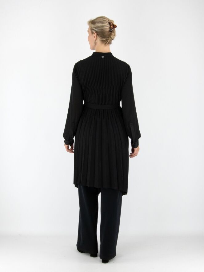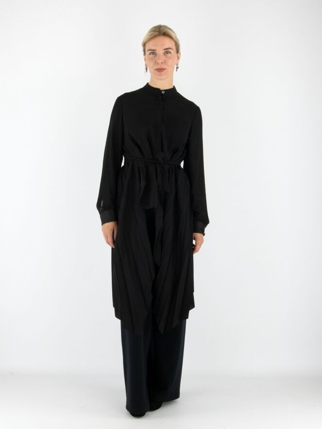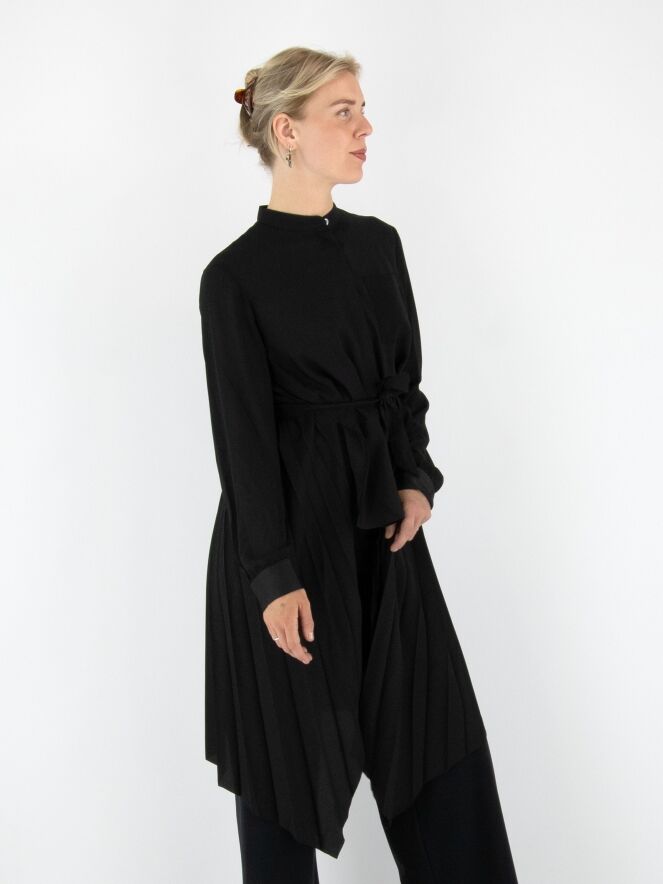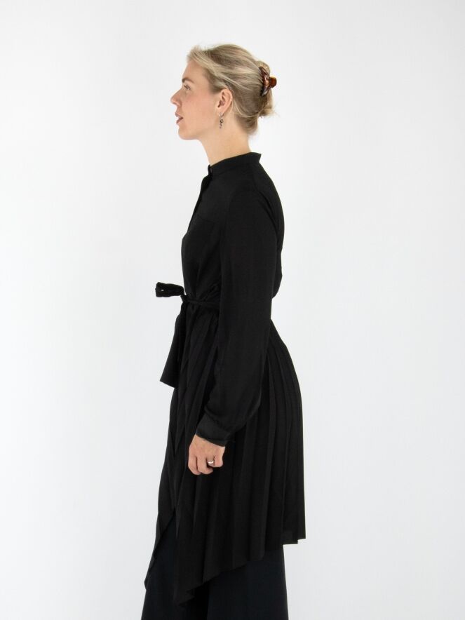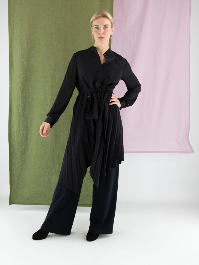 Bluse oder Tunika in Schwarz. Die Vorderseite ist aus einem einfarbigen Stoff mit verdeckter Knopfleiste gearbeitet. Auf der Rückseite fällt der Stoff ab dem Hals in feine Plissées. In der Taille befindet sich ein Gürtel aus dem gleichen Material. Diese Bluse sollte von Hand gewaschen werden.