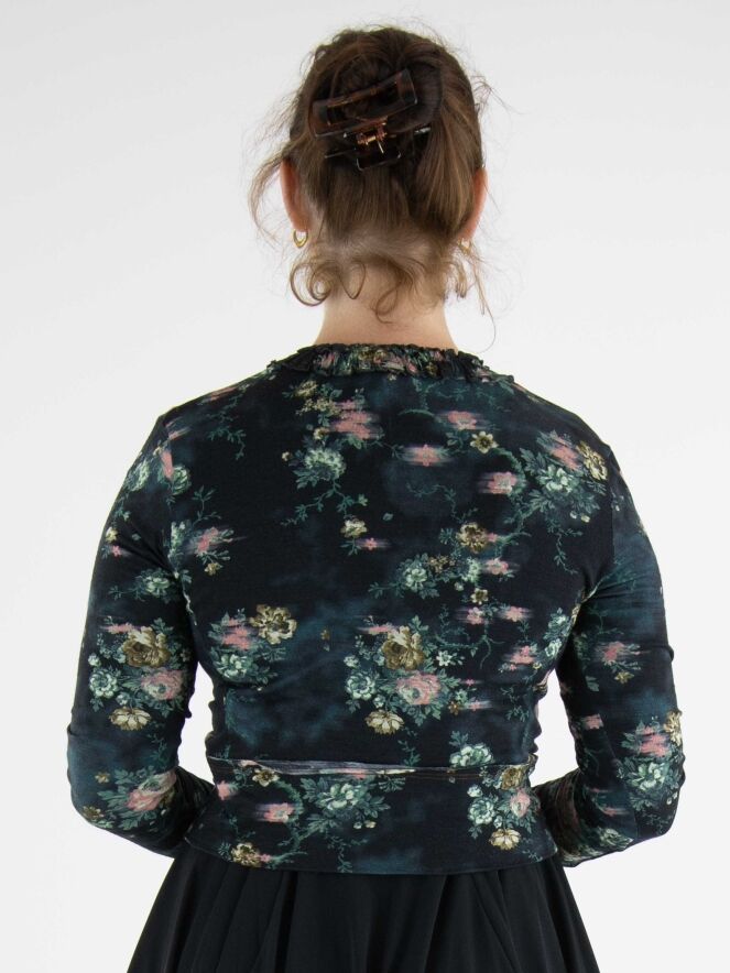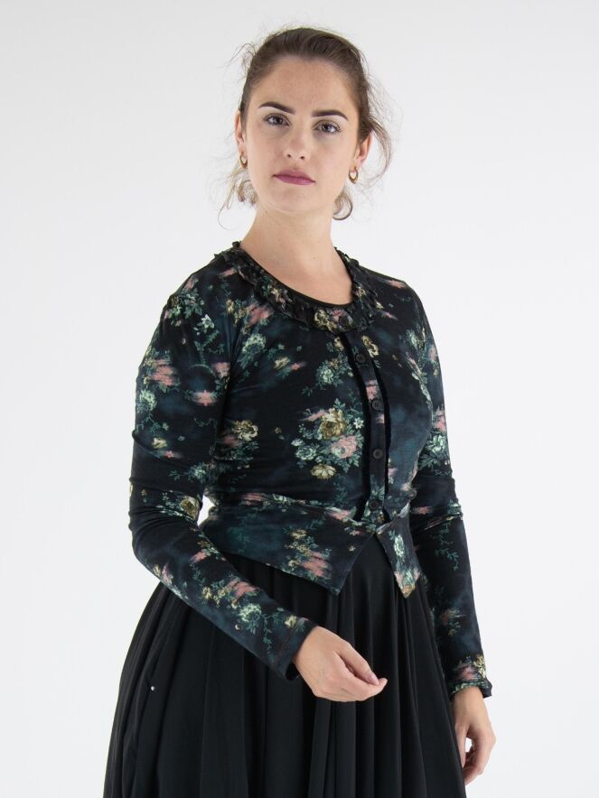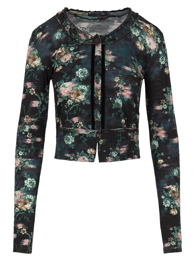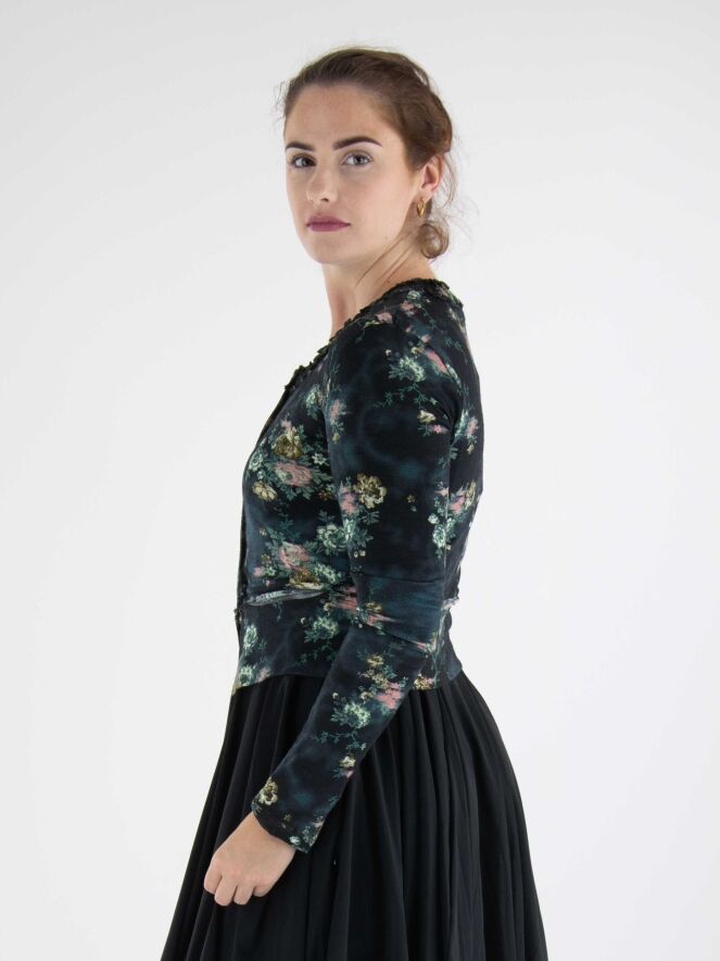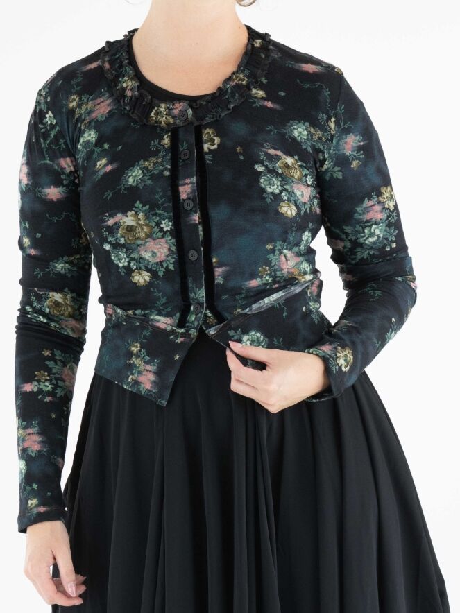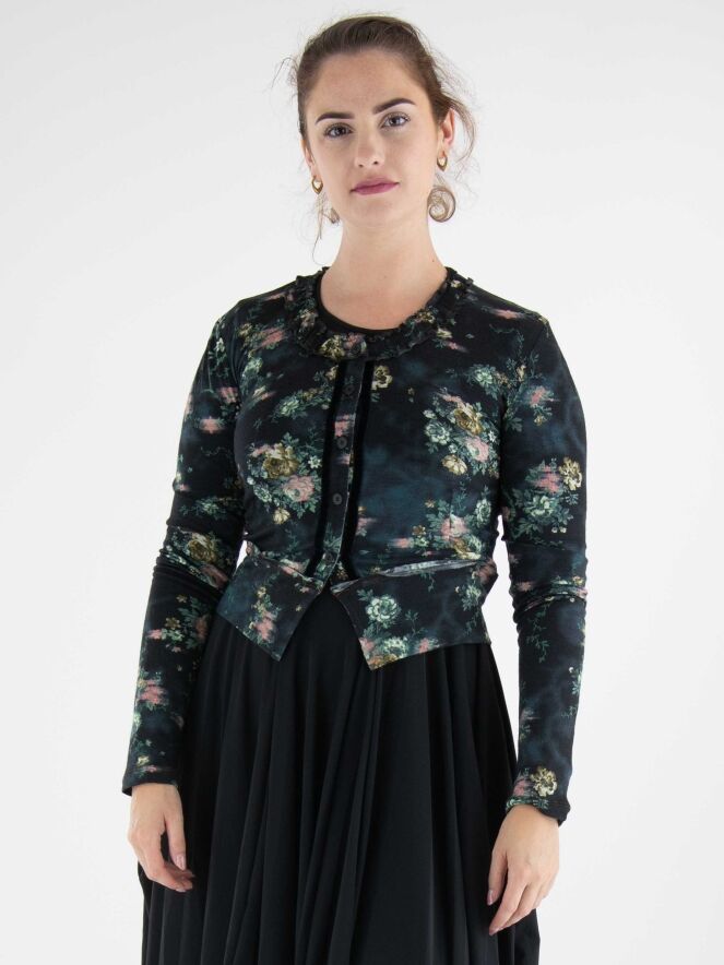 Ein kurzes Strickjäckchen von High in einem Blumenmuster mit mehreren Grüntönen, Taupe und Rot auf einem marineblauen Hintergrund. Entlang des runden Halsausschnitts befindet sich eine Borte, bei der der Stoff an beiden Rändern fein gefaltet ist. Entlang der Knopfleiste befindet sich beidseitig eine Samtborte. Dieses Jäckchen kann von Hand gewaschen werden.
