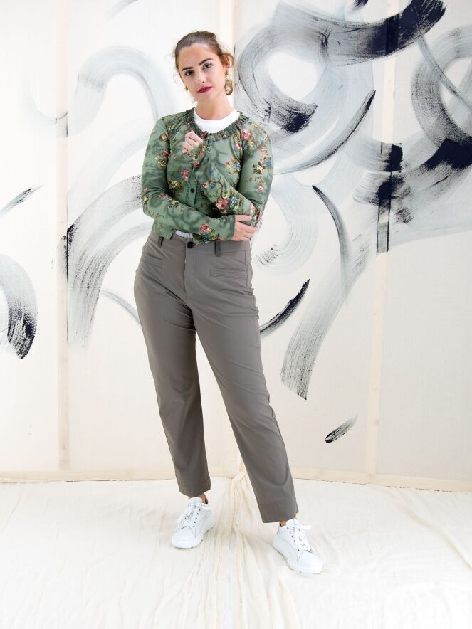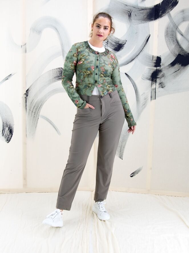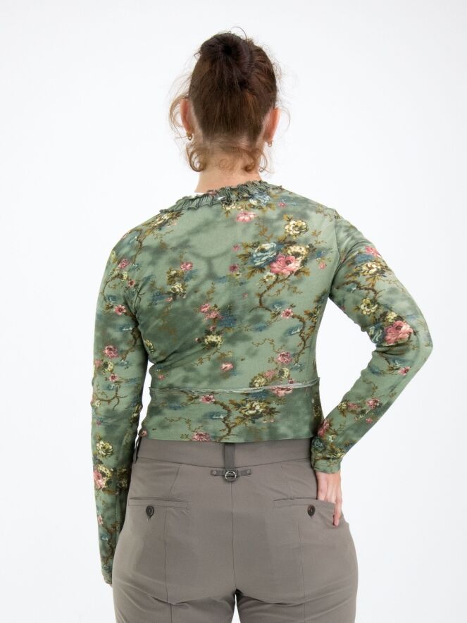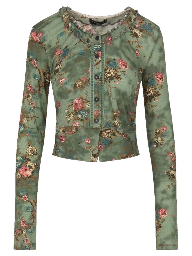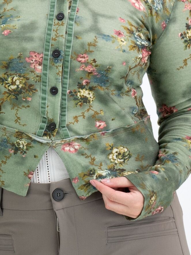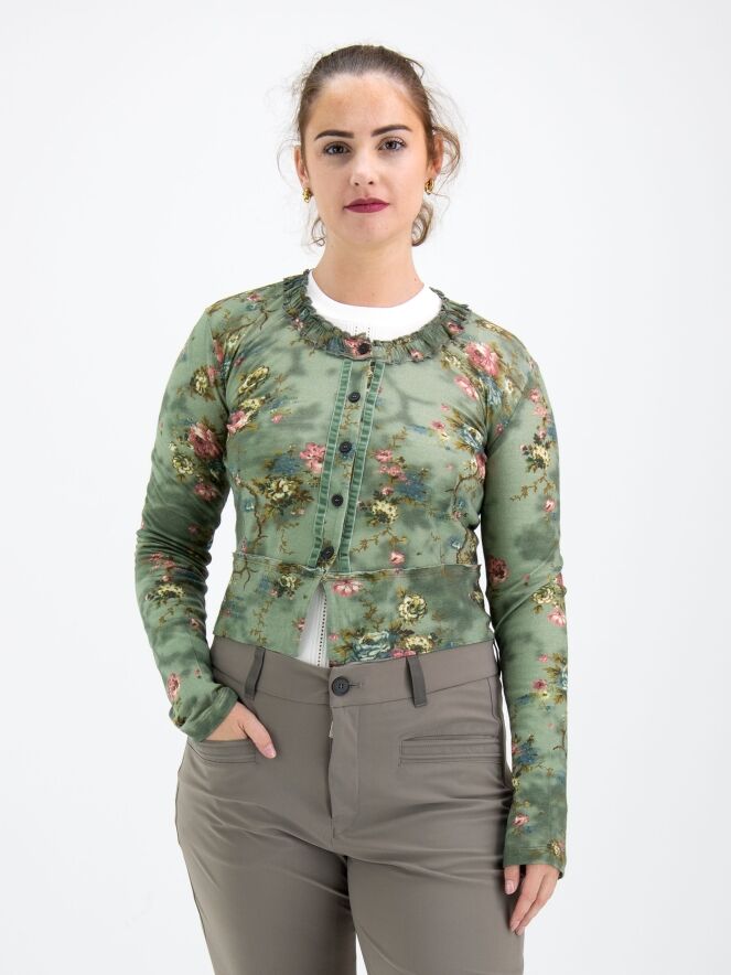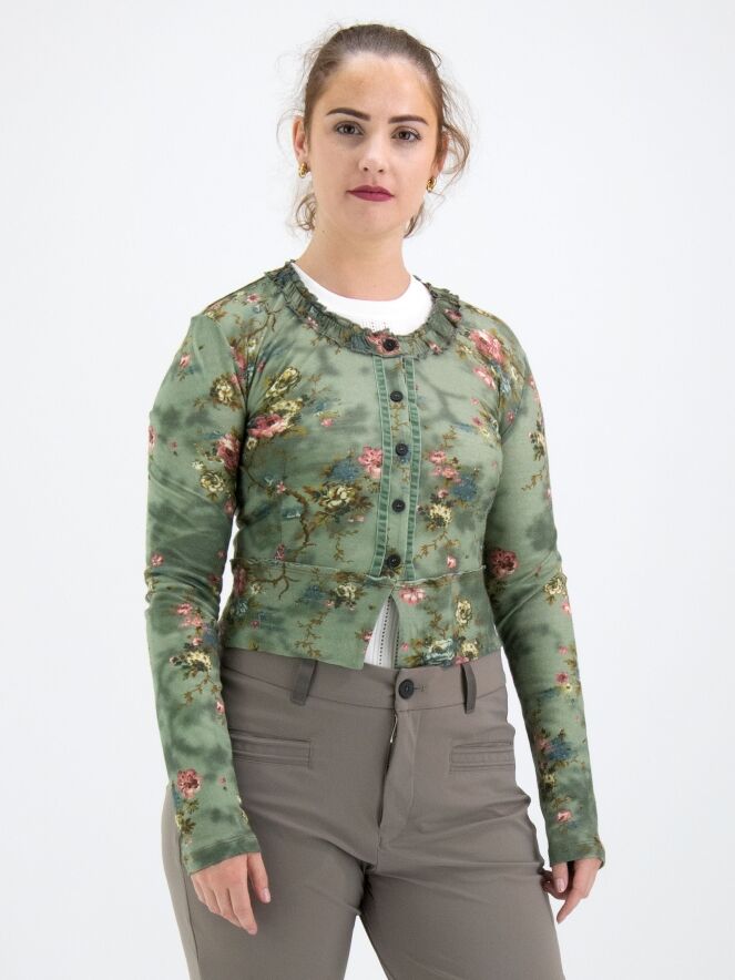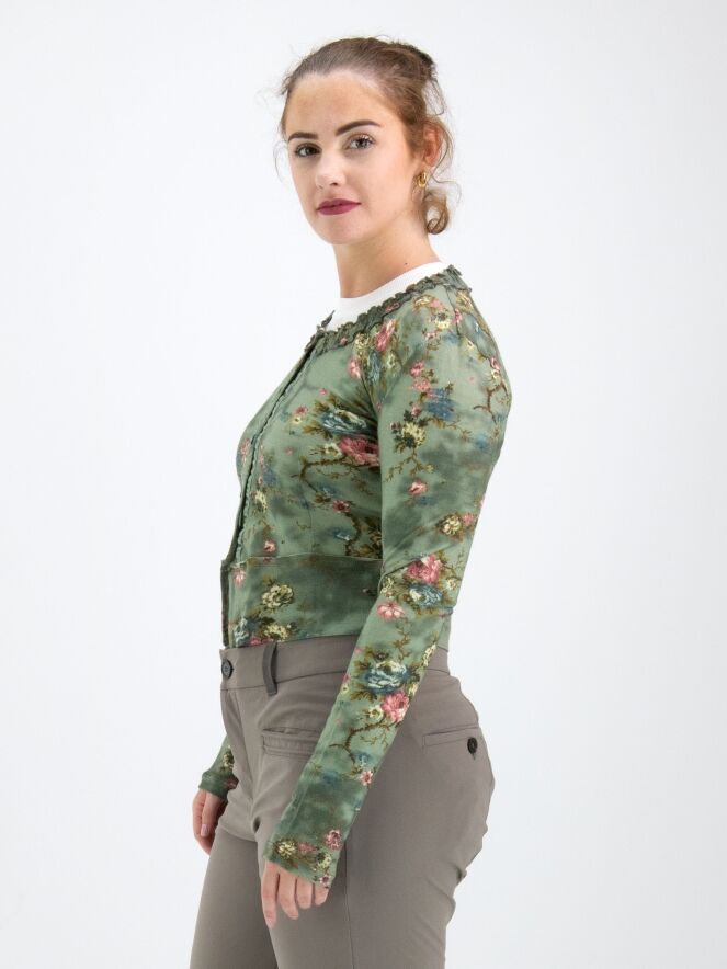 Ein kurzes Strickjäckchen von High mit einem Blumenmuster in mehreren Blautönen, Taupe und Rot auf einem olivgrünen Hintergrund. Entlang des runden Halsausschnitts befindet sich eine Borte, an deren beiden Rändern der Stoff fein gefaltet ist. Entlang der Knopfleiste befindet sich beidseitig eine Samtborte. Dieses Jäckchen kann von Hand gewaschen werden.