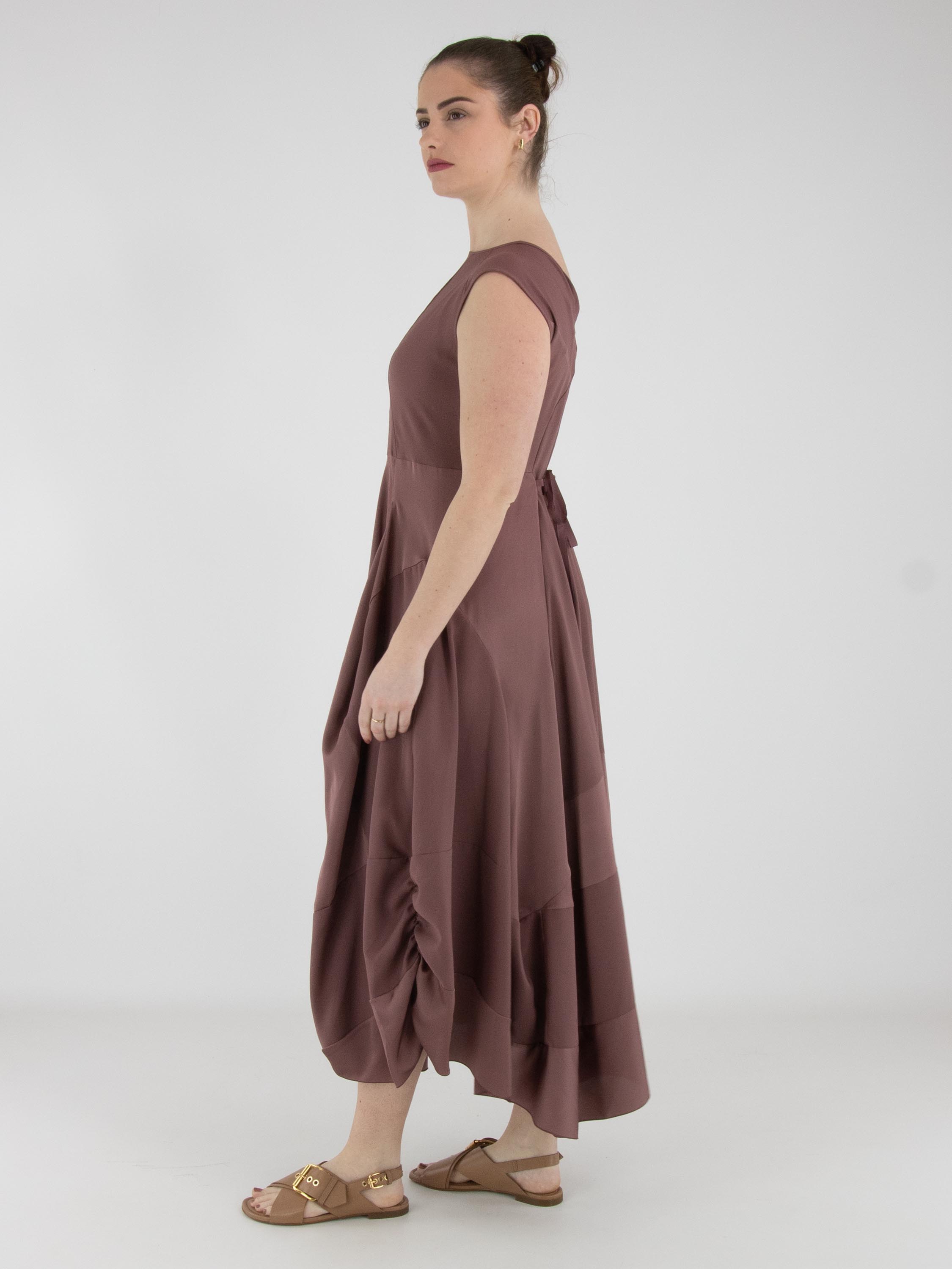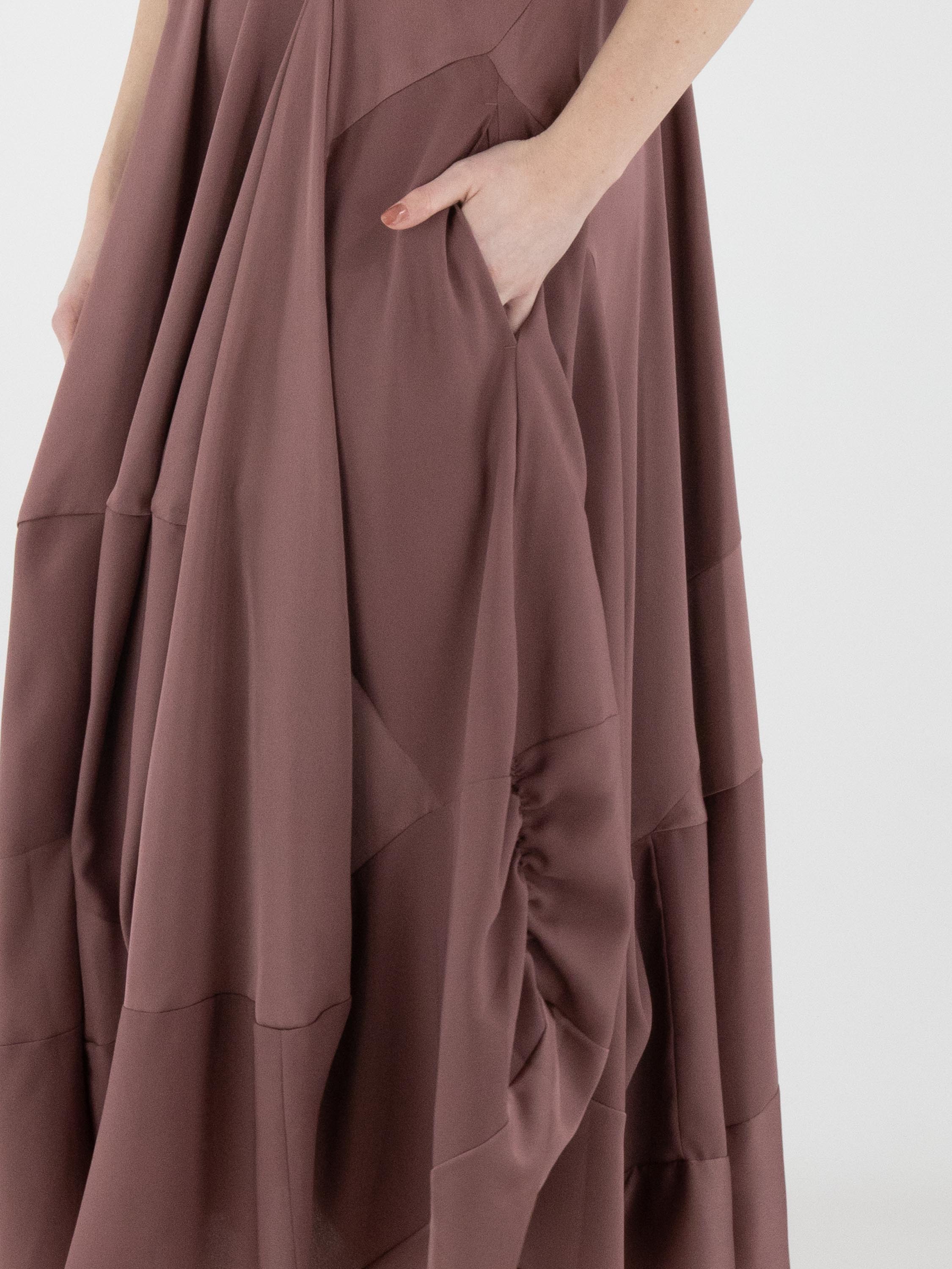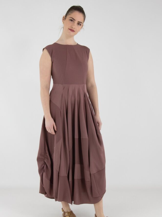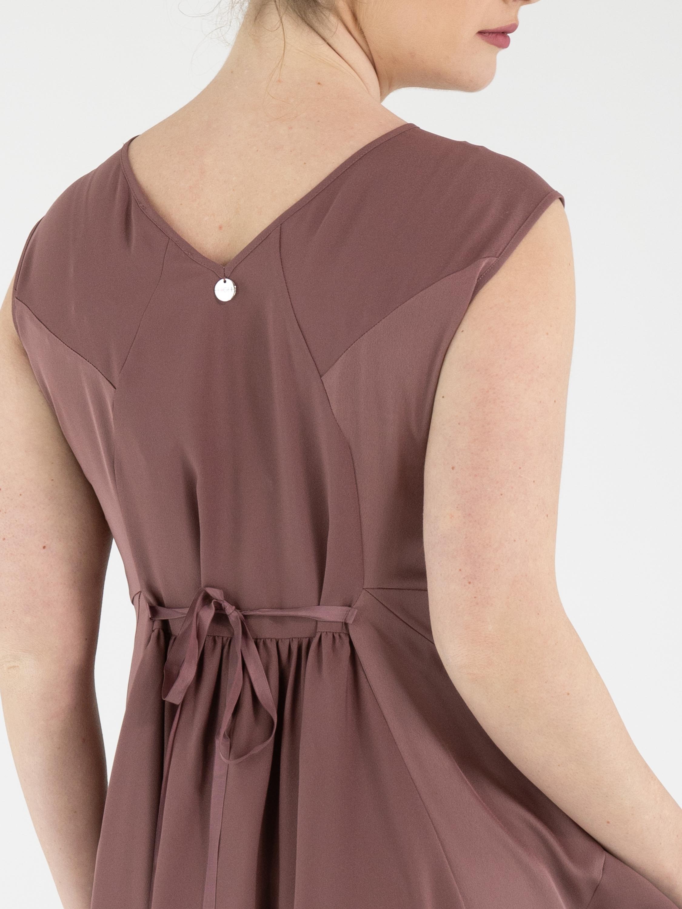 Ein Kleid von High in Mauve. Das Kleid ist teilweise aus matten Satinflächen und teilweise aus mattem Stoff gefertigt. Ab der Taille verläuft das Kleid weit in A-Linie. Auf Taillenhöhe sind Seitentaschen eingearbeitet. Dieses Kleid kann von Hand gewaschen werden.