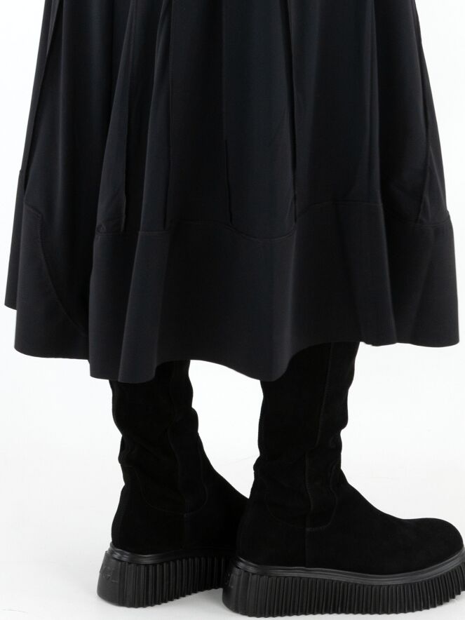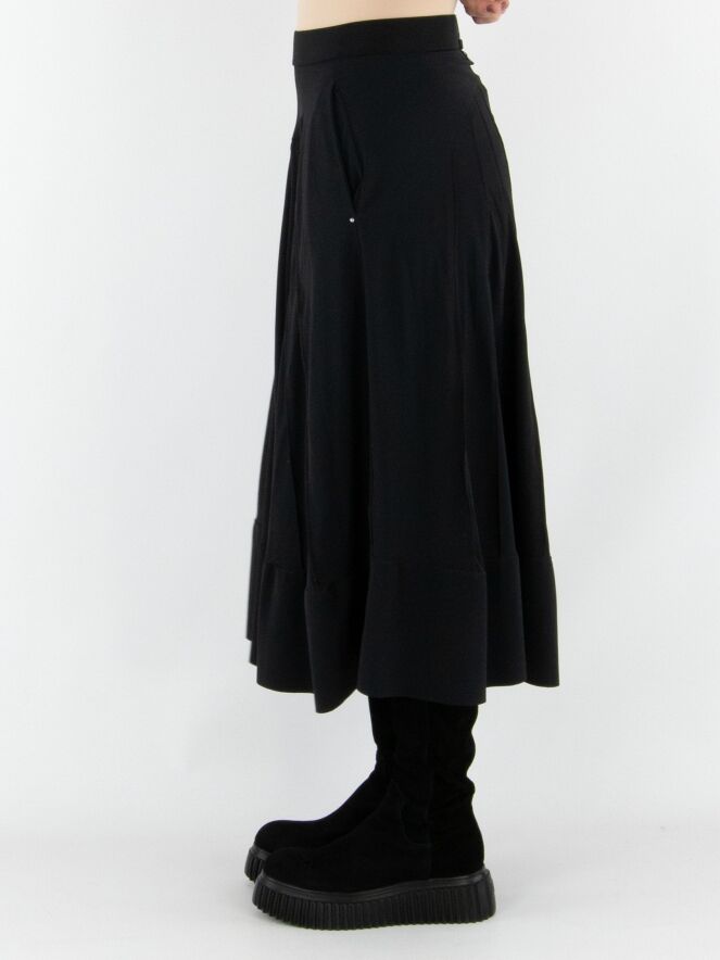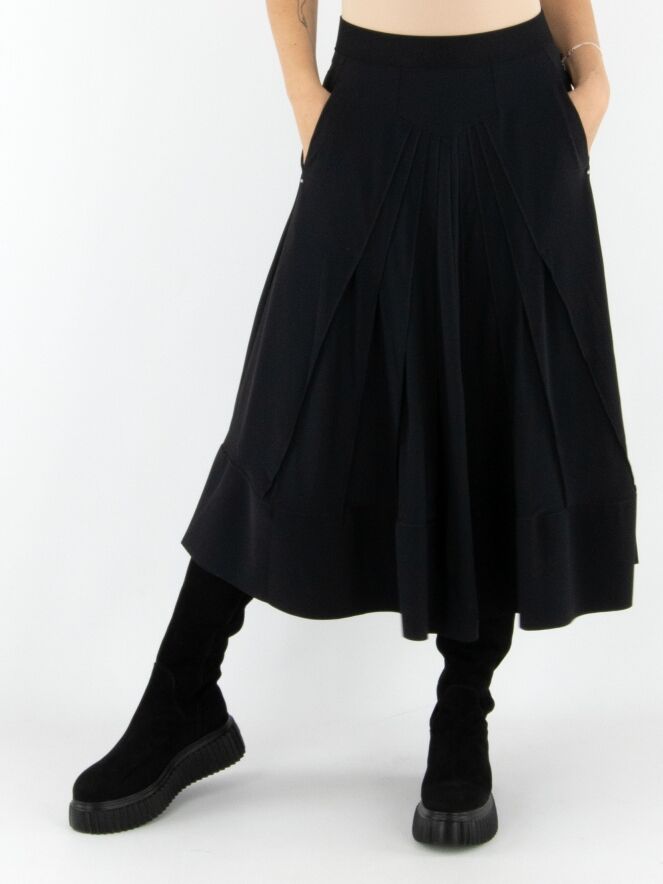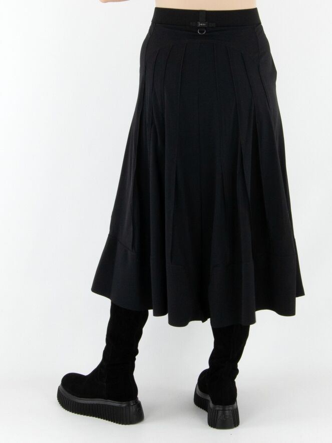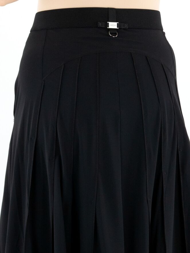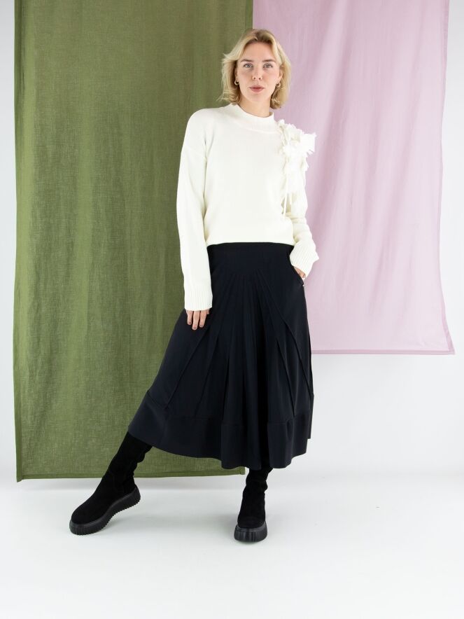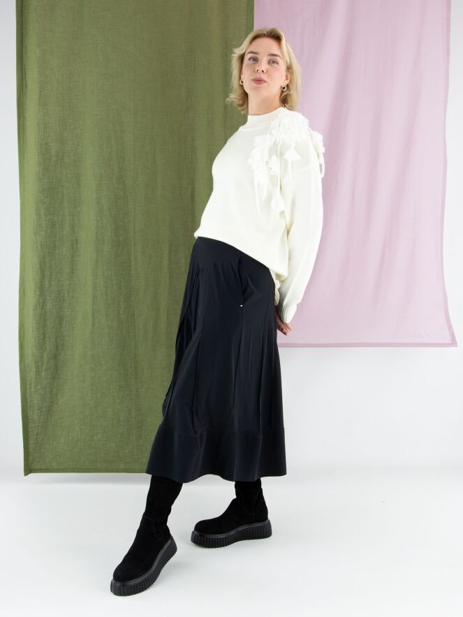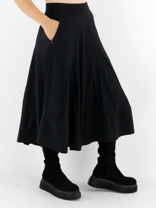 Ein weiter, langer Rock von High in Schwarz. In der Taille befindet sich ein bequemes elastisches Bündchen. Unterhalb des Taillenbundes verlaufen vorne und hinten mehrere umgekehrte vertikale Nähte, die dem Rock eine verspielte und moderne Note verleihen. Der Rock ist mit praktischen Eingrifftaschen ausgestattet und kann per Hand gewaschen werden.