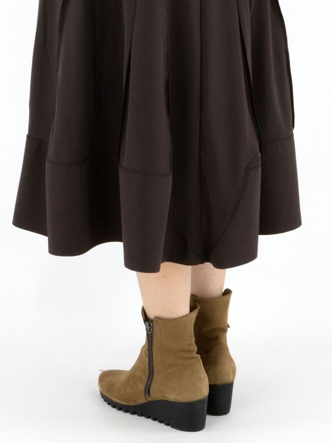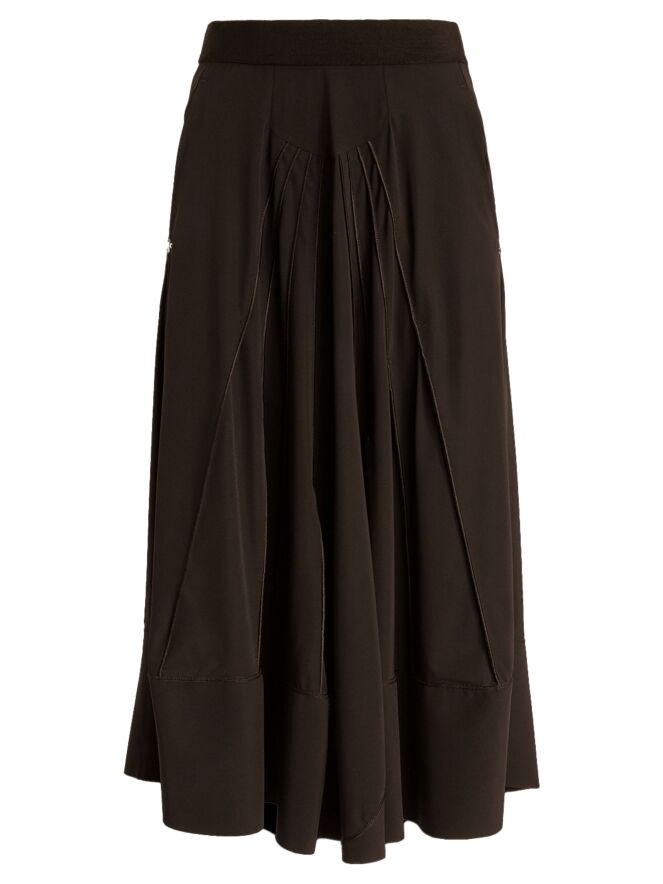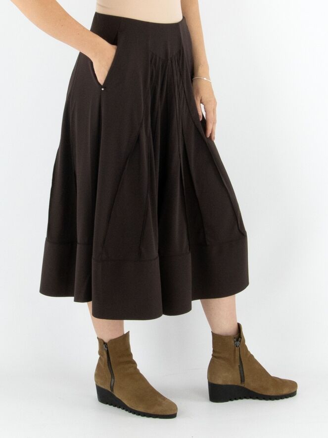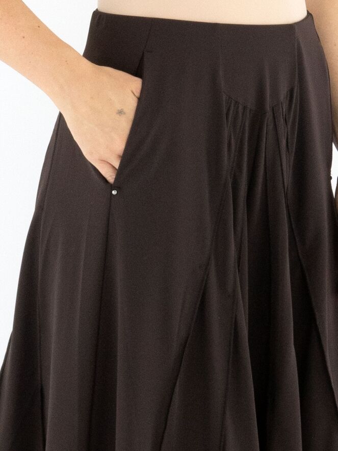 Ein weiter, langer Rock von High in einem tiefen Aubergineton. In der Taille befindet sich ein bequemes elastisches Bündchen. Unterhalb des Bundes verlaufen vorne und hinten mehrere umgekehrte vertikale Nähte, die dem Rock spielvolles Volumen und eine raffinierte Note verleihen. Der Rock ist mit Eingrifftaschen ausgestattet und kann per Hand gewaschen werden.