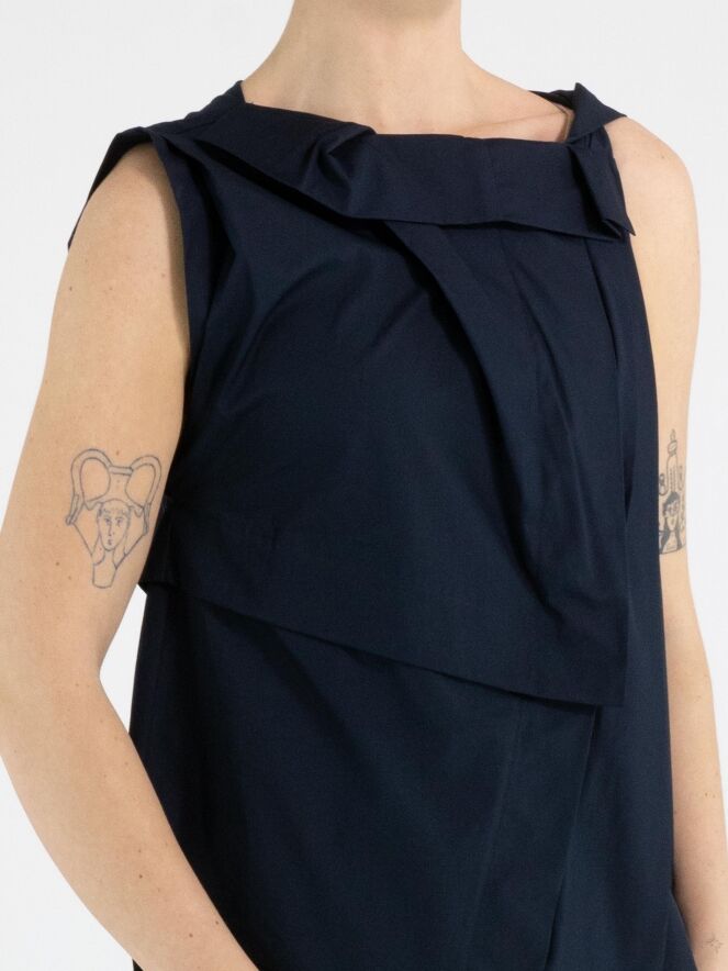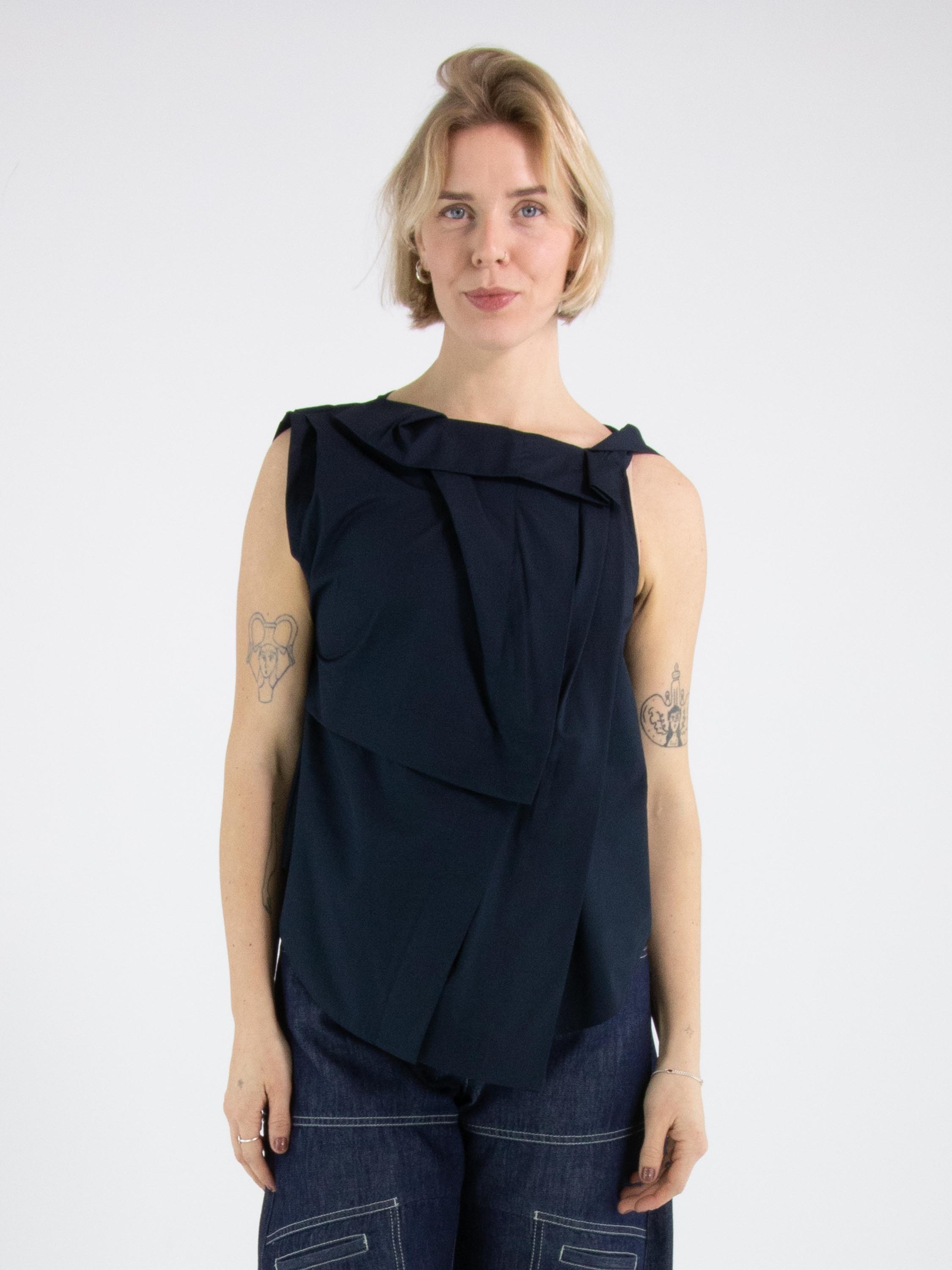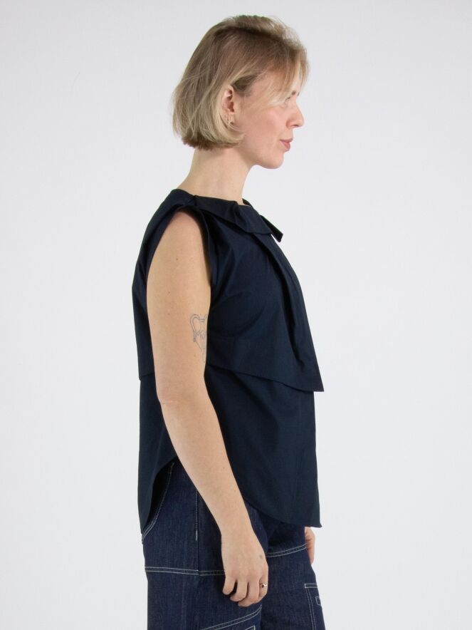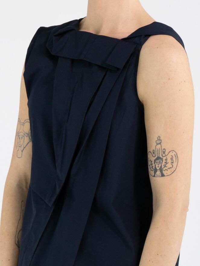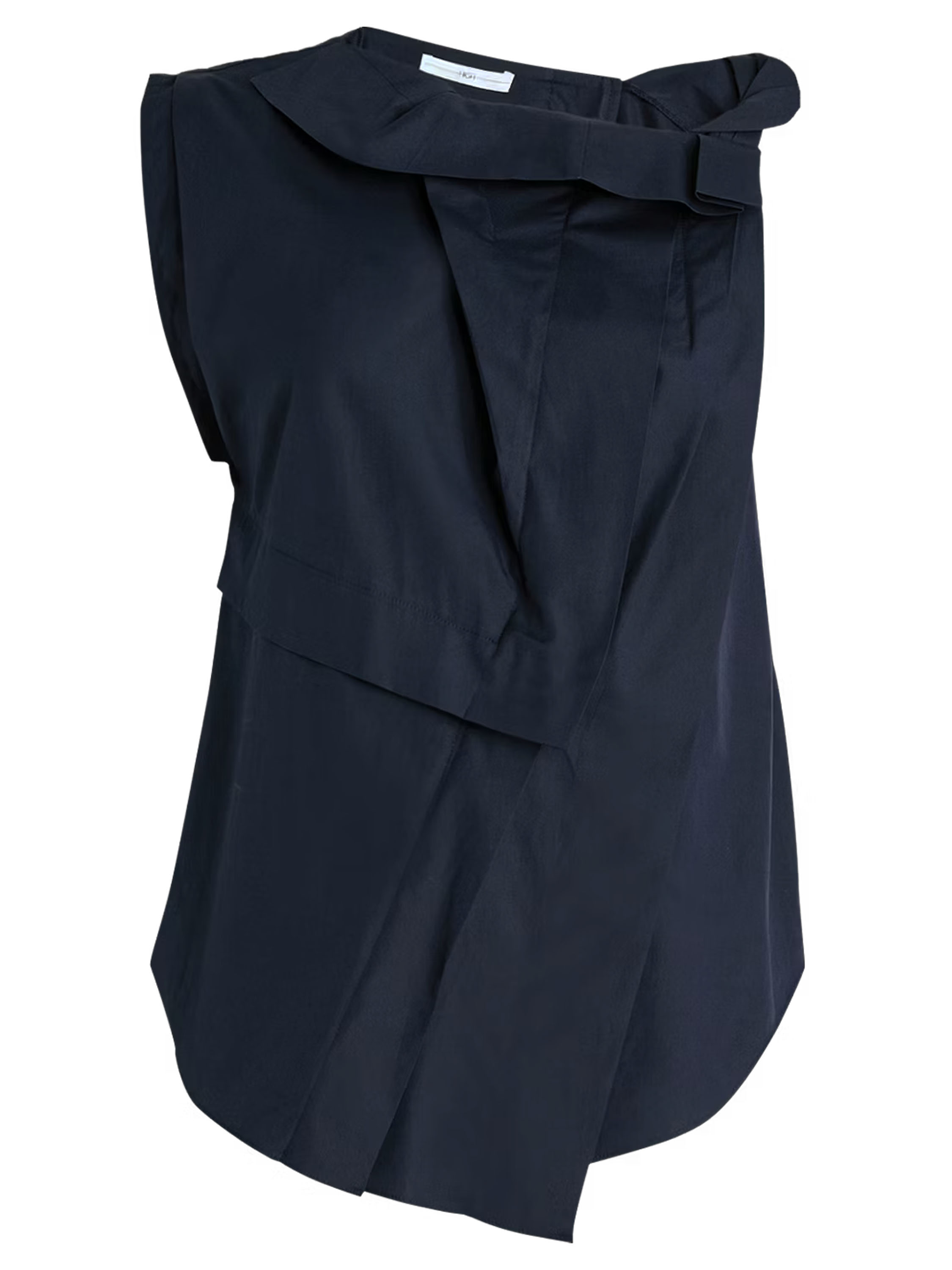 Ein Top von High in Marineblau. Das Top weist mehrere Plisseefalten auf, unter anderem an der Schulter und an der Vorderseite des Halsausschnitts. Von der linken Schulter verlaufen einige Falten diagonal zur Mitte des unteren Saums. Das Top hat eine A-Linie und kann per Hand gewaschen werden.