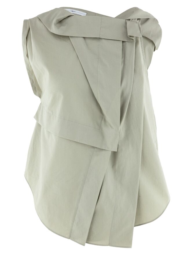 Ein Top von High in einem sanften Olivgrün. Das Top weist mehrere Plisseefalten auf, unter anderem an der Schulter und an der Vorderseite des Halsausschnitts. Von der linken Schulter verlaufen einige Falten diagonal zur Mitte des Saums. Das Top hat eine A-Linie und kann per Hand gewaschen werden.