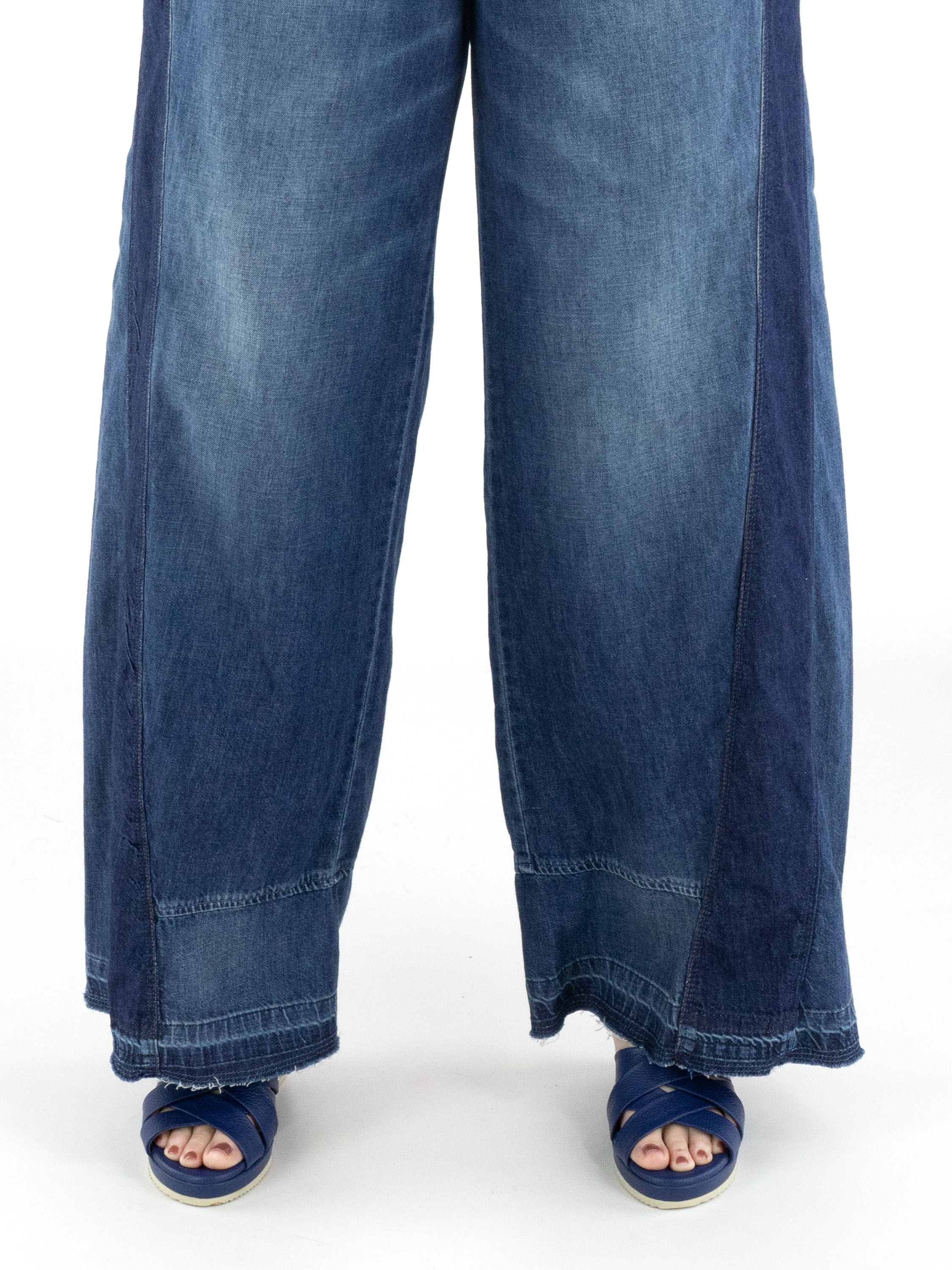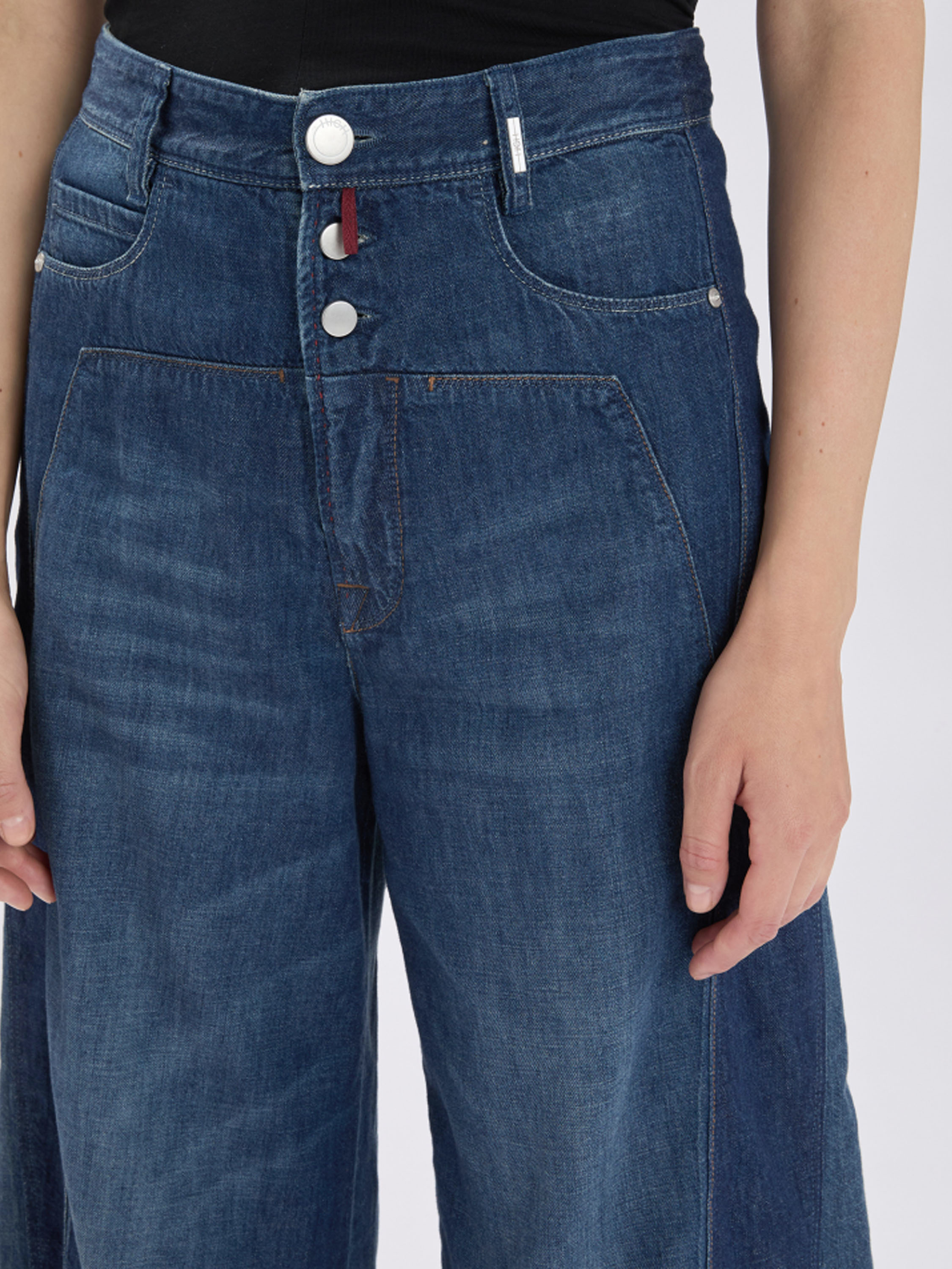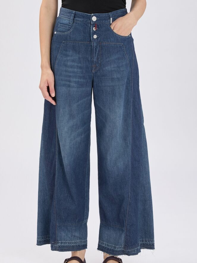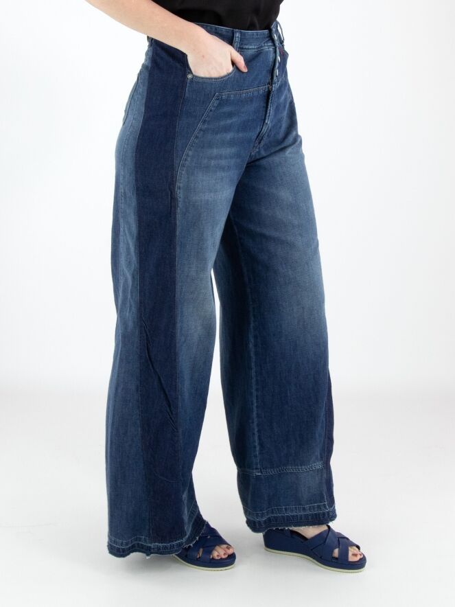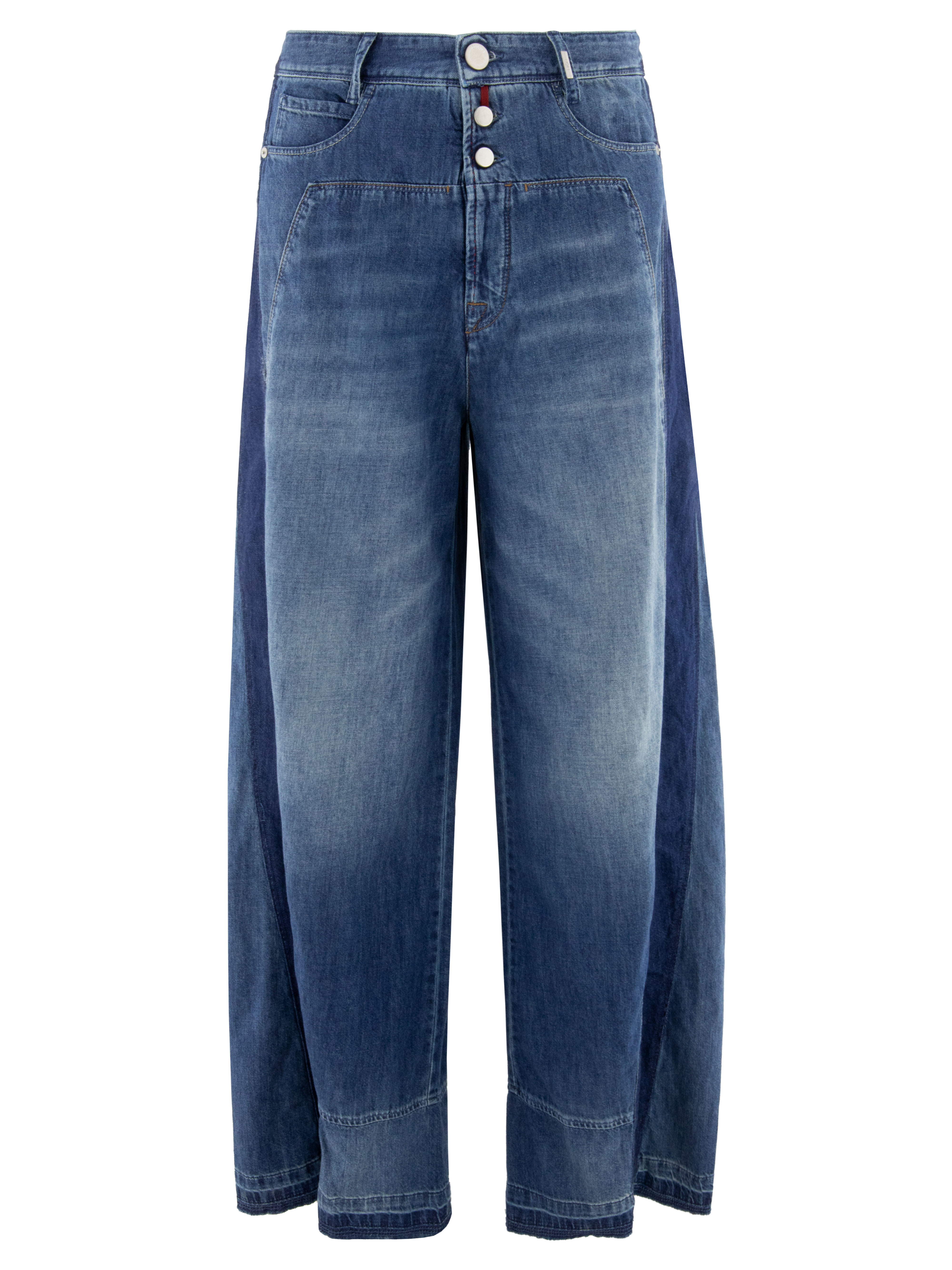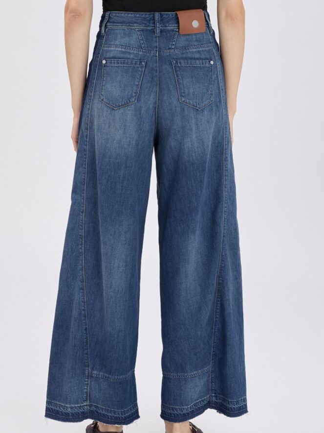 Eine weite Used-Jeans von High in einer helleren Jeansfarbe. Die Jeans ist im 5-Pocket-Stil gearbeitet. Entlang der Seiten verläuft ein breiter Streifen in einer dunkleren Jeansfarbe. Die Jeans hat einen Verschluss mit drei Knöpfen, darunter einen kurzen Reißverschluss. Diese Jeans kann bei 30 Grad gewaschen werden.