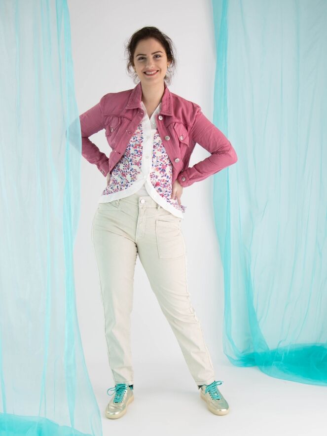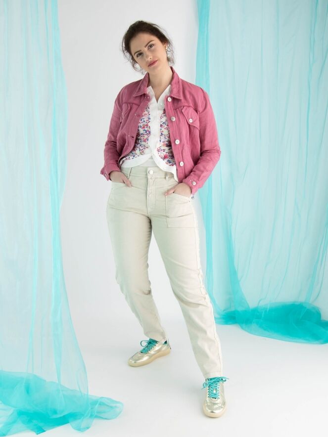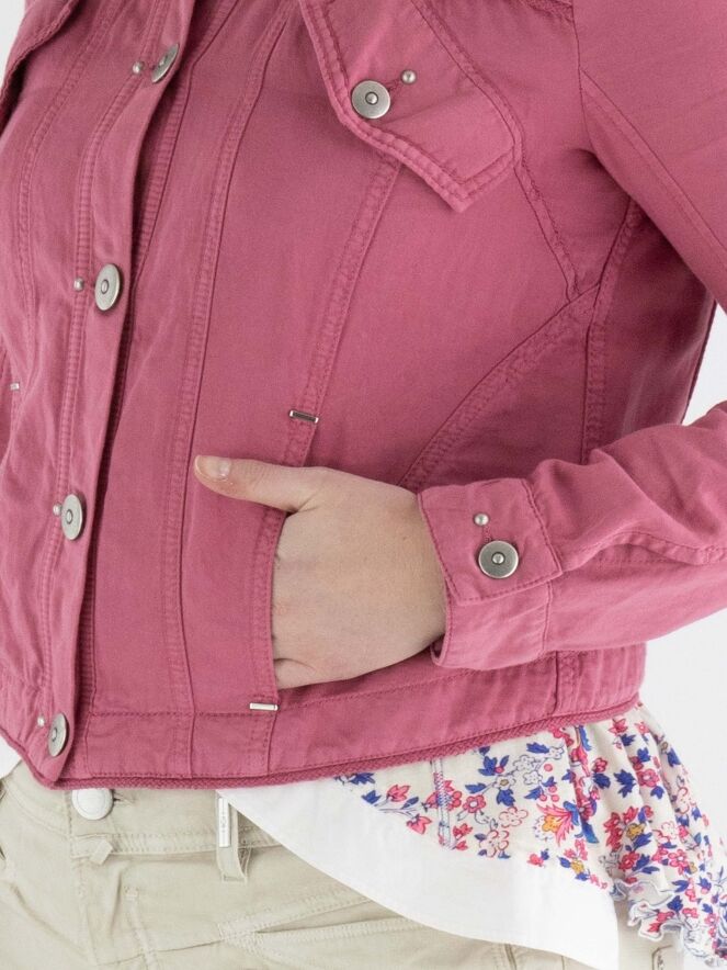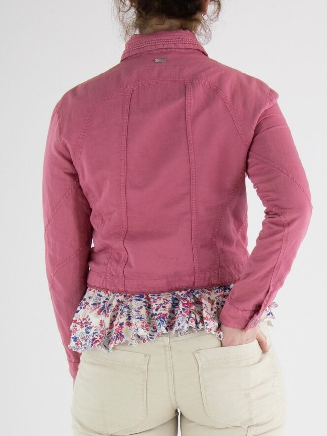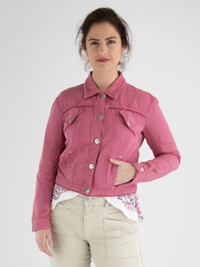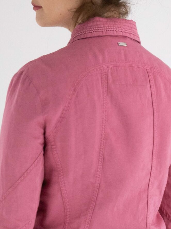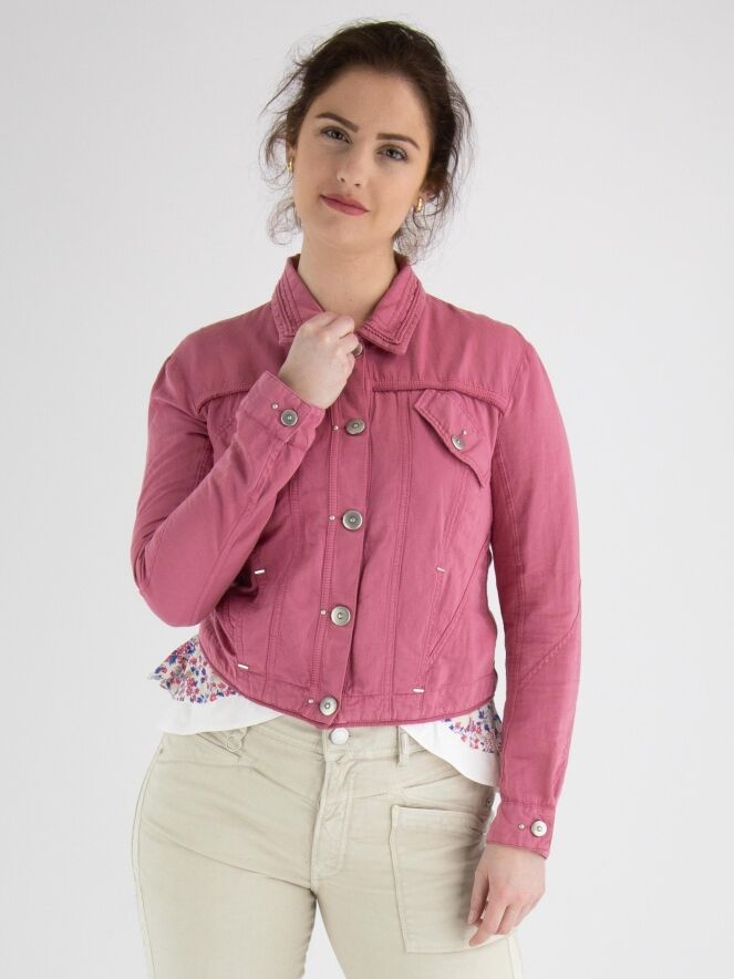 Ein kurzer Blazer von High in einer weichen korallenroten Farbe. Der Blazer hat einen 5-Knopf-Verschluss und auf Taillenhöhe aufgesetzte Taschen. Dieser Blazer kann von Hand gewaschen werden.