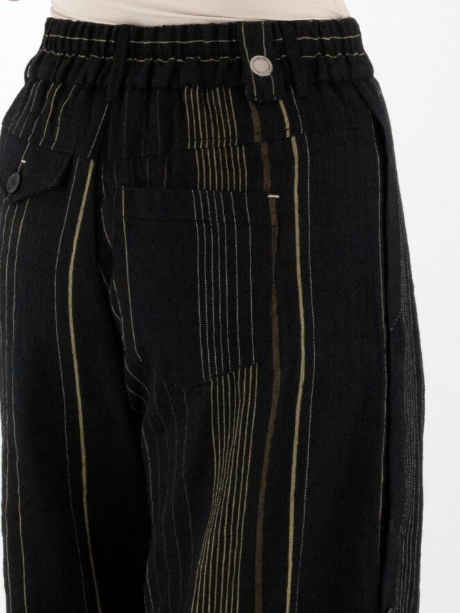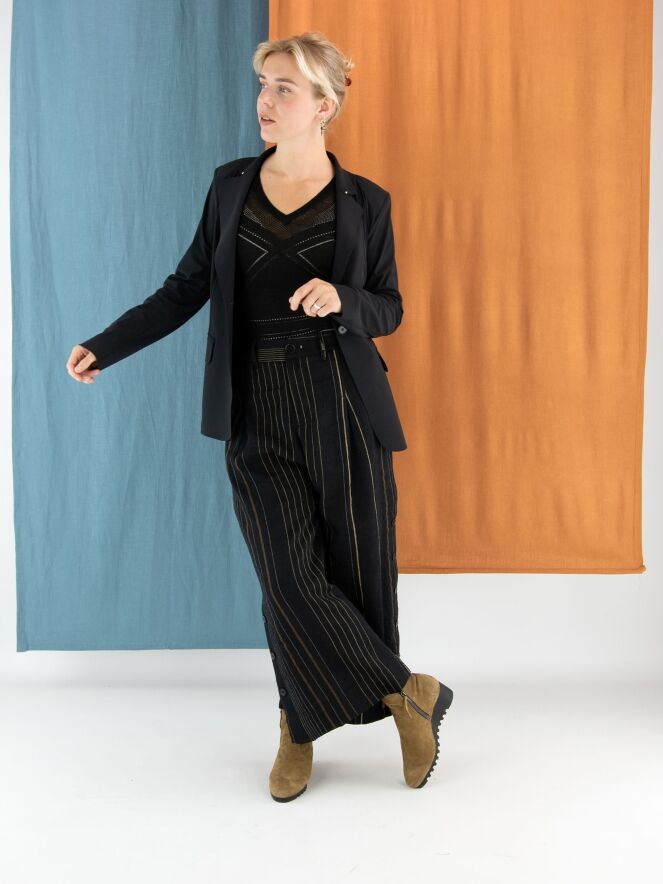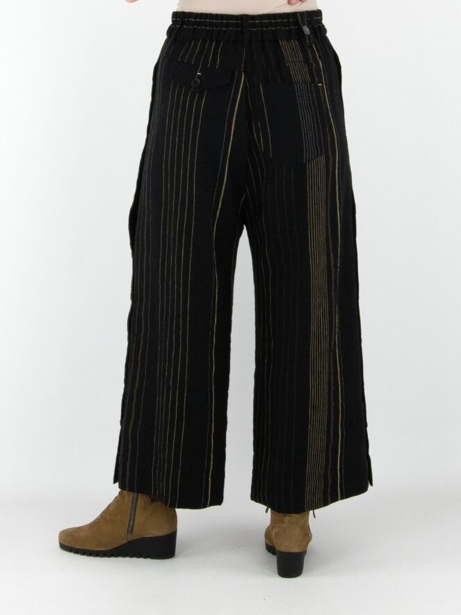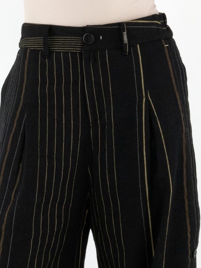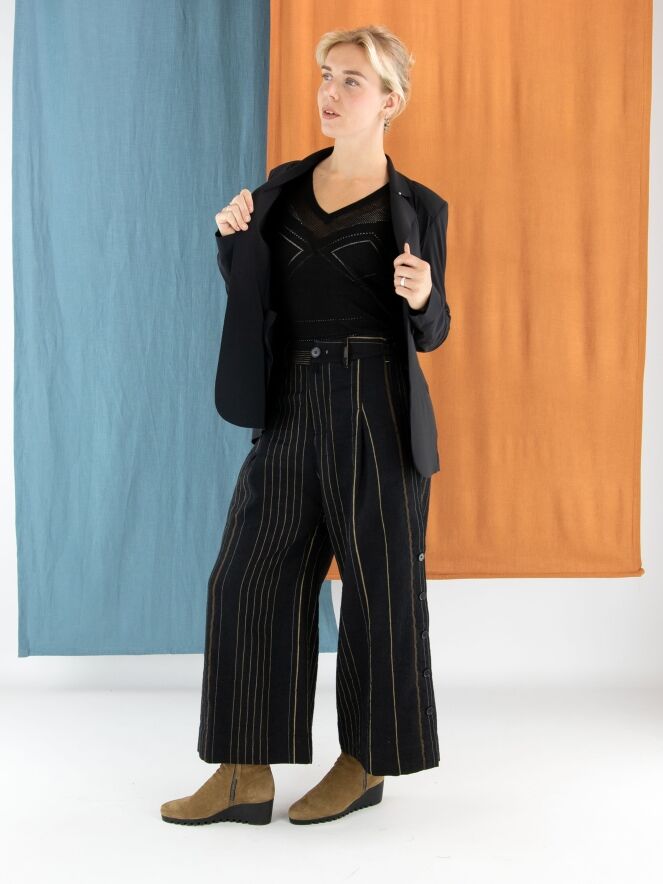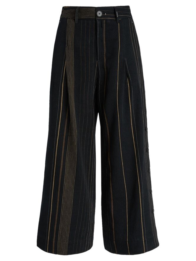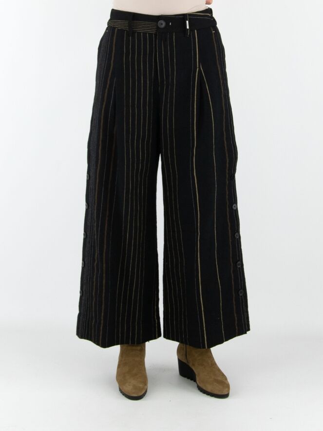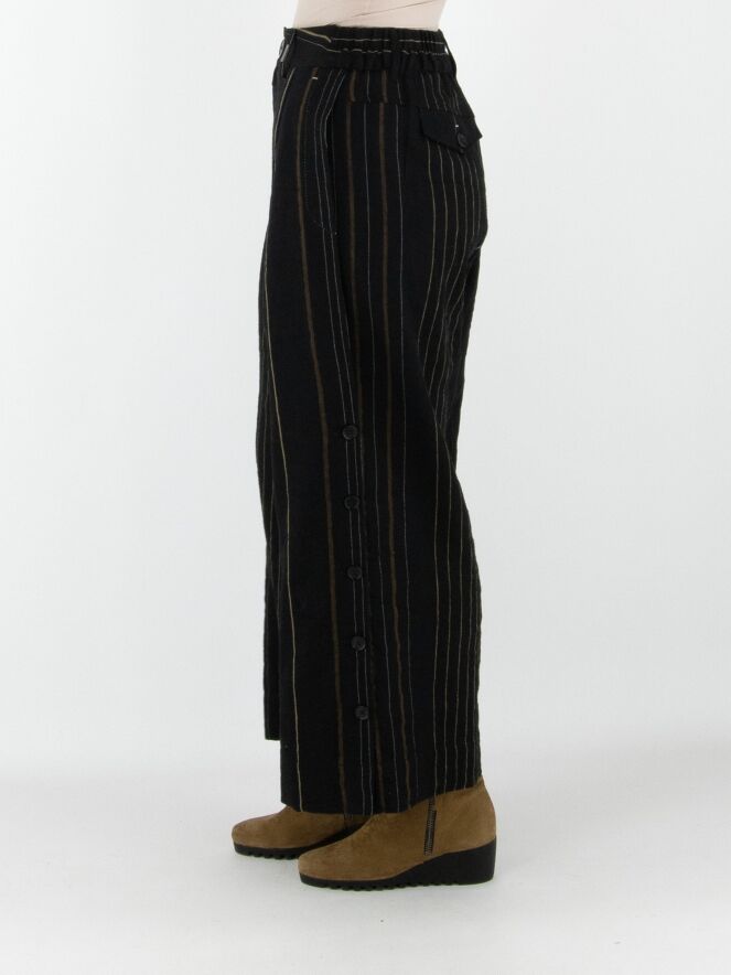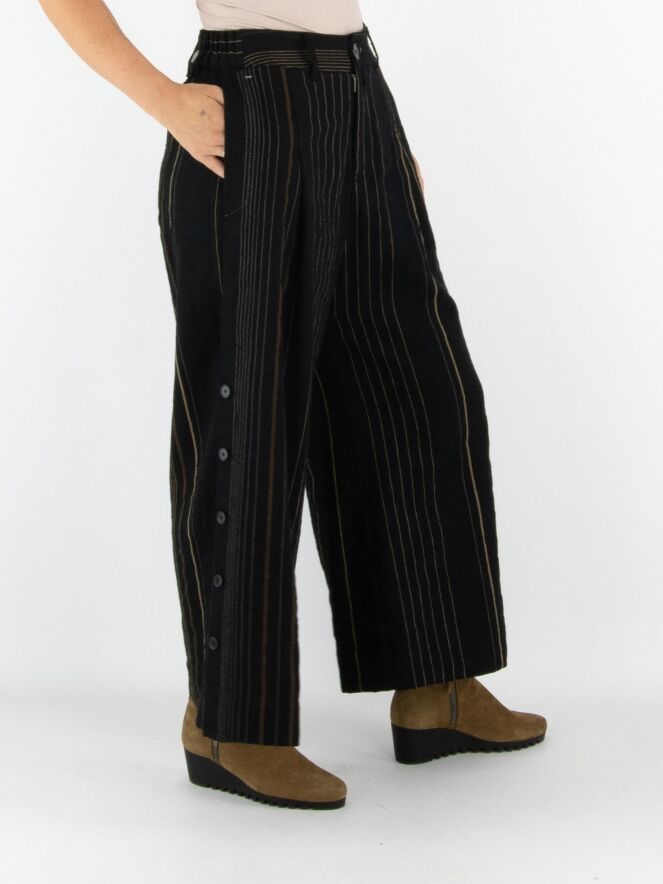 Weit geschnittene Hose von High mit einem Streifenmuster in Schwarz und Camel. An den Seiten ist der Stoff doppellagig gearbeitet, ab den Knien mit dekorativen Knöpfen versehen. Die Hose hat Eingrifftaschen und darf nicht gewaschen werden.