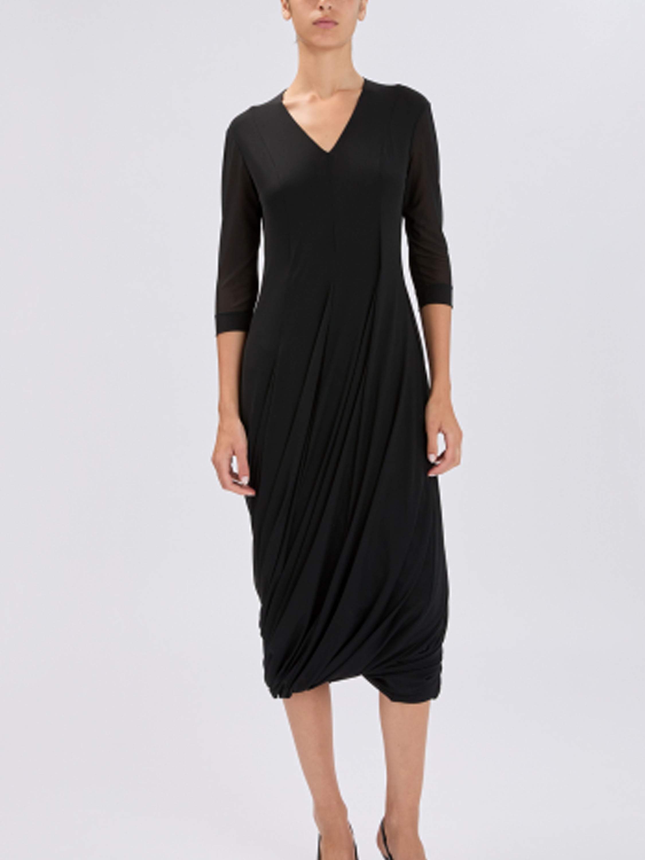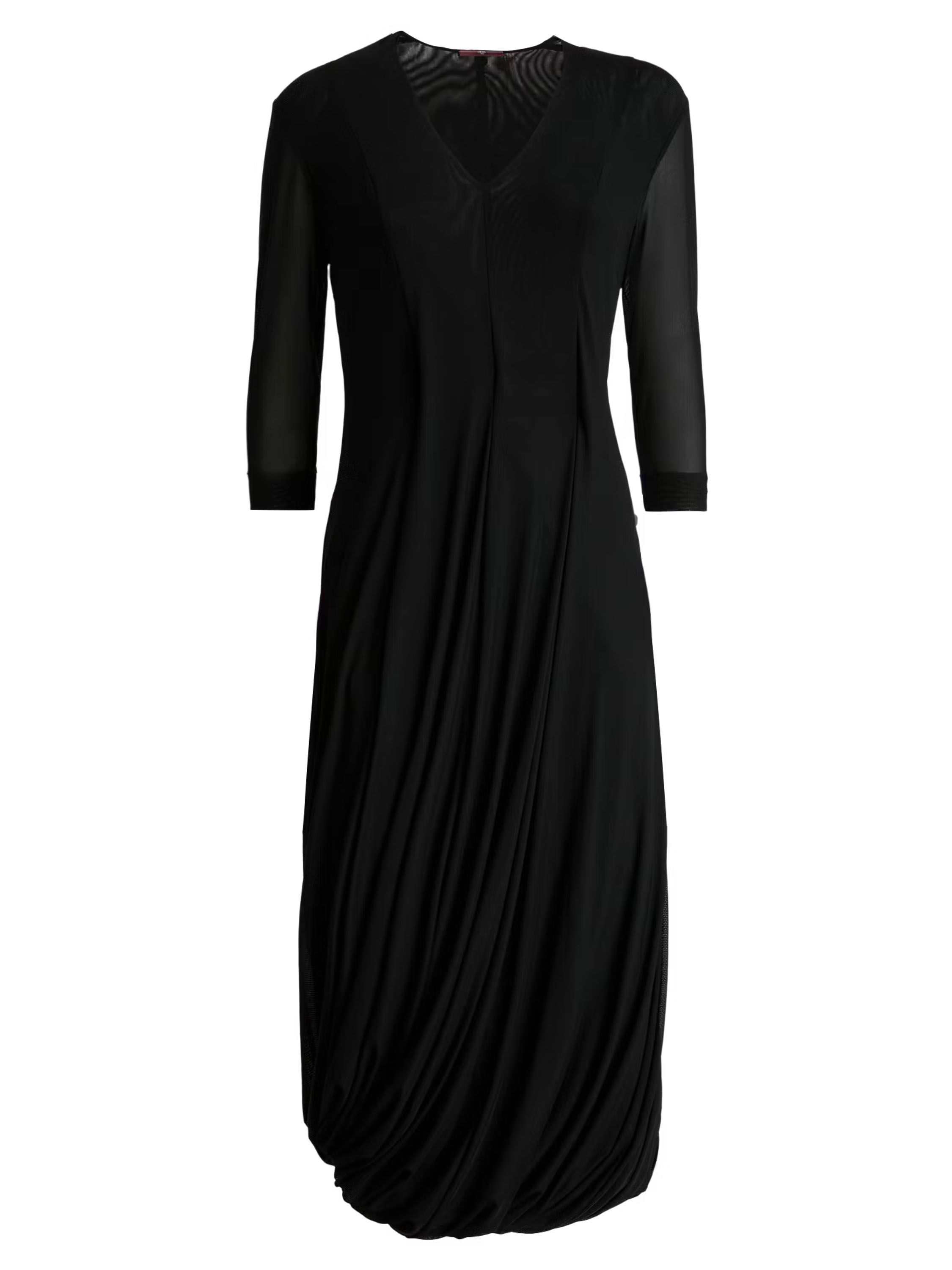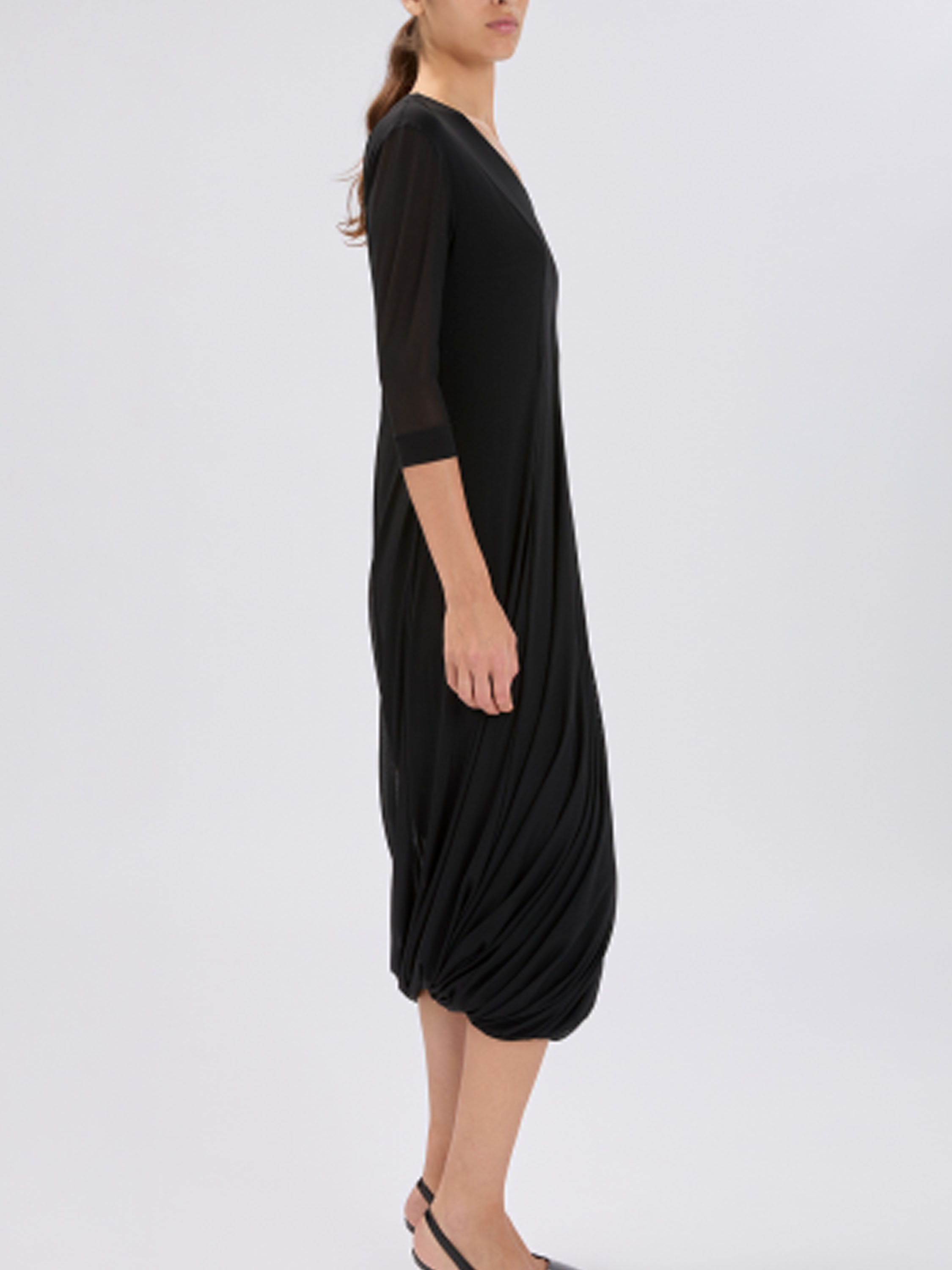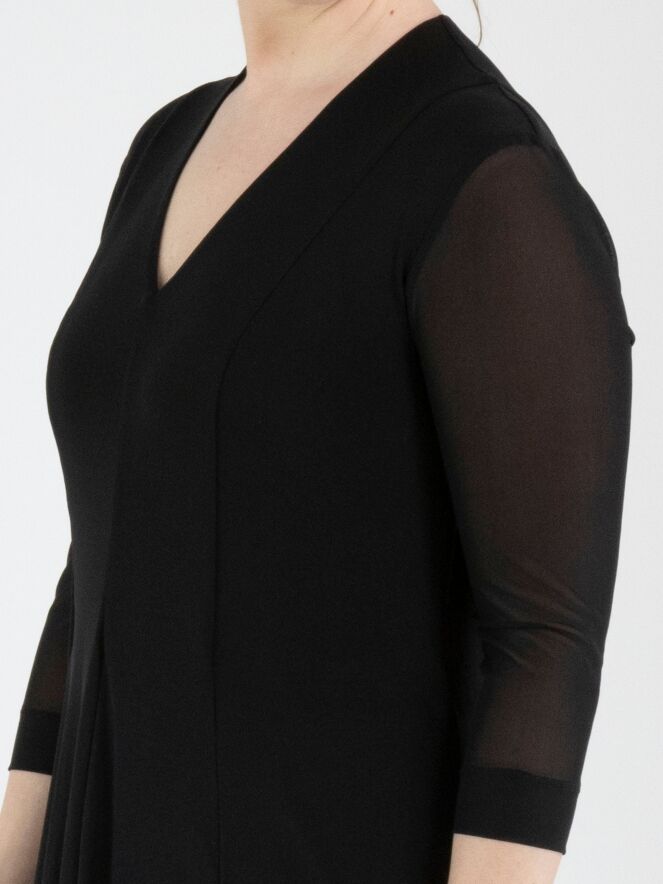 Ein Kleid von High Tech in Schwarz. Das Kleid ist aus einer doppelten, leicht transparenten Stofflage gefertigt. Die transparenten kurzen Ärmel reichen bis zum Ellbogen. Ab der Taille fällt das Kleid weit in A-Linie. Es hat einen V-Ausschnitt und kann per Hand gewaschen werden.