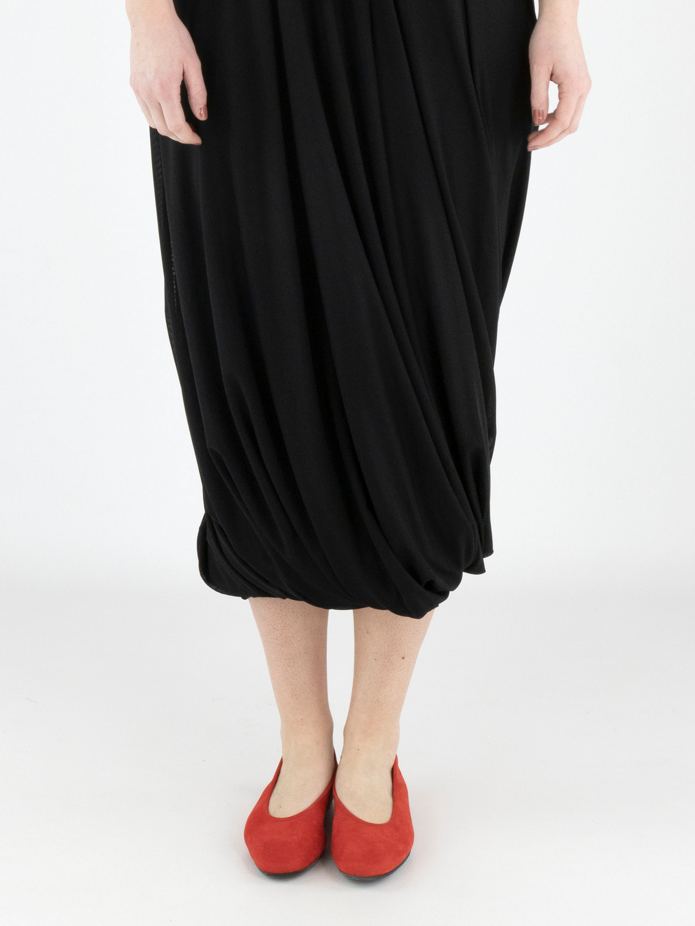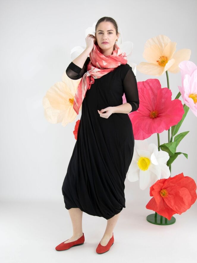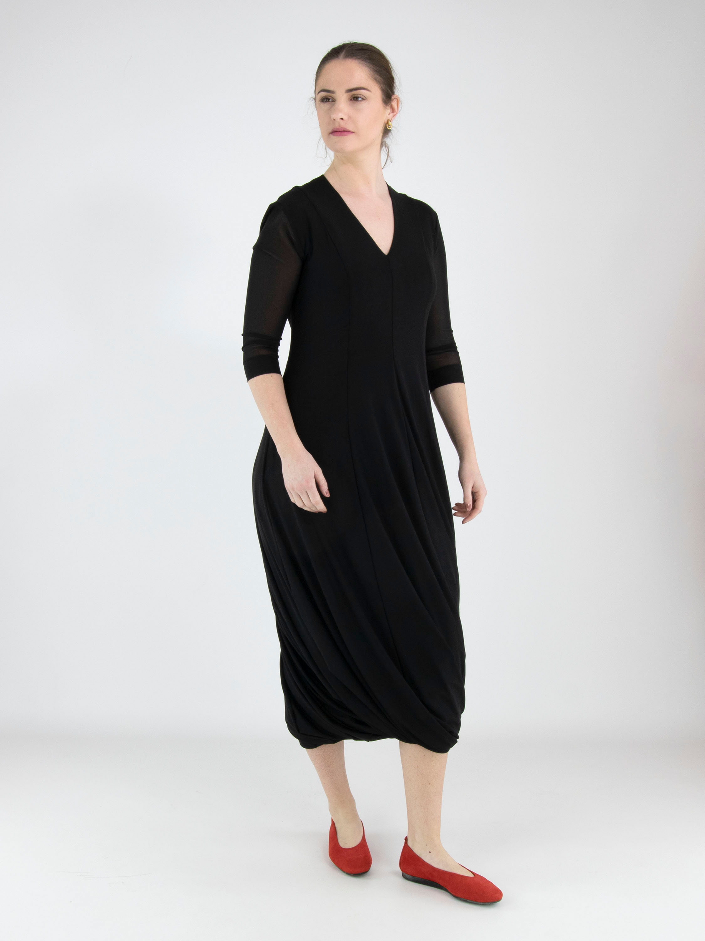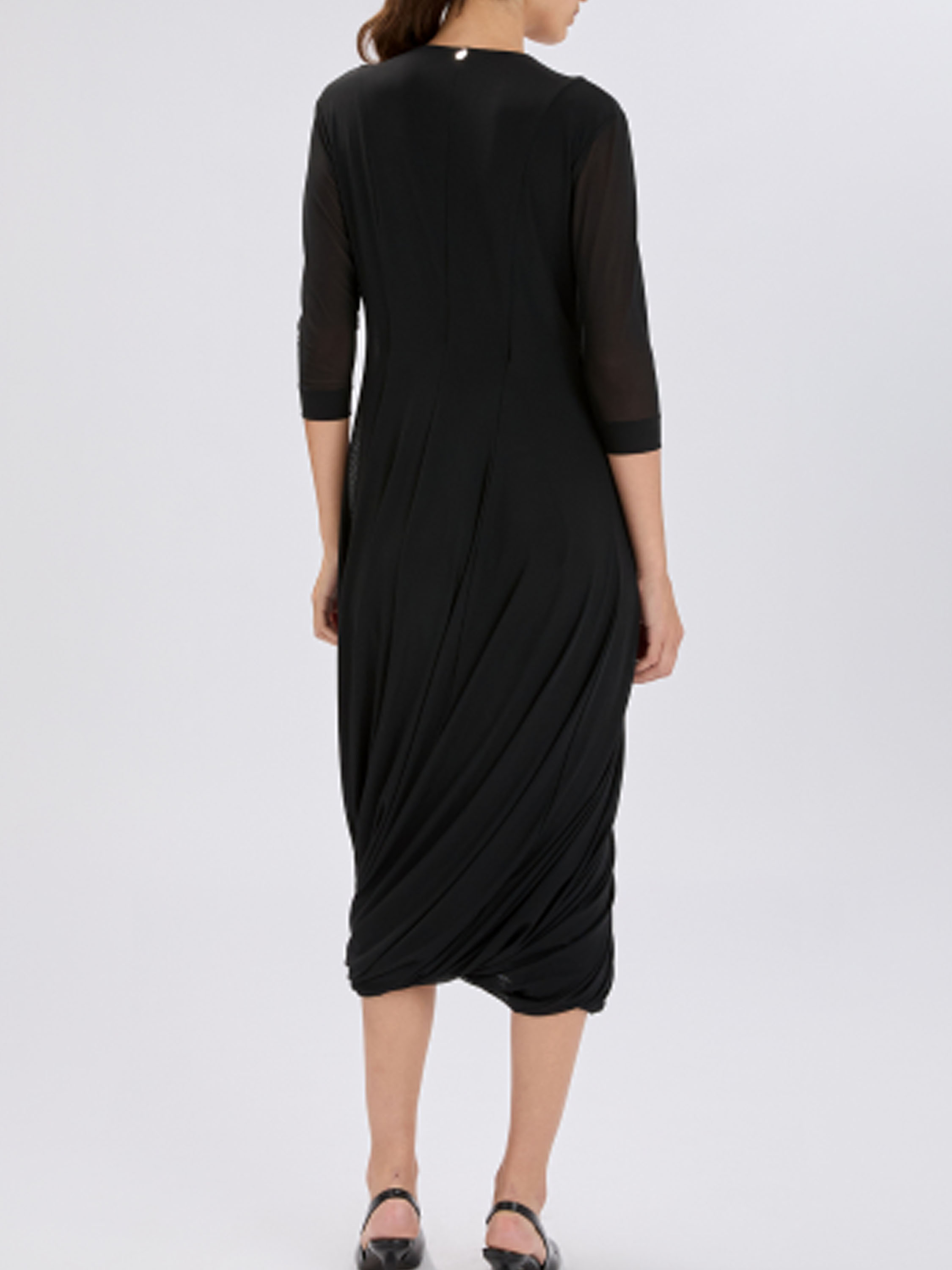 Ein Kleid von High Tech in Schwarz. Das Kleid ist aus einer doppelten, leicht transparenten Stofflage gefertigt. Die transparenten kurzen Ärmel reichen bis zum Ellbogen. Ab der Taille fällt das Kleid weit in A-Linie. Es hat einen V-Ausschnitt und kann per Hand gewaschen werden.