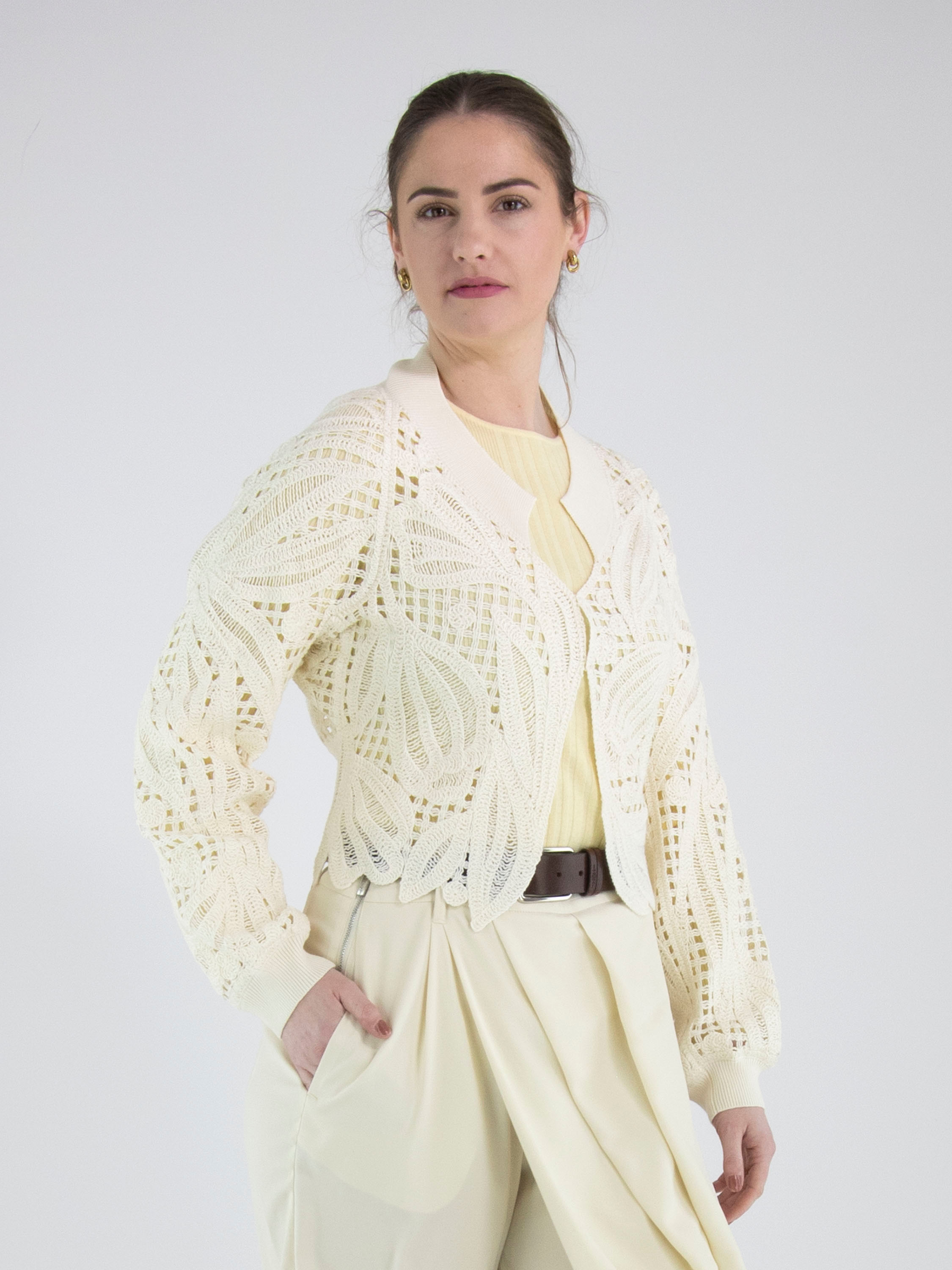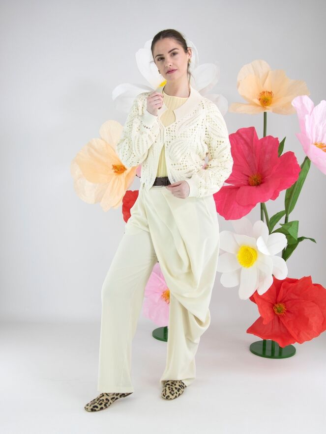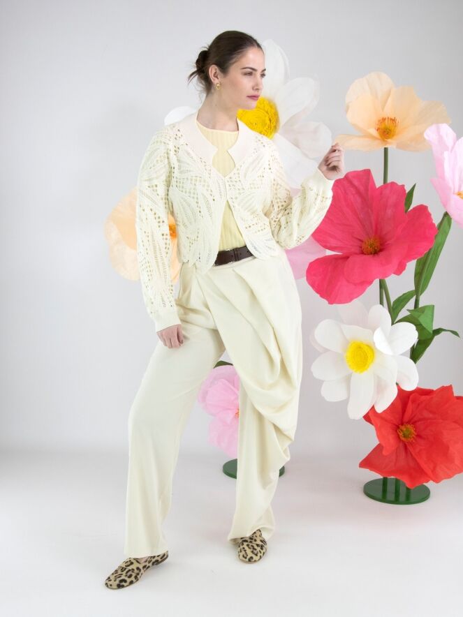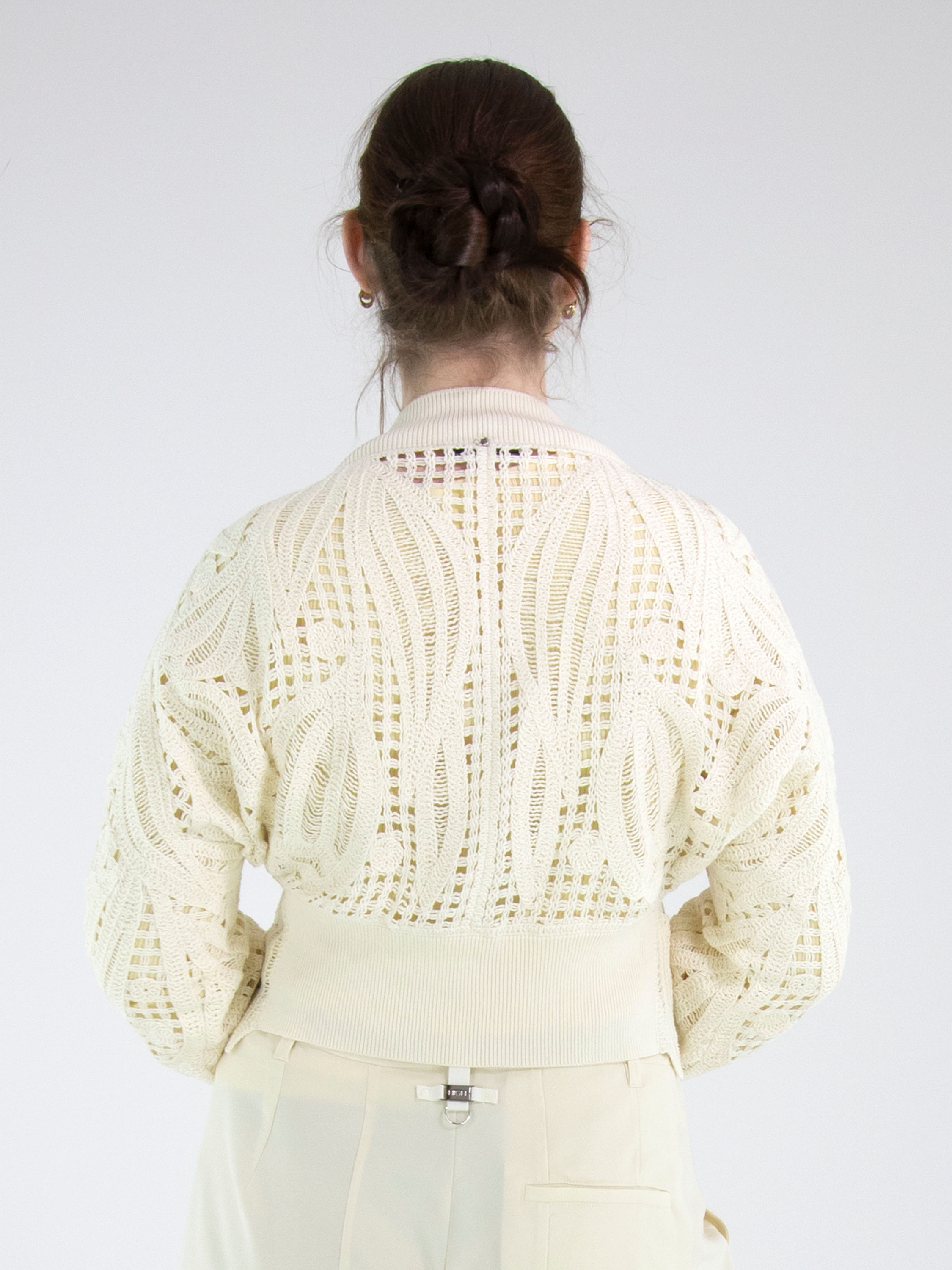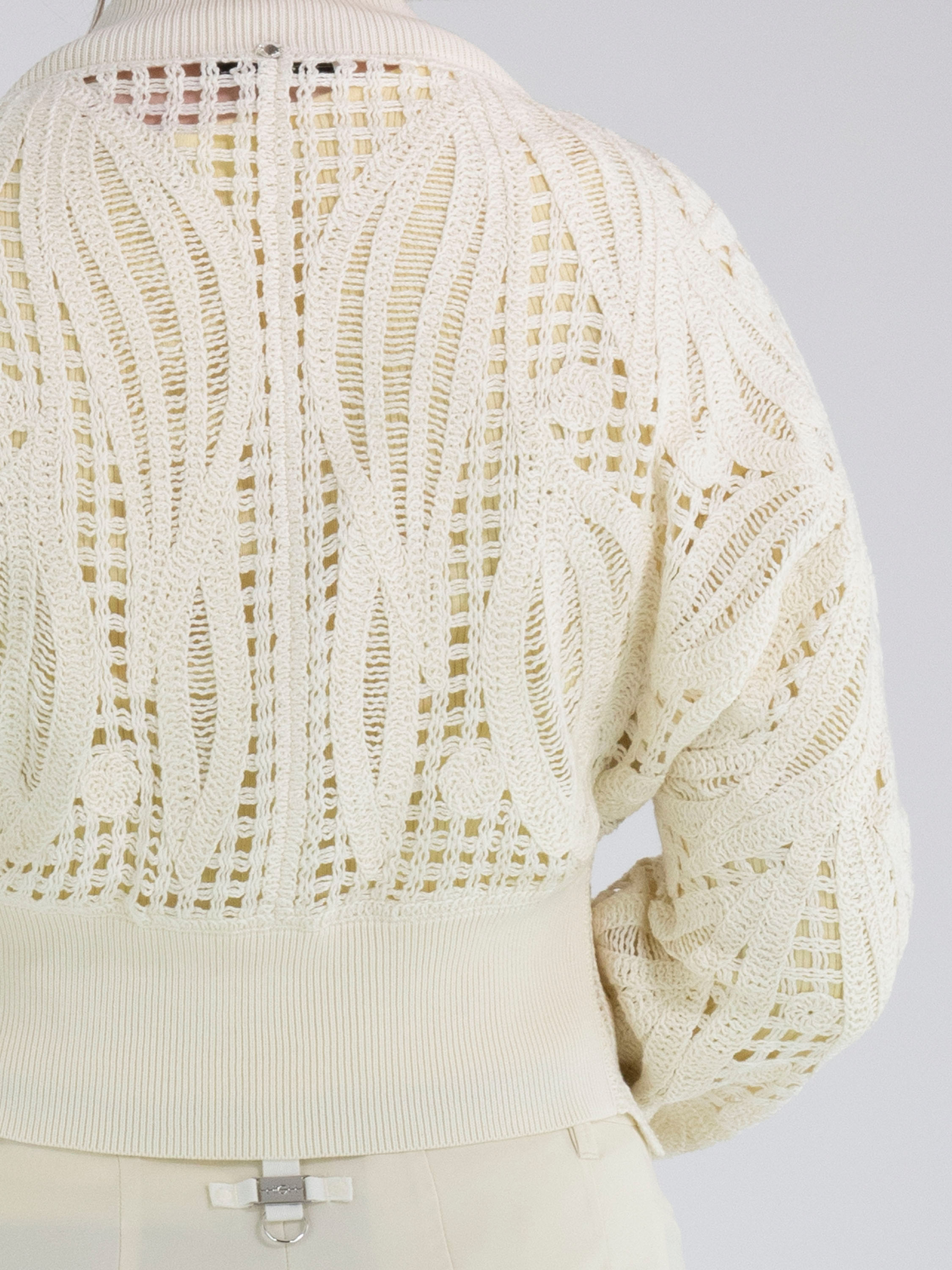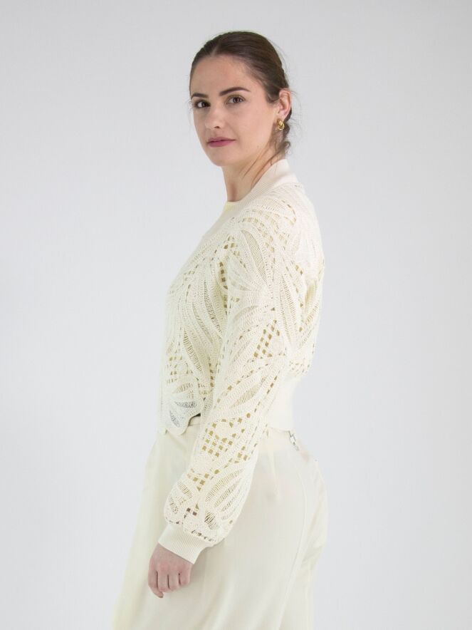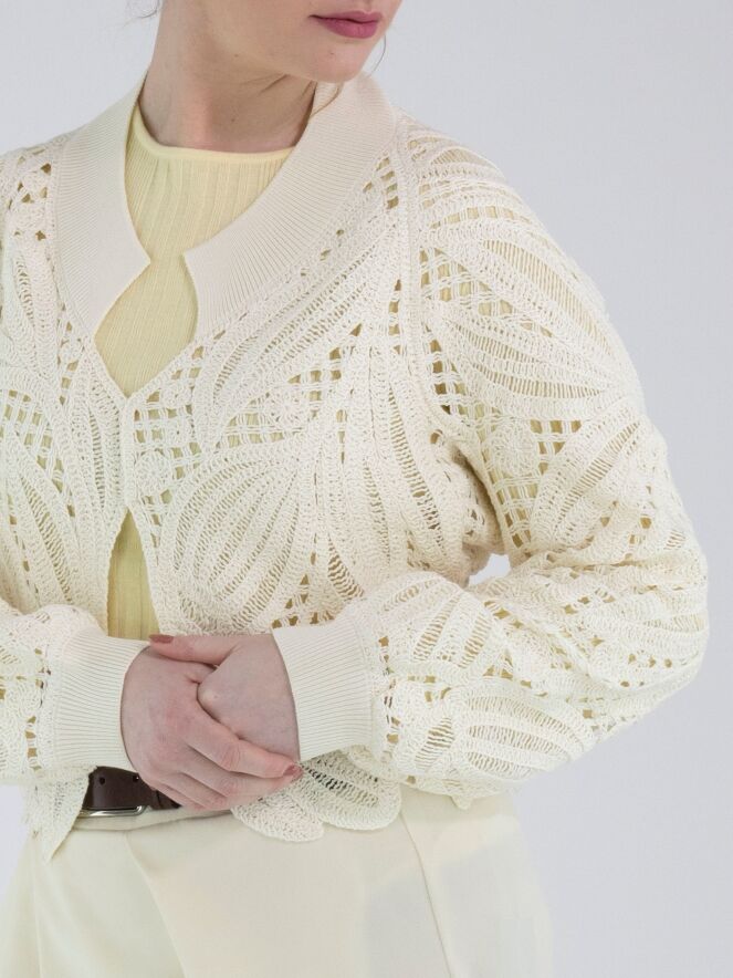 Eine kurze, offen gehäkelte Strickjacke von High in Cremeweiß. Die Strickjacke hat einen Verschluss mit zwei kleinen verdeckten Knöpfen und ist mit Fledermausärmeln gearbeitet. Entlang des Halsausschnitts verläuft ein breites, fein geripptes Strickbündchen, das sich auch am rückwärtigen Saum und an den Ärmelabschlüssen wiederfindet. Diese Strickjacke kann von Hand gewaschen werden.