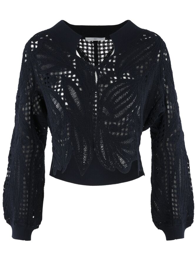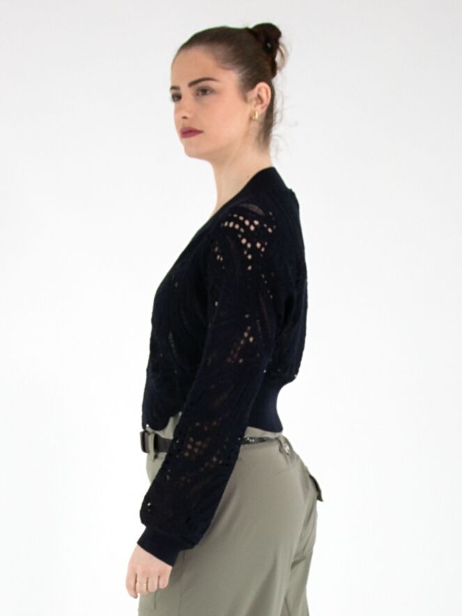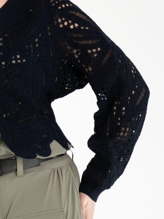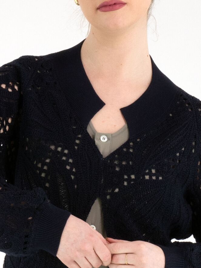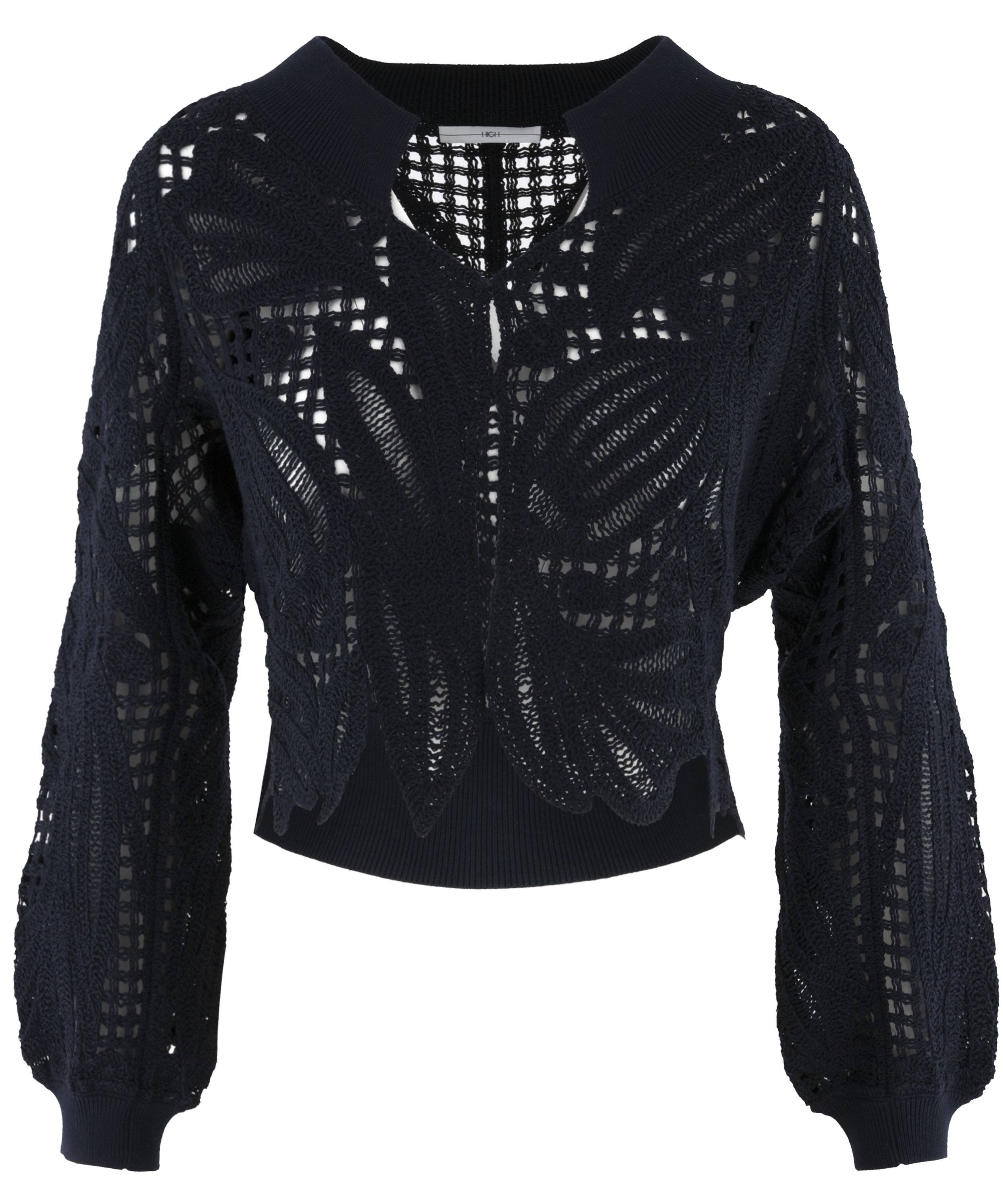 Eine kurze, offen gehäkelte Strickjacke von High in Marineblau. Die Strickjacke hat einen Verschluss mit zwei kleinen verdeckten Knöpfen und Fledermausärmel. Entlang des Halsausschnitts verläuft ein breiter, fein gerippter Strickbund. Dieser Bund ist auch am unteren Rückenteil sowie an den Ärmelabschlüssen verarbeitet. Diese Strickjacke kann von Hand gewaschen werden.