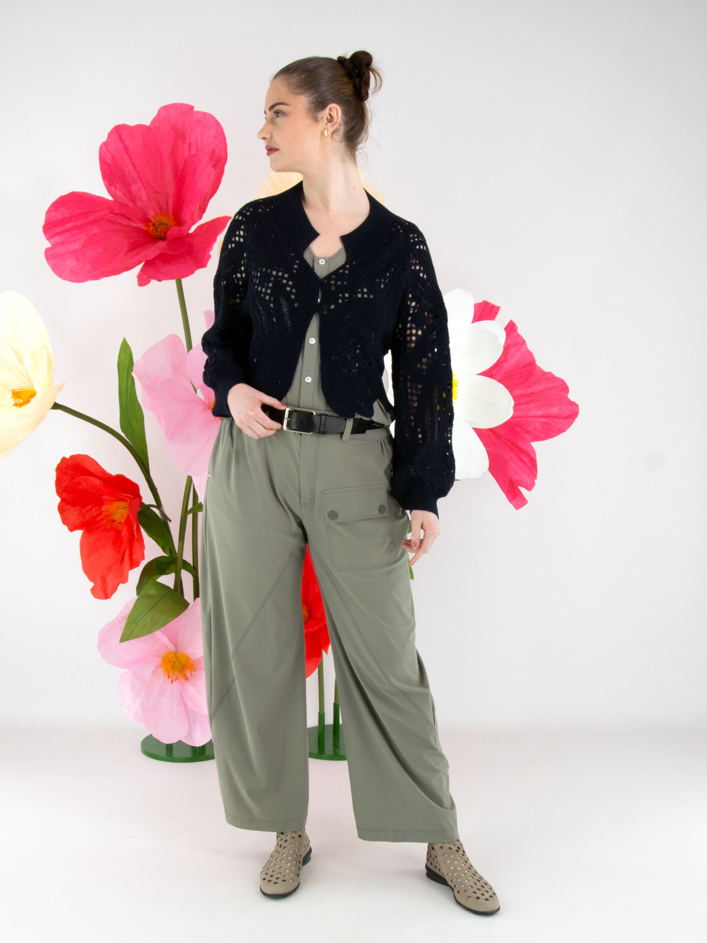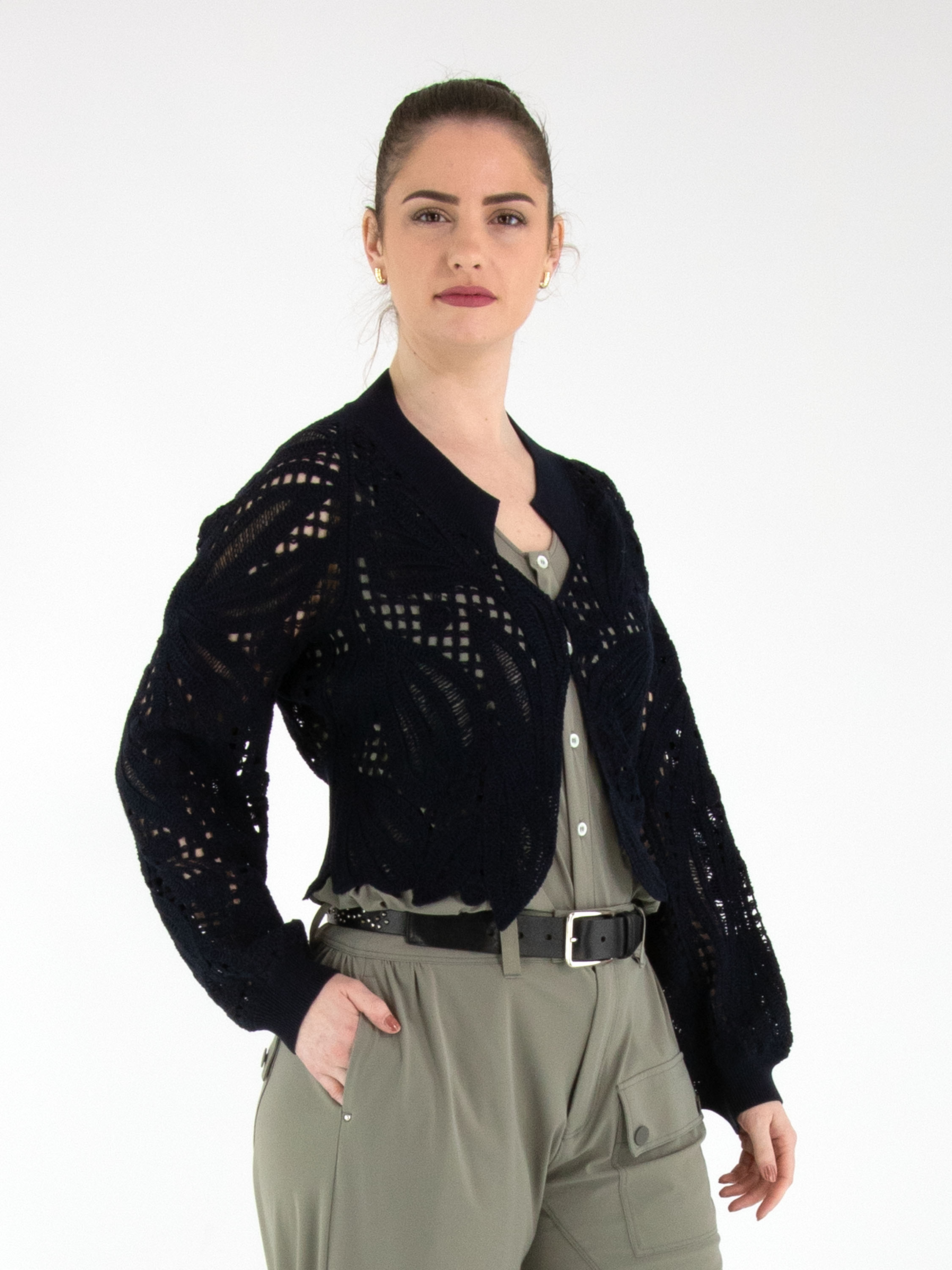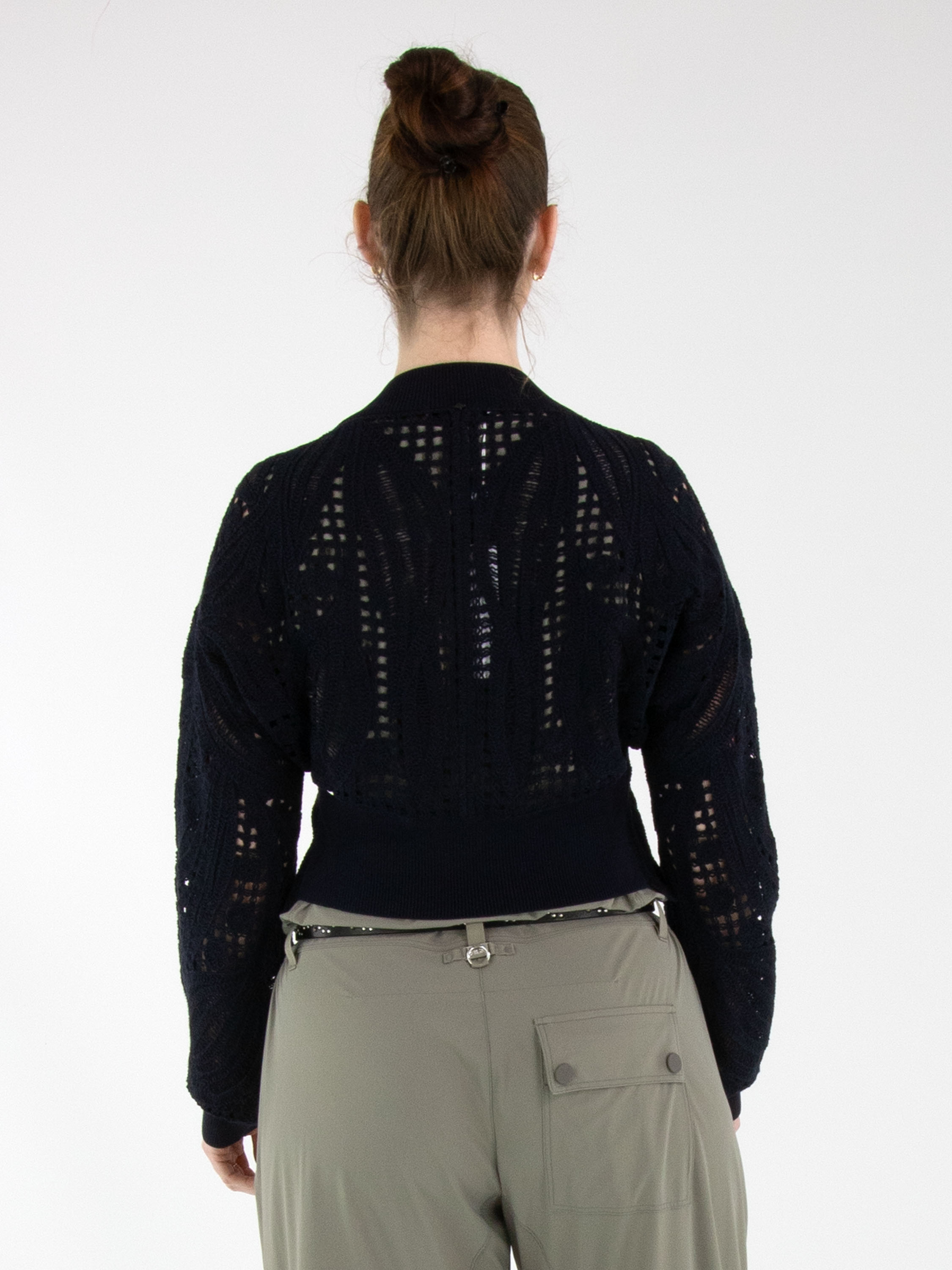 Eine kurze, offen gehäkelte Strickjacke von High in Marineblau. Die Strickjacke hat einen Verschluss mit zwei kleinen verdeckten Knöpfen und Fledermausärmel. Entlang des Halsausschnitts verläuft ein breiter, fein gerippter Strickbund. Dieser Bund ist auch am unteren Rückenteil sowie an den Ärmelabschlüssen verarbeitet. Diese Strickjacke kann von Hand gewaschen werden.